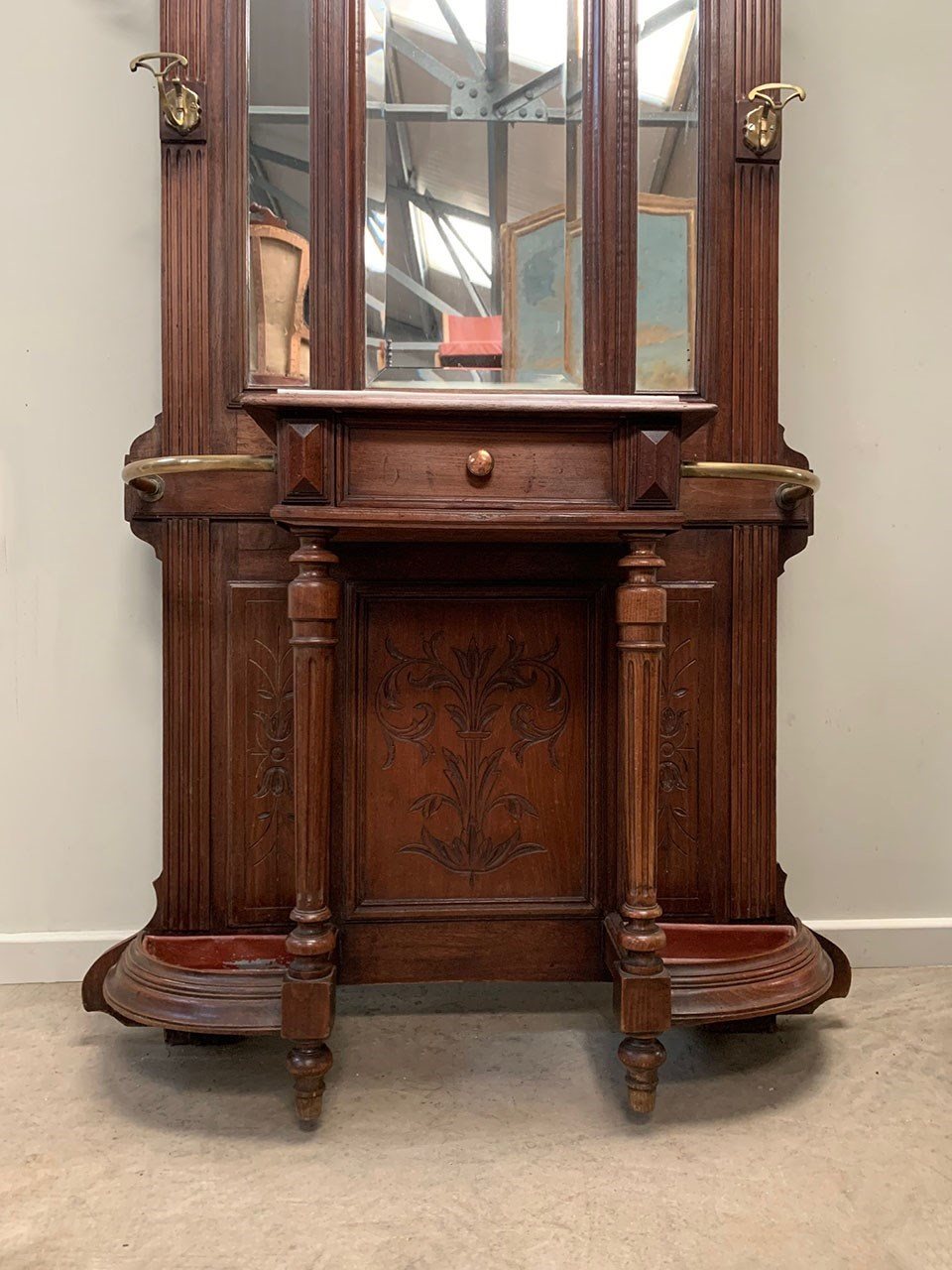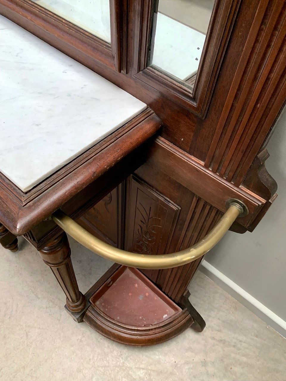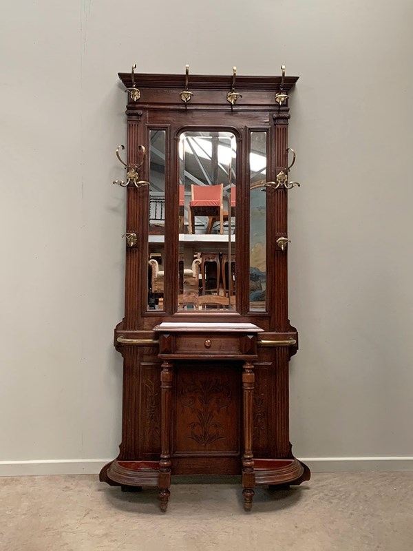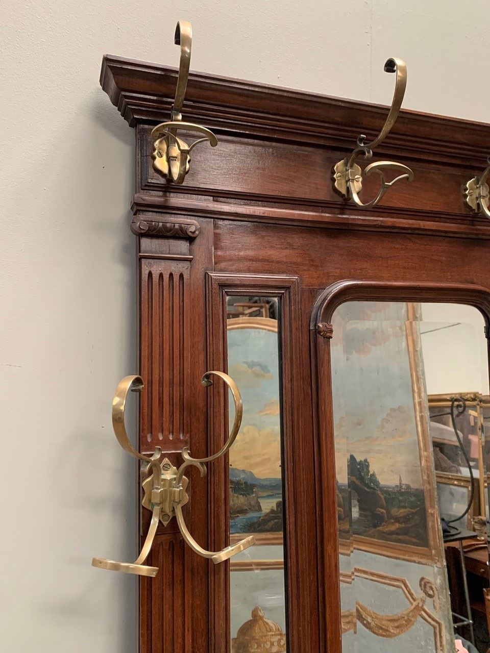 Grand scale 19th century mahogany hall stand with a mirrored back and 8 ornate brass hooks.