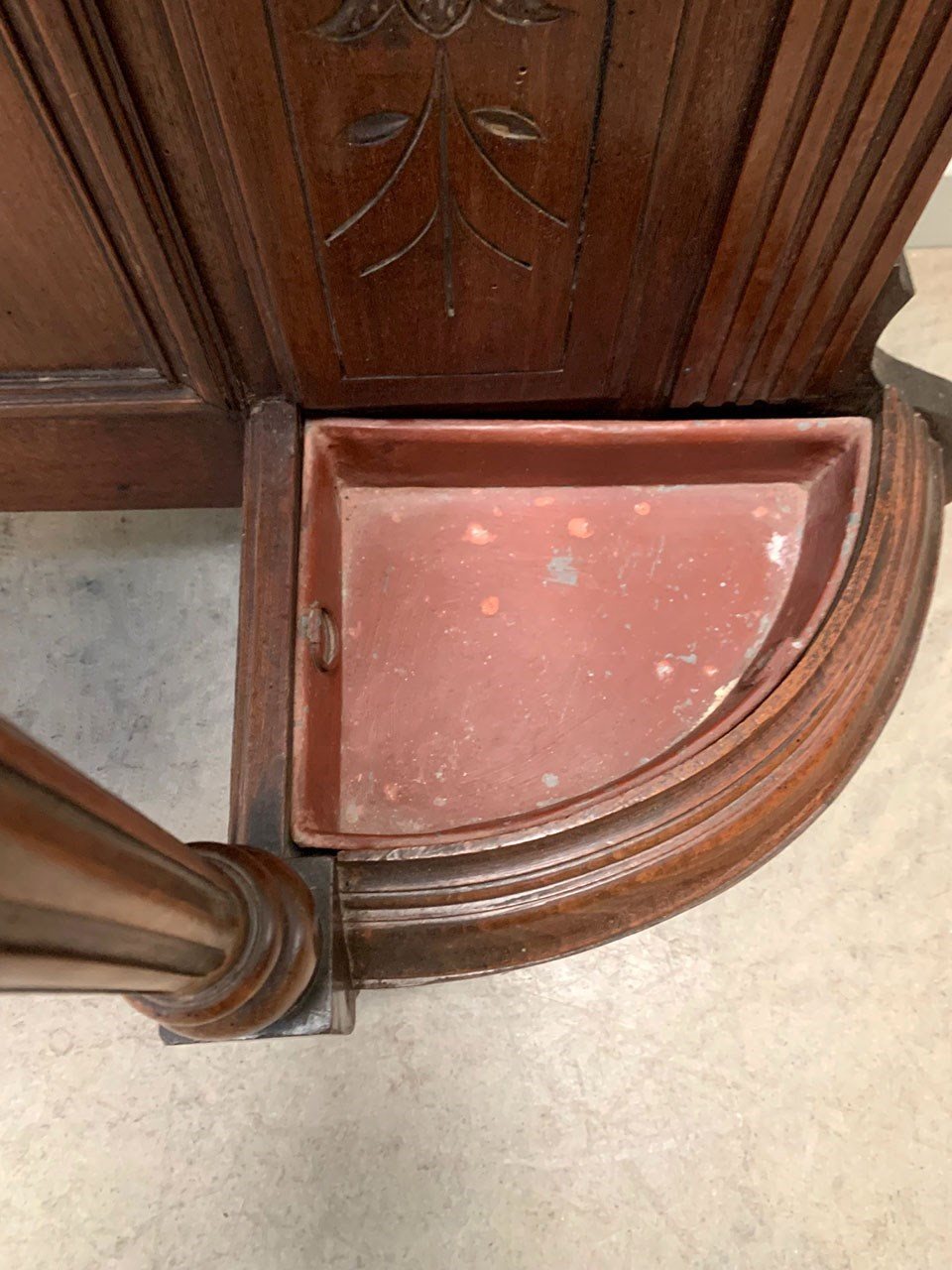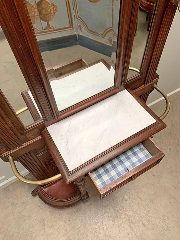 It includes a small white marble top table with a drawer at the front in between two umbrella stands with brass holders and red metal drip trays.
