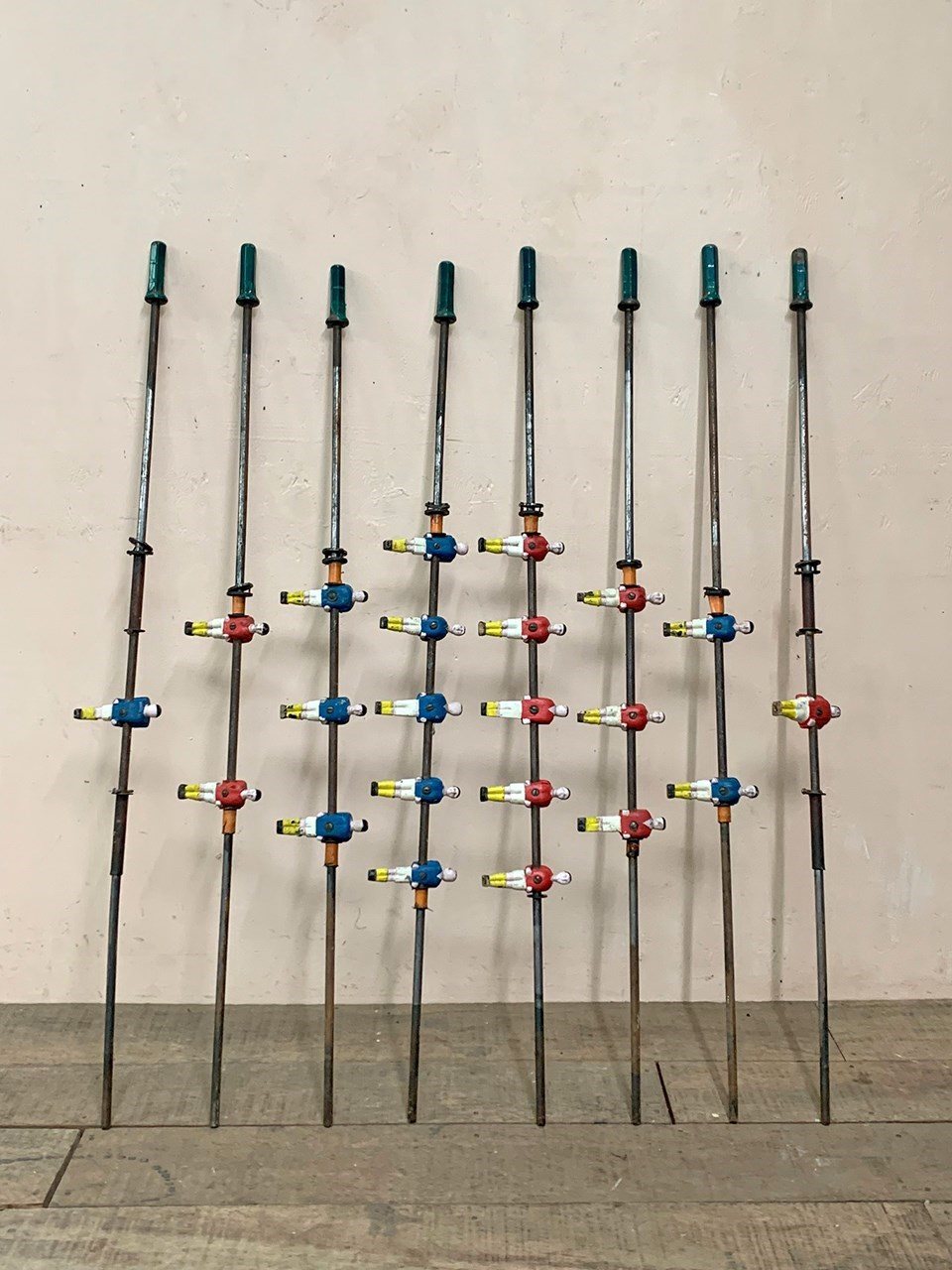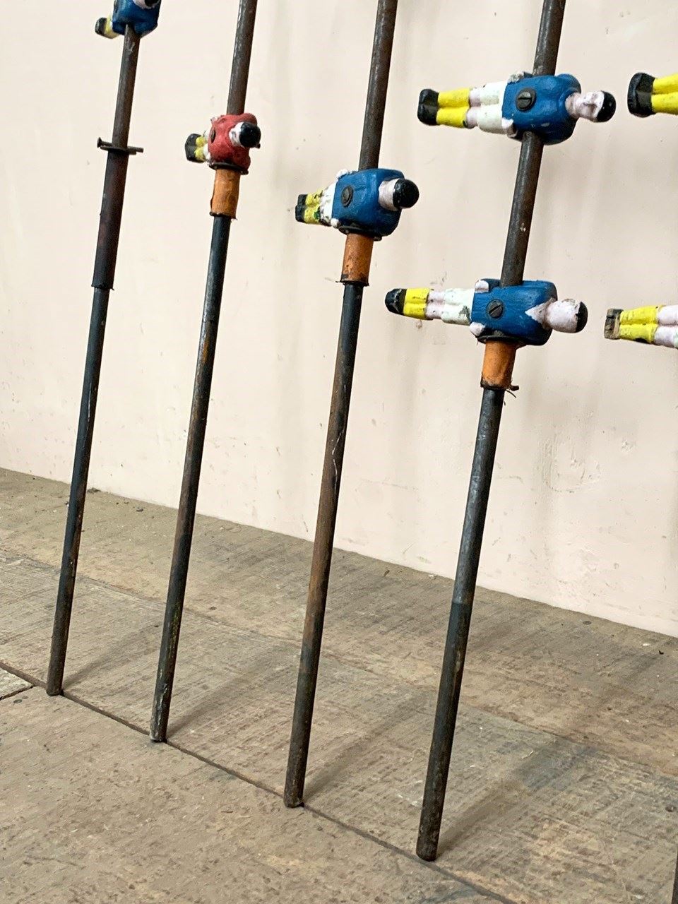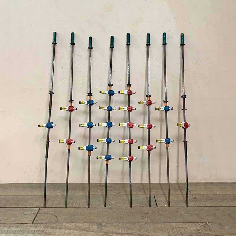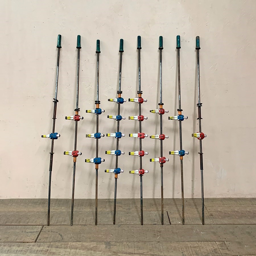 Set of 8 1930's metal table football rods with players in red and blue shirts.
