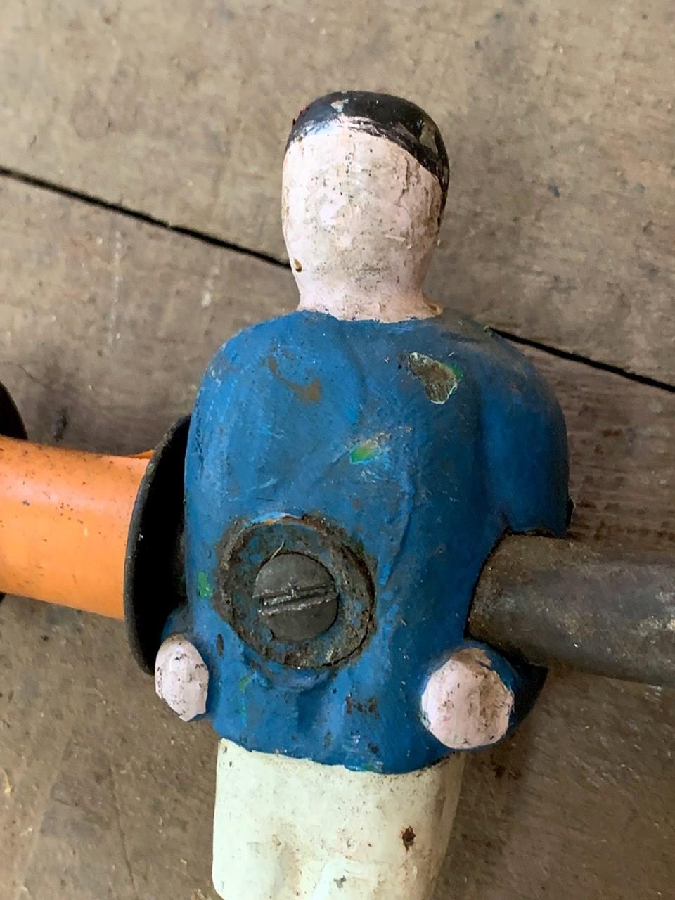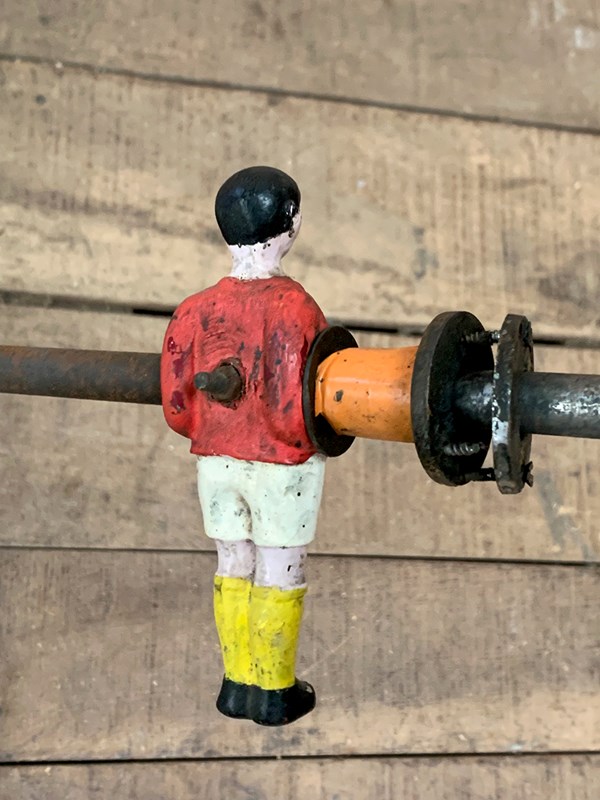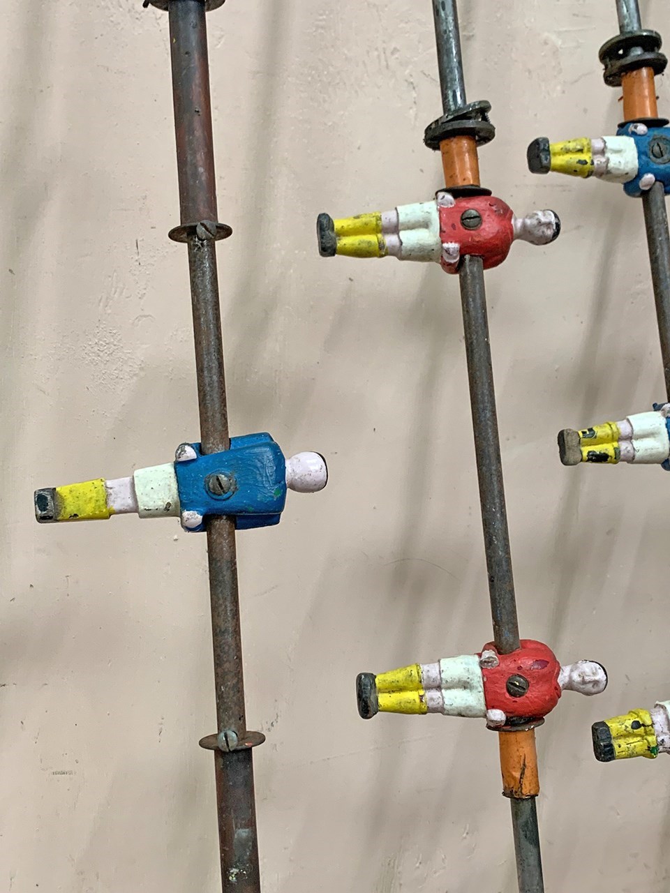 Set of 8 1930's metal table football rods with players in red and blue shirts.