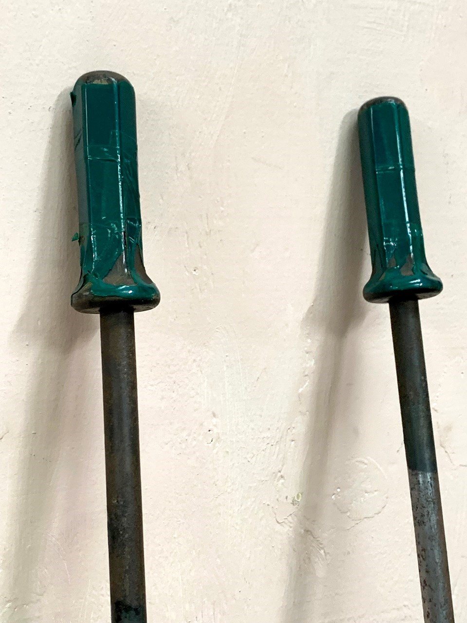 Each has green plastic covered handles and are fairly heavy.