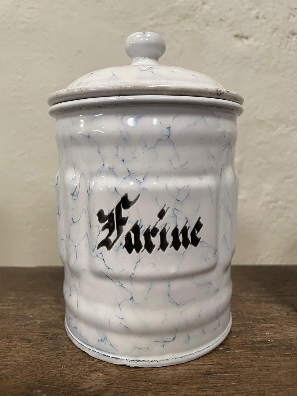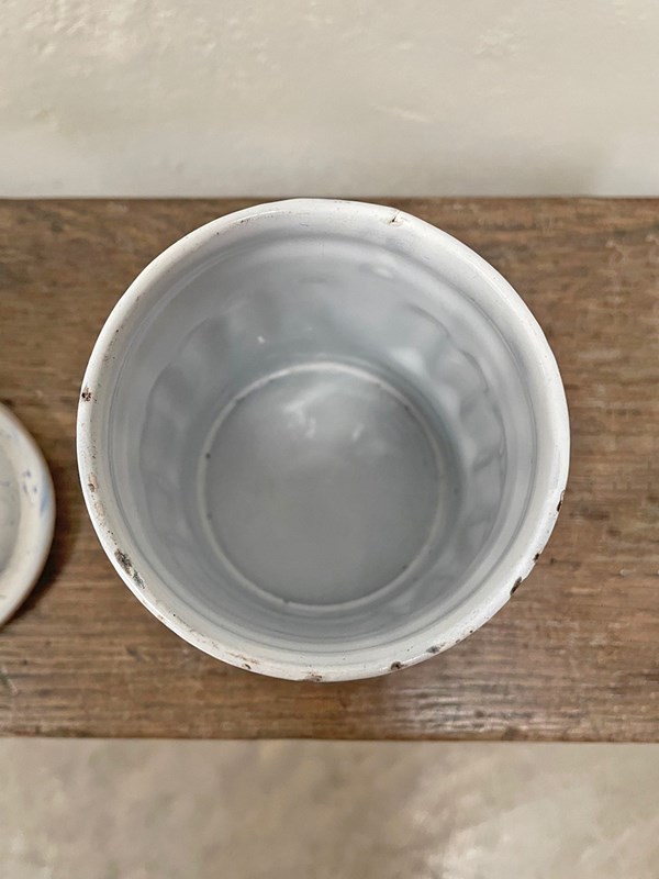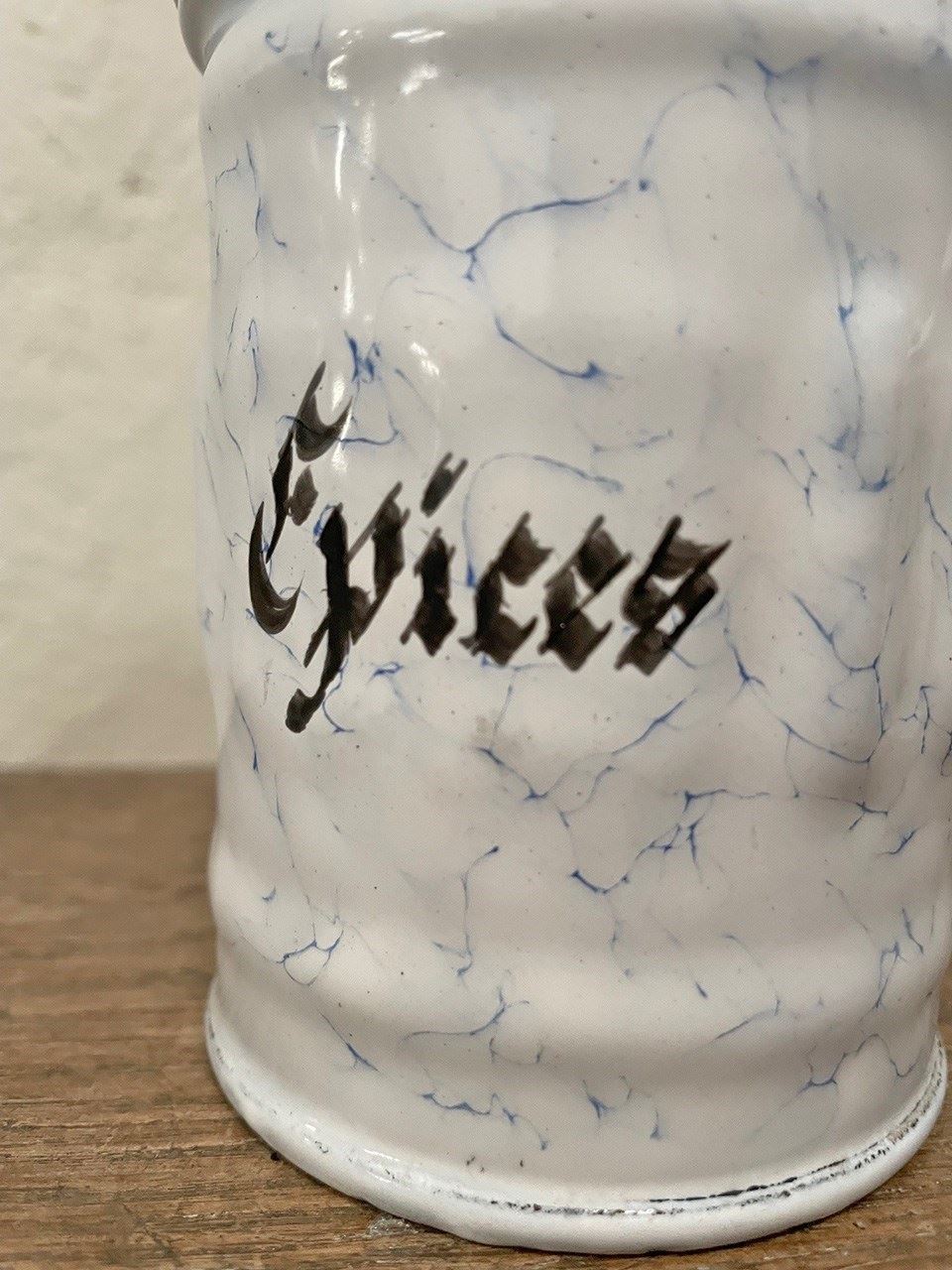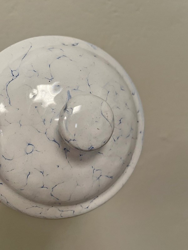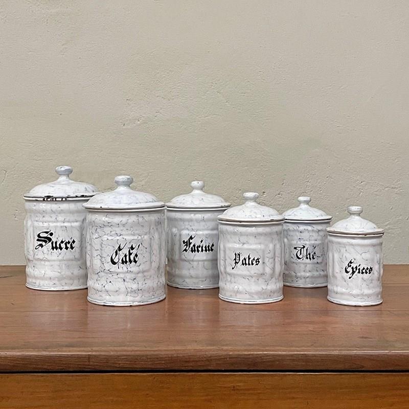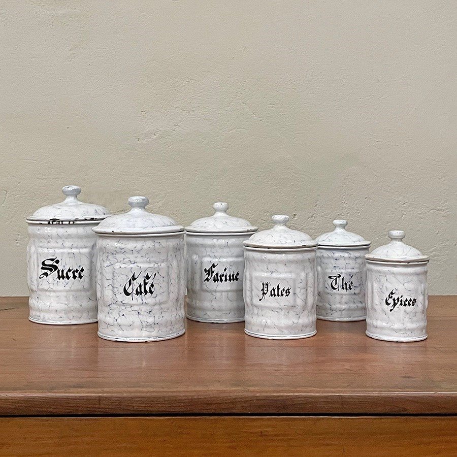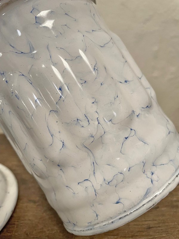 A white and blue veined enamel set of 6 cafe pots. In vintage condition but still very usable.