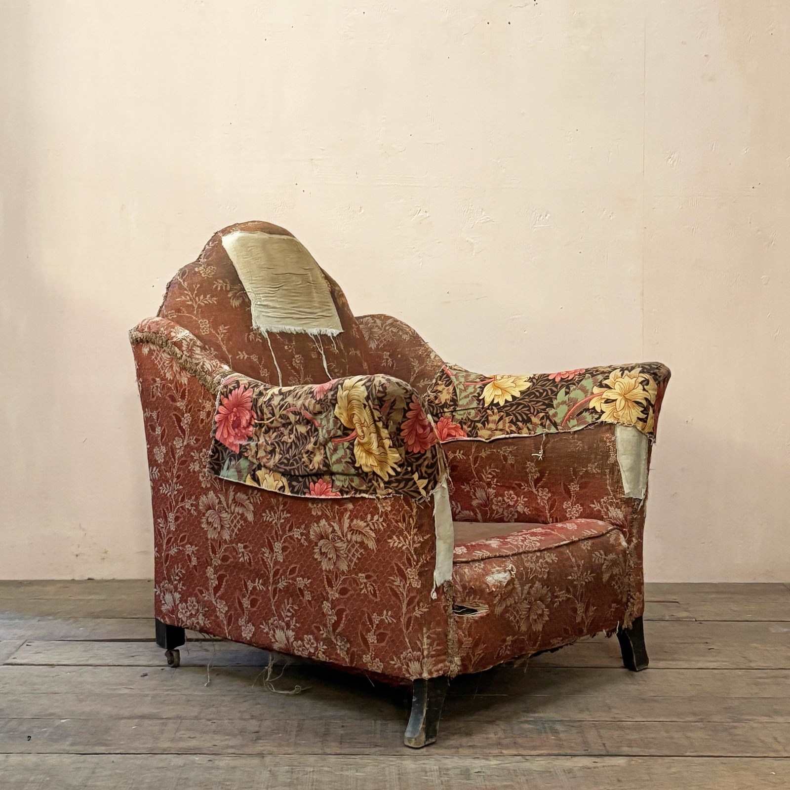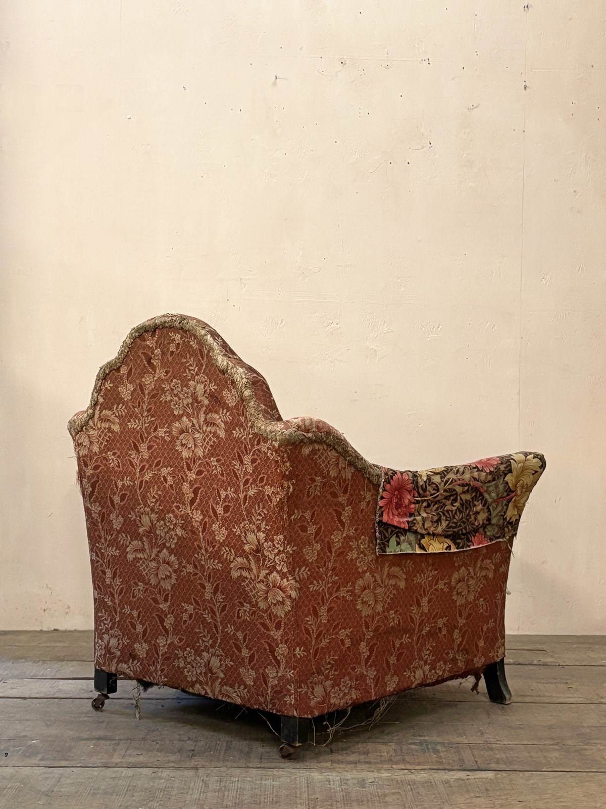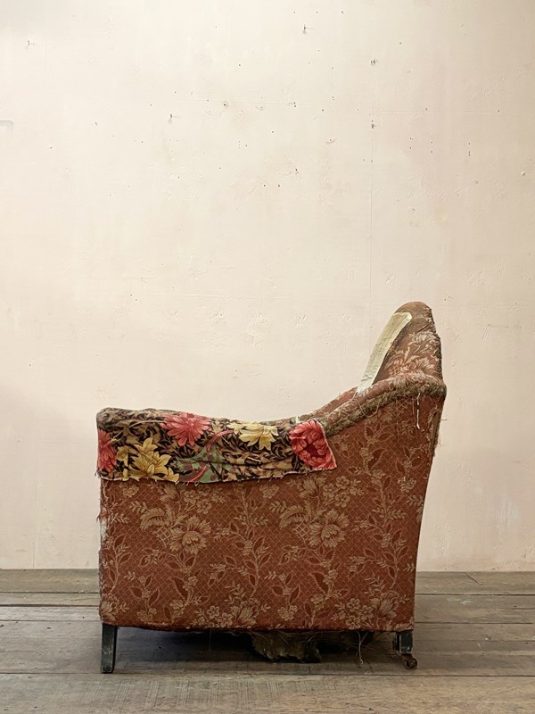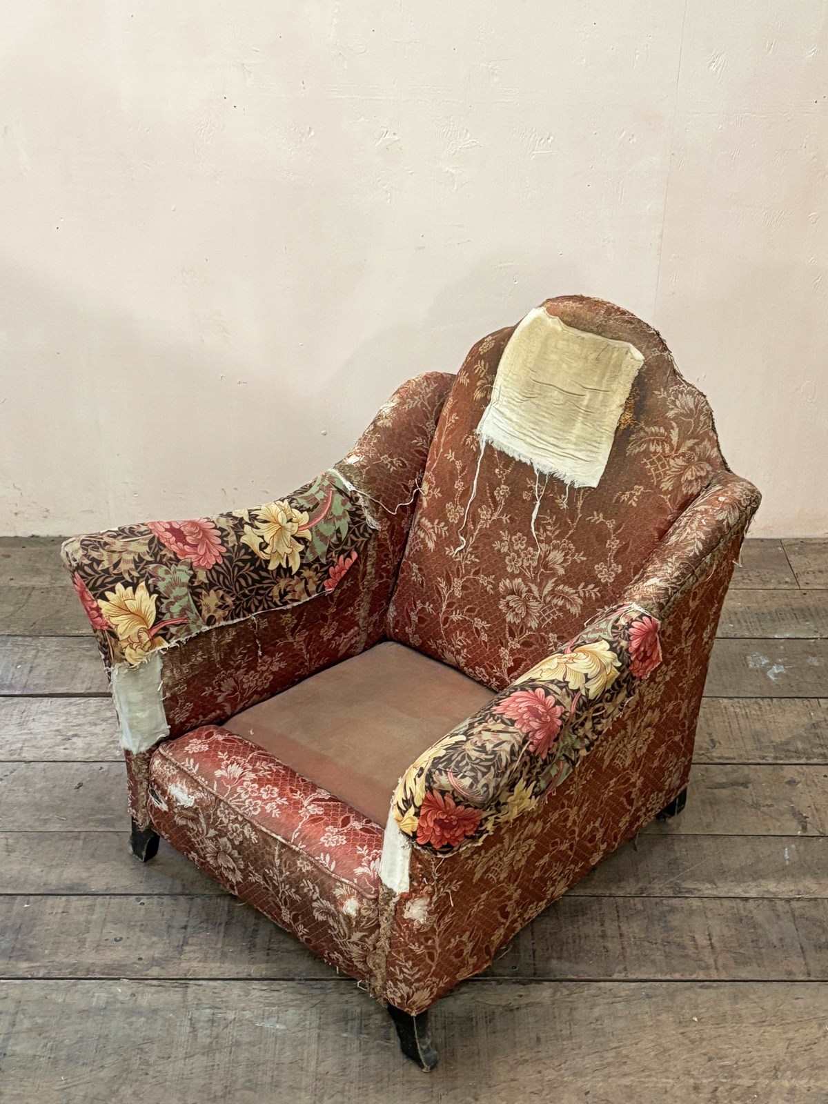 Rare, beautiful and comfortable, early to mid 20th century deep seated armchair with outward sweeping arms, for re-upholstery.