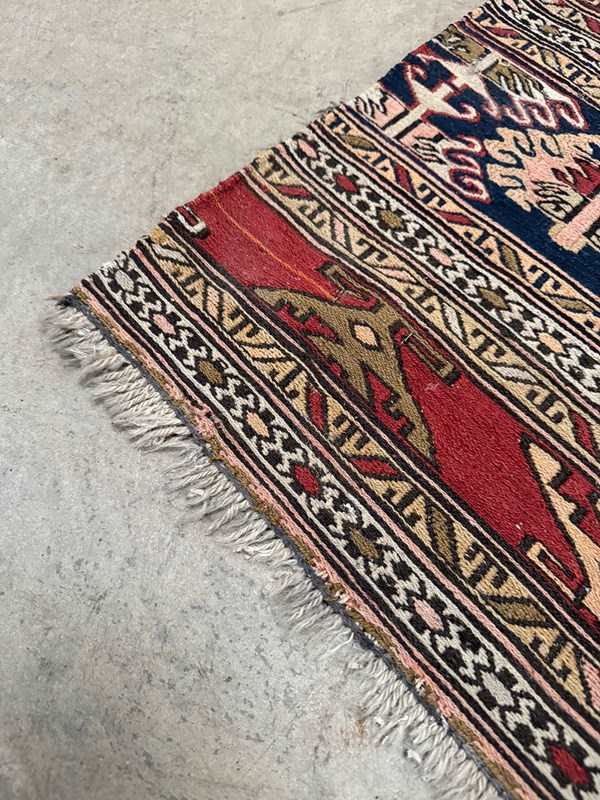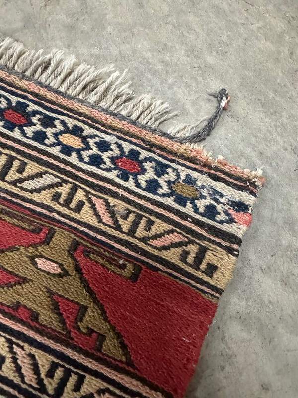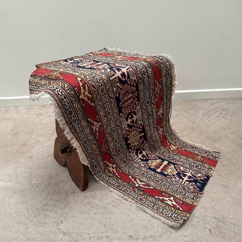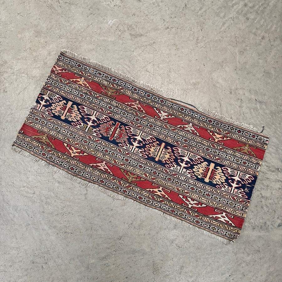 At around a meter long and hand made, the rug is predominantly in red, navy blue and white coloured cotton.