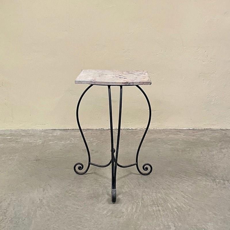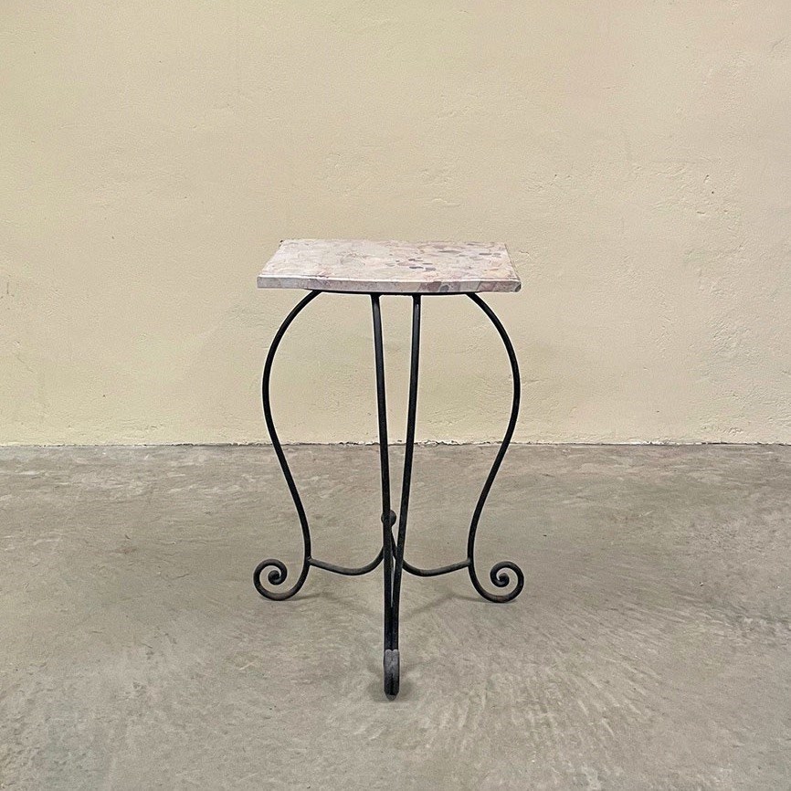 A wrought iron scroll footed base topped with a terrazzo style marble top.