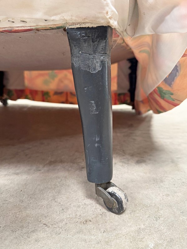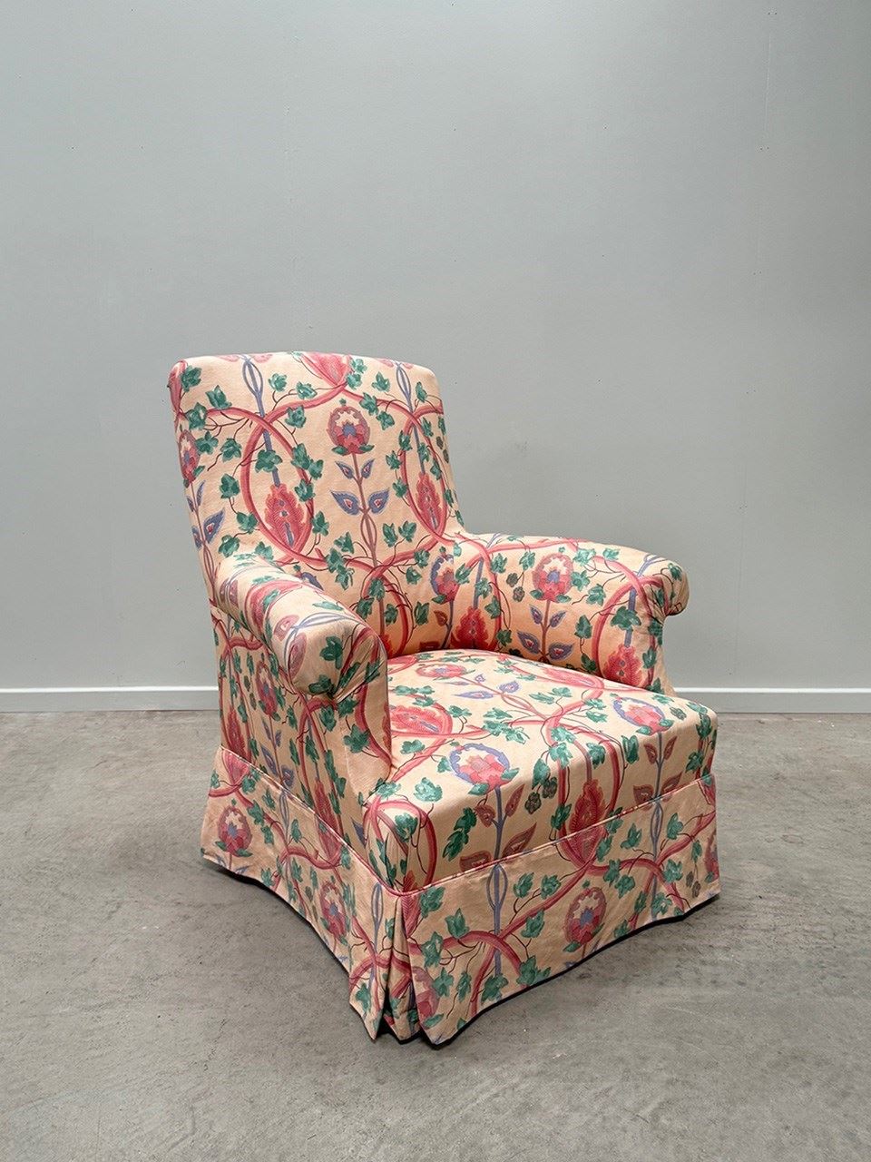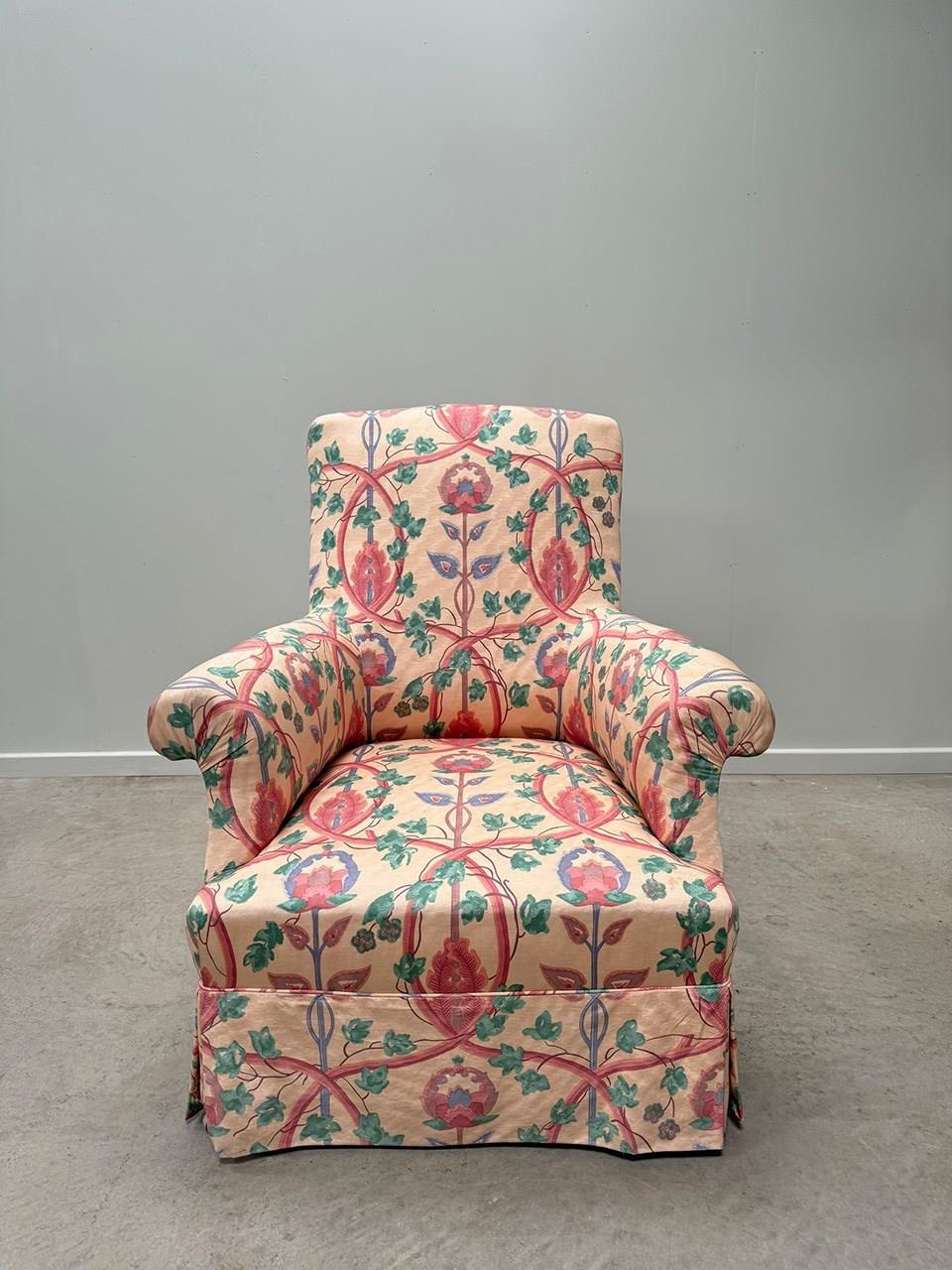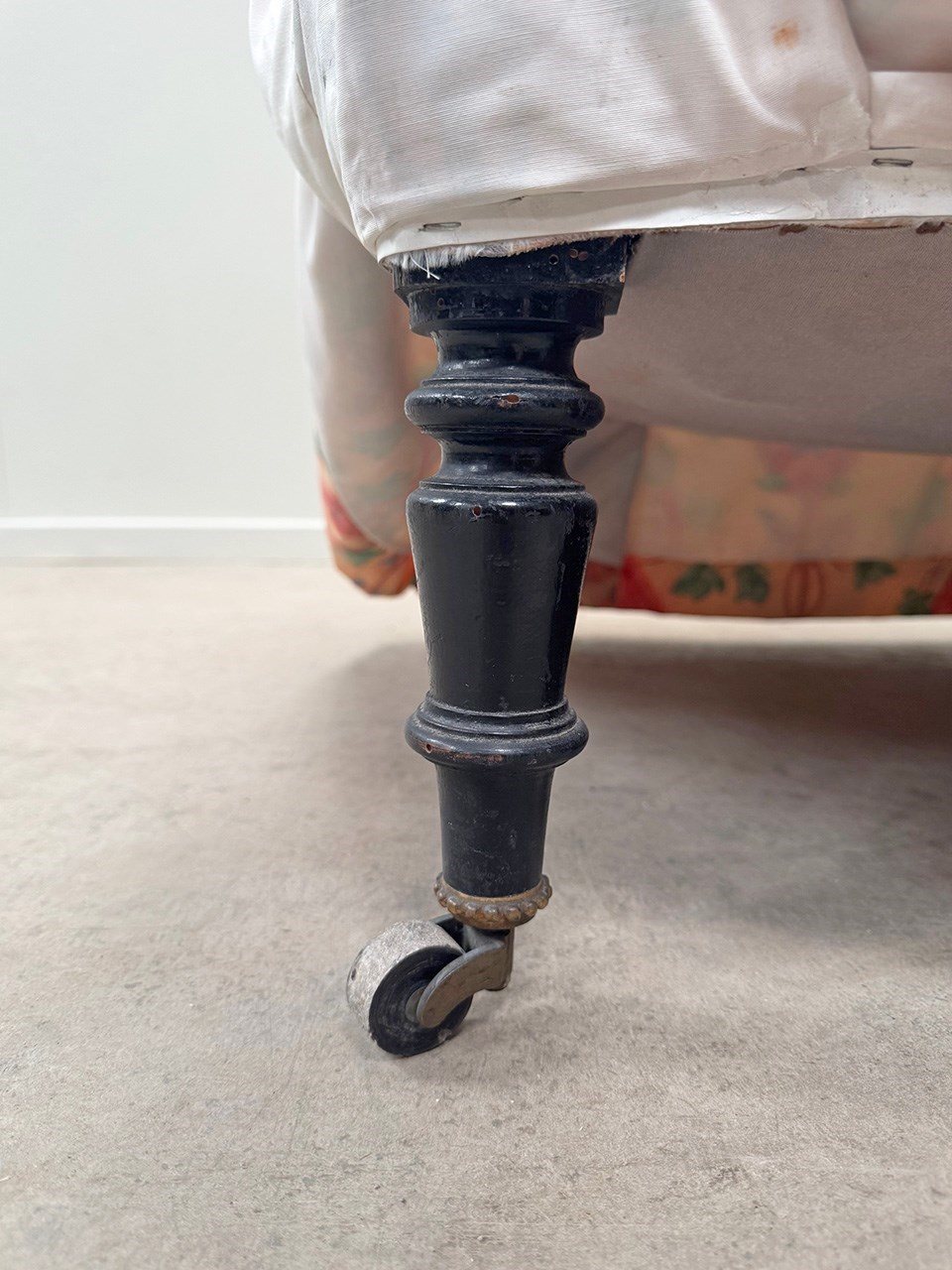 A Napoleon III high square back armchair, sourced from the Chateau de Sancerre, Loire Valley. With curved arms and set on ebonised feet with its original castors. The upholstery has some minor signs of wear, however, we can quote to reupholster this armchair in the fabric of your choice; please ask.