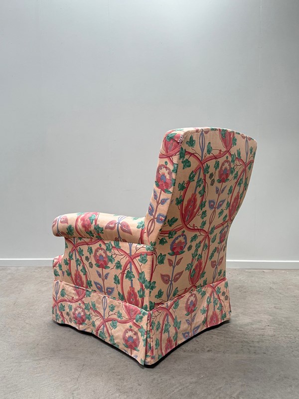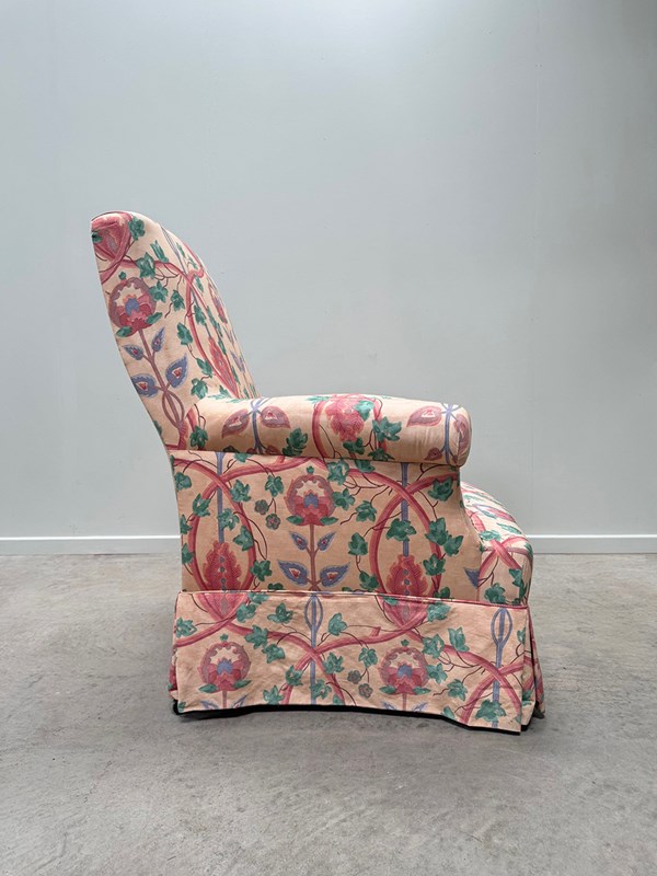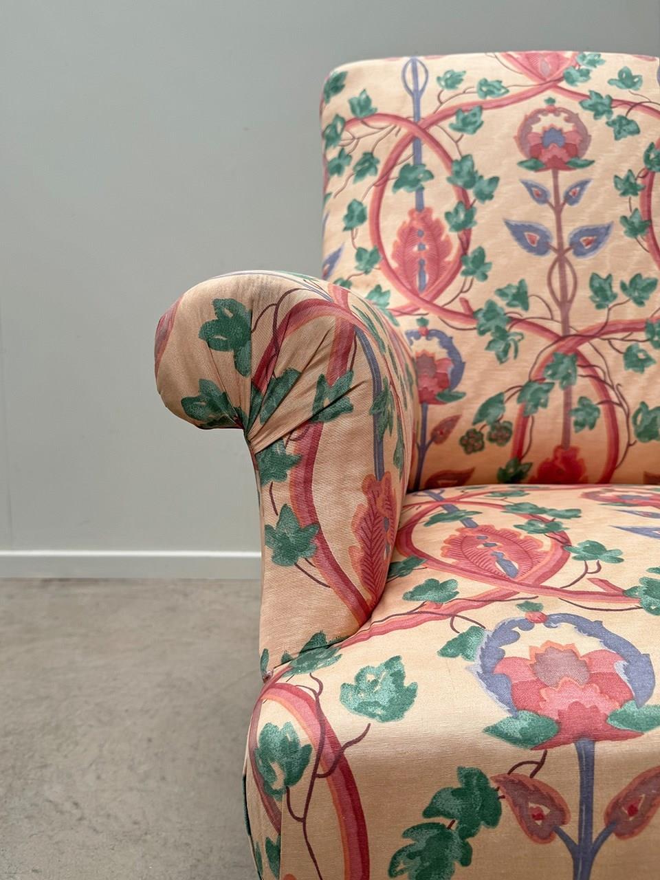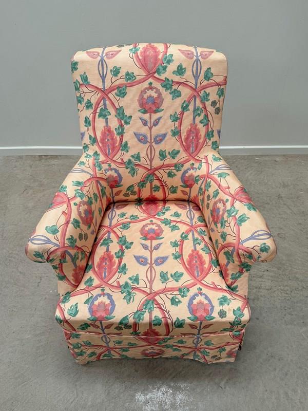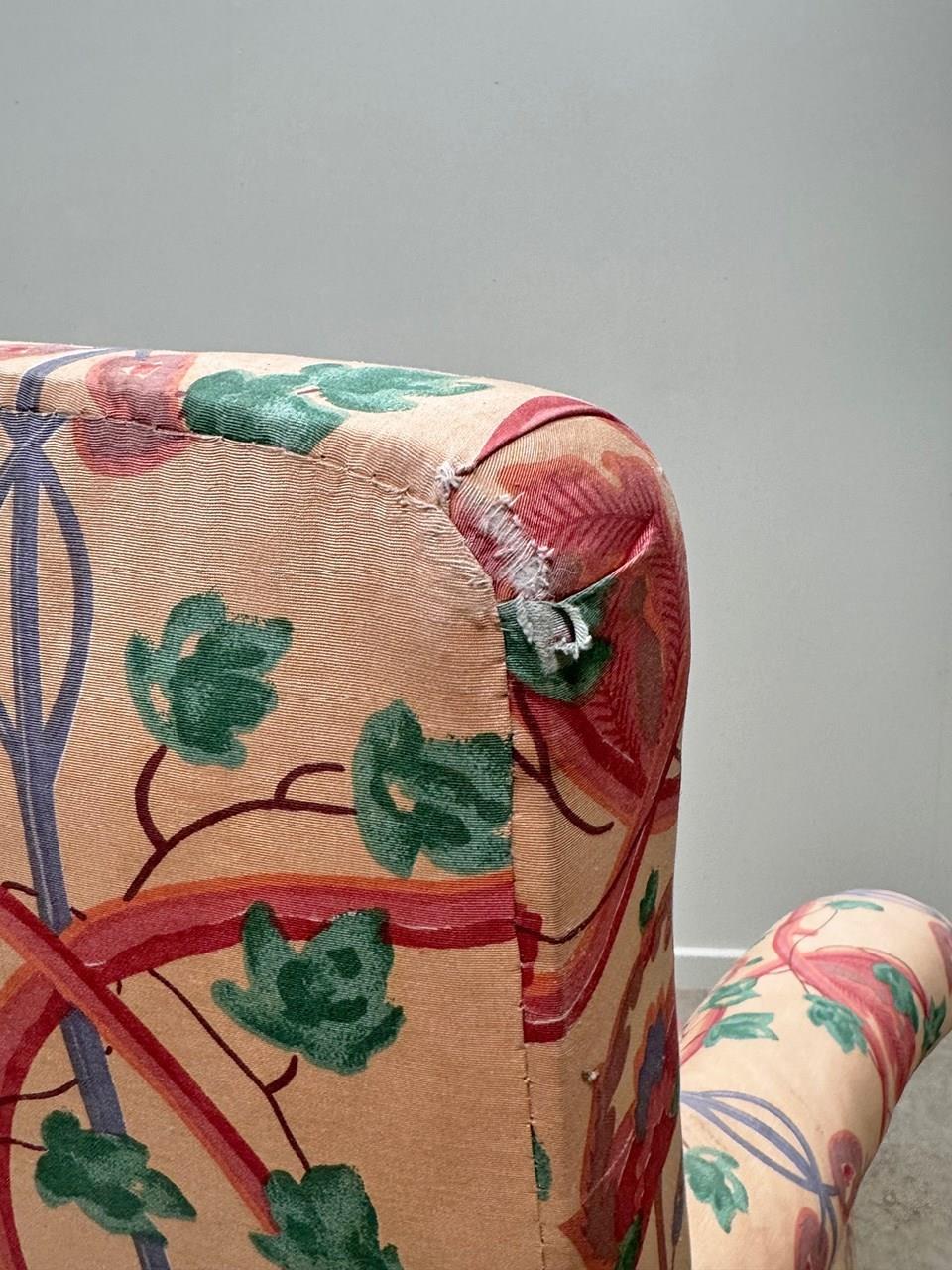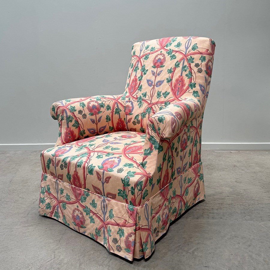 A Napoleon III high square back armchair, sourced from the Chateau de Sancerre, Loire Valley. With curved arms and set on ebonised feet with its original castors. The upholstery has some minor signs of wear, however, we can quote to reupholster this armchair in the fabric of your choice; please ask.