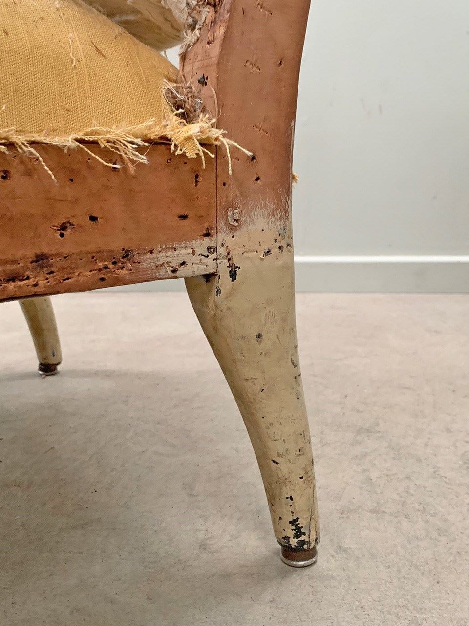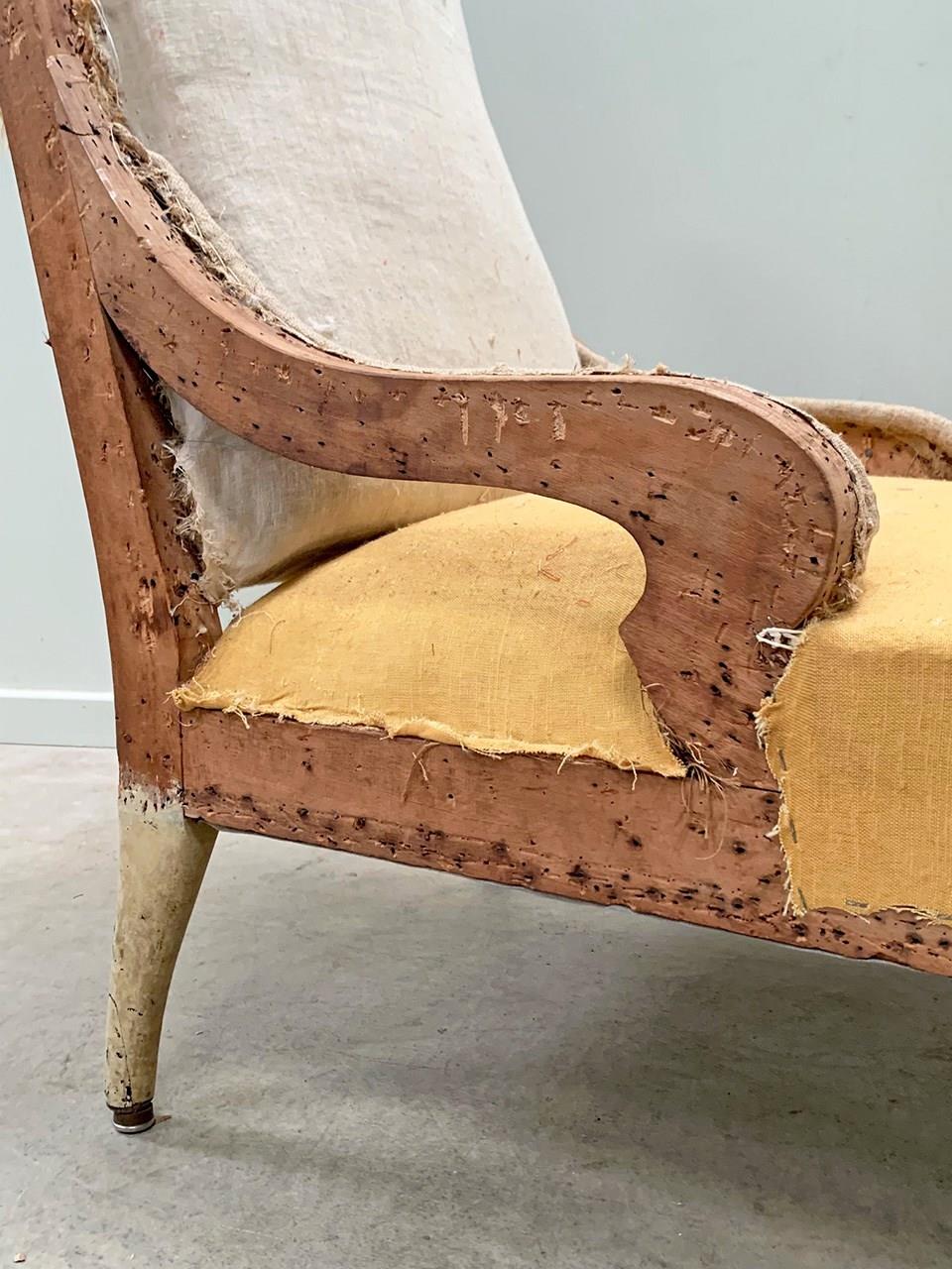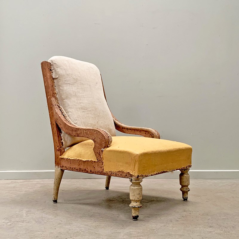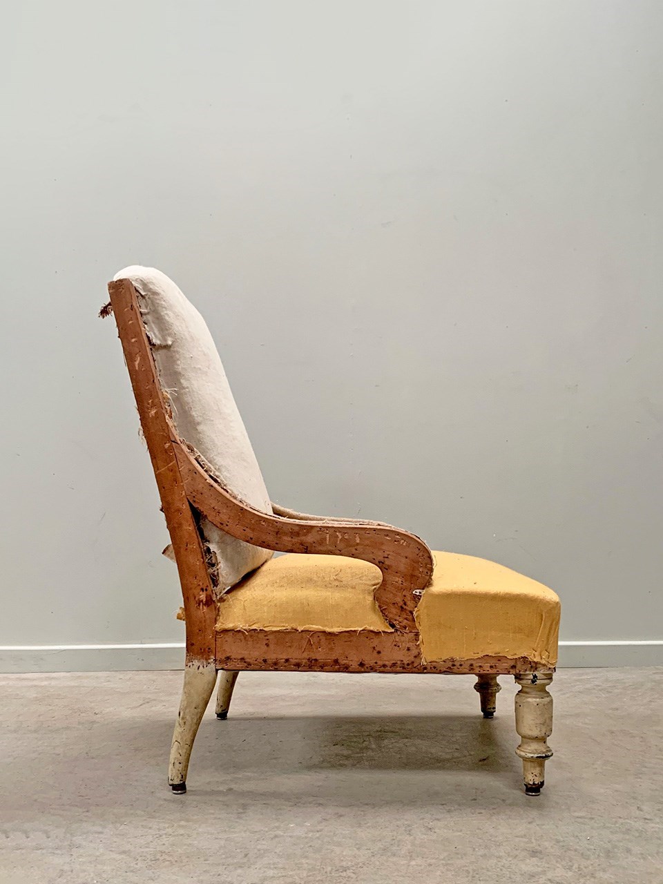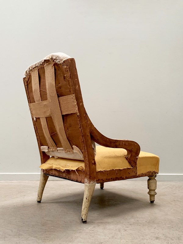Well-proportioned 19th century nursing chair with a square back and low sweeping arms ready for re-upholstery.