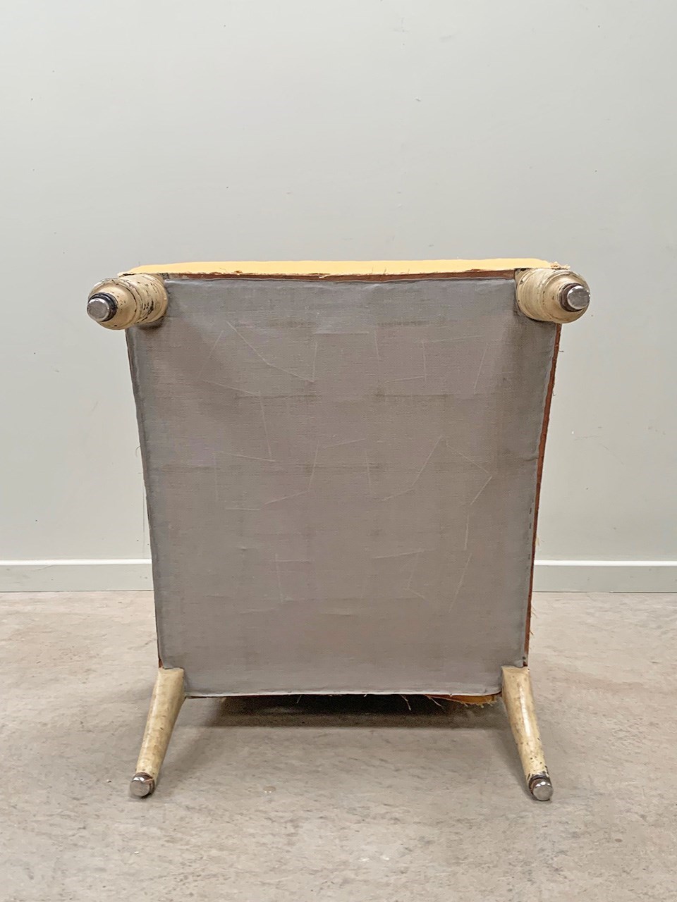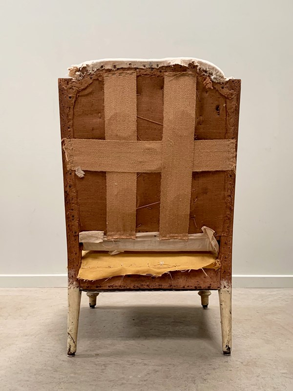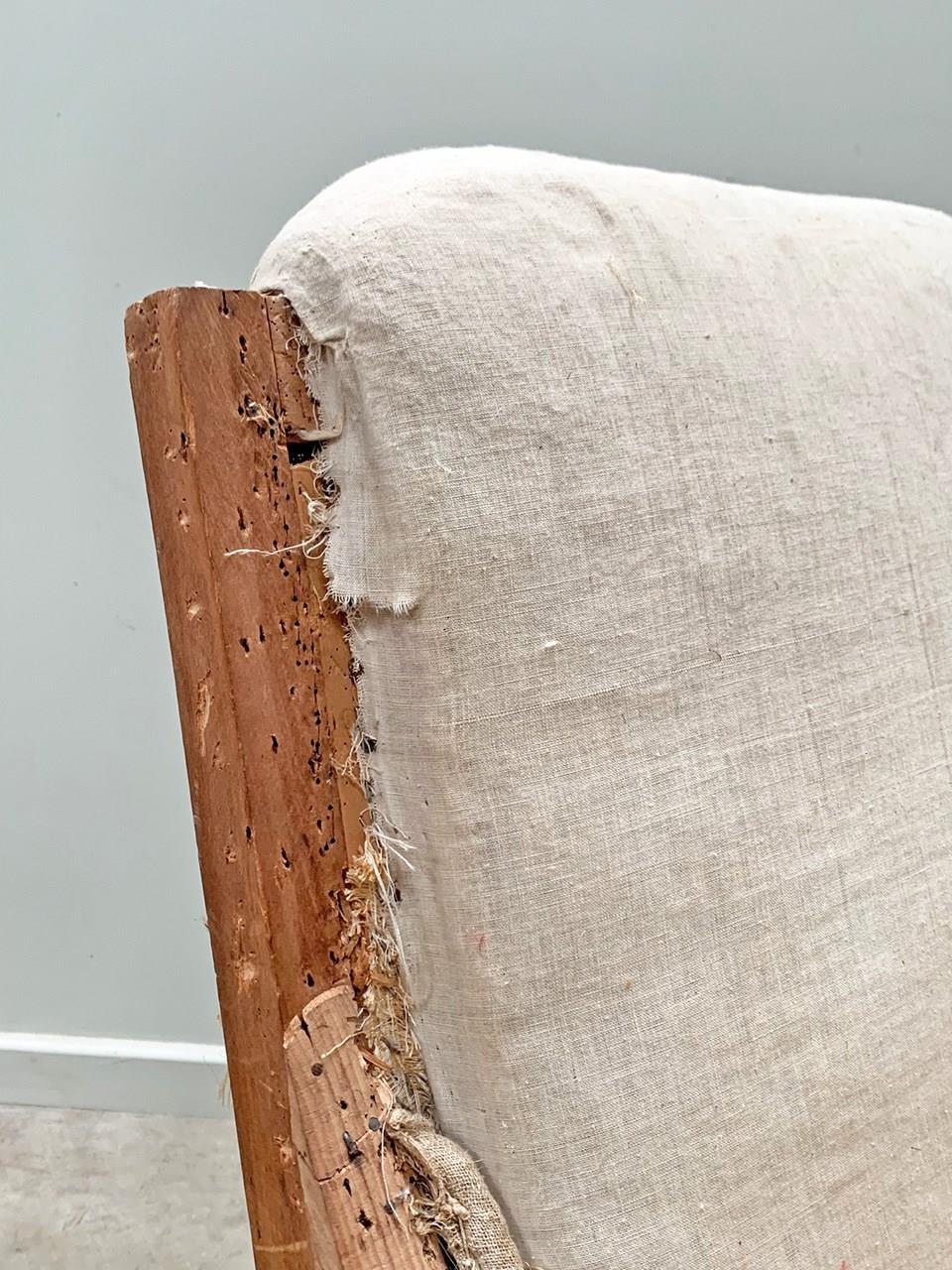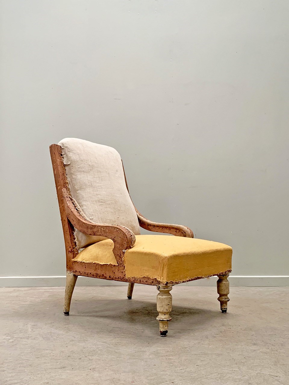 Well-proportioned 19th century nursing chair with a square back and low sweeping arms ready for re-upholstery.