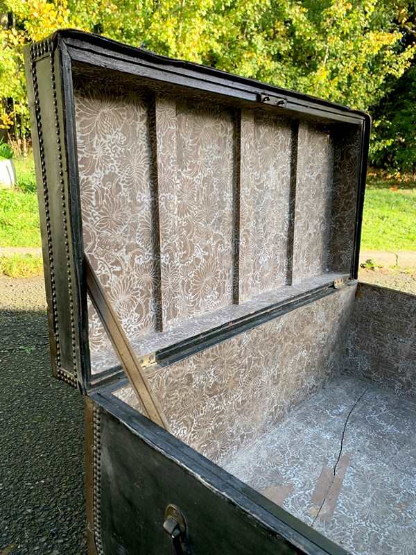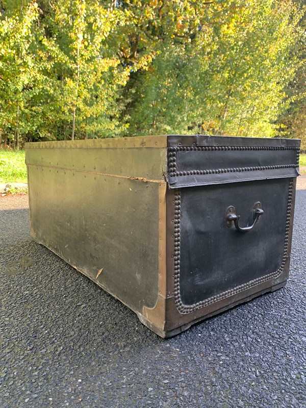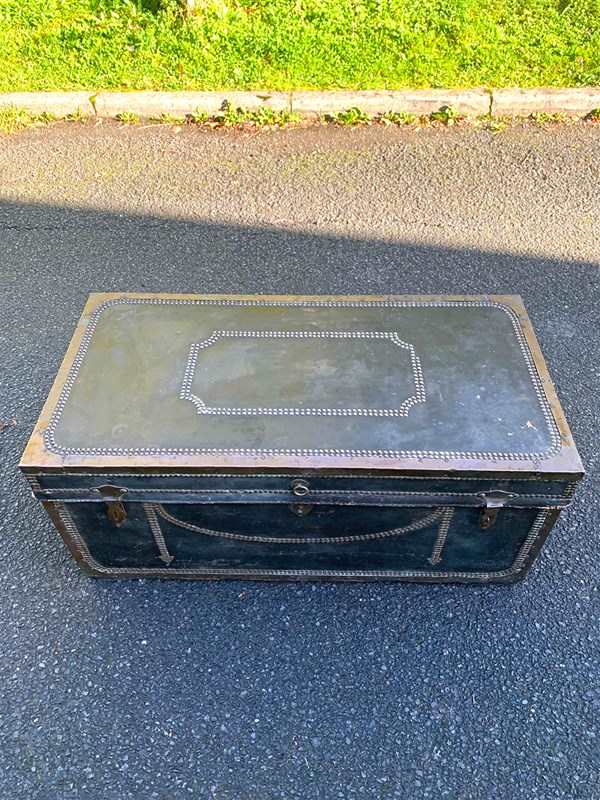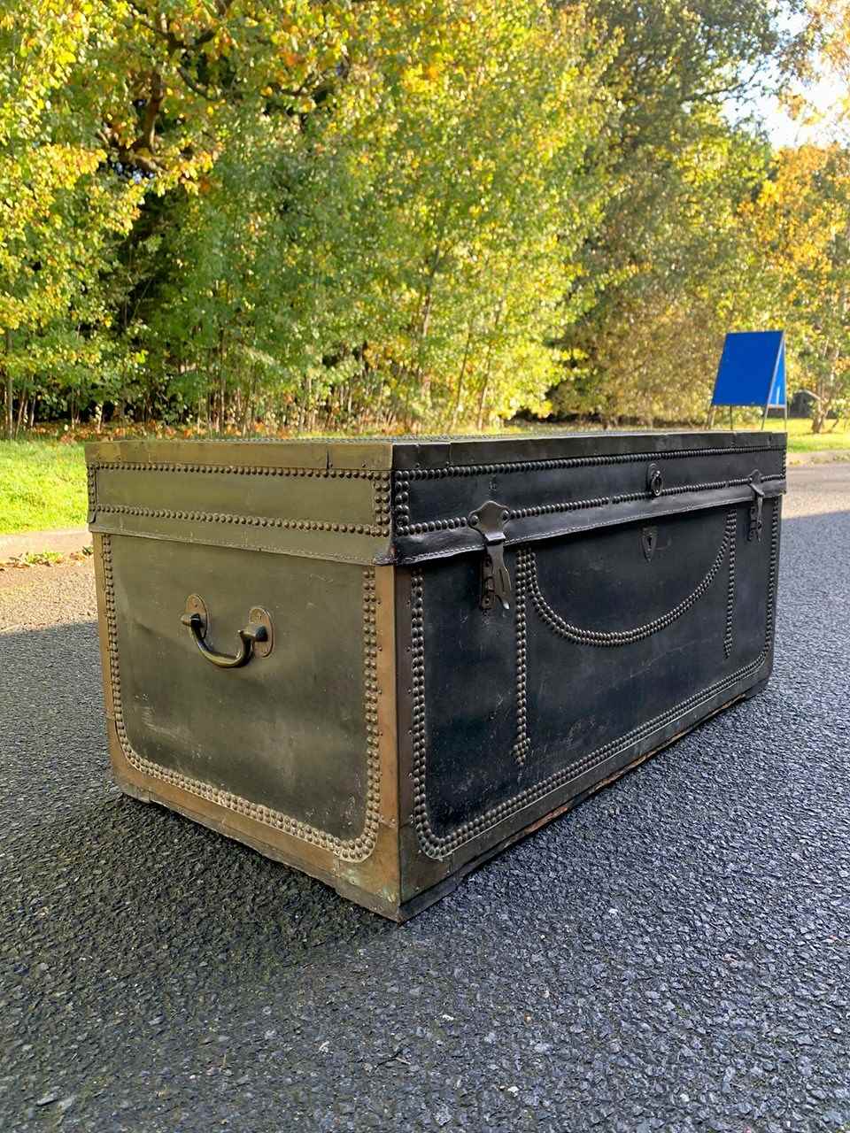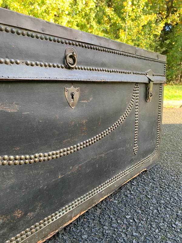 Handsome 19th century storage trunk; a wooden box layered with thin and now, worn black leather, with metal strapping and hardware.