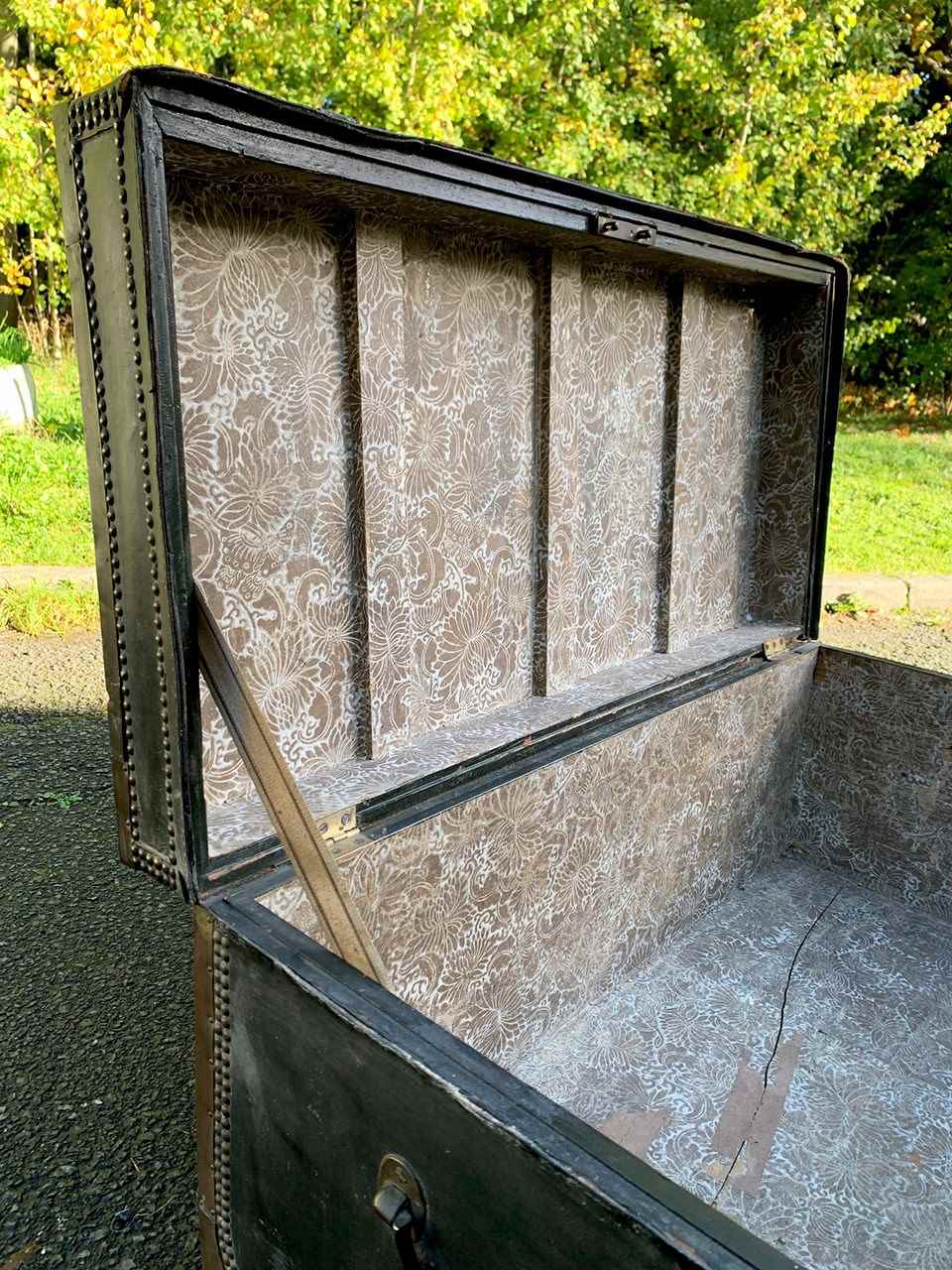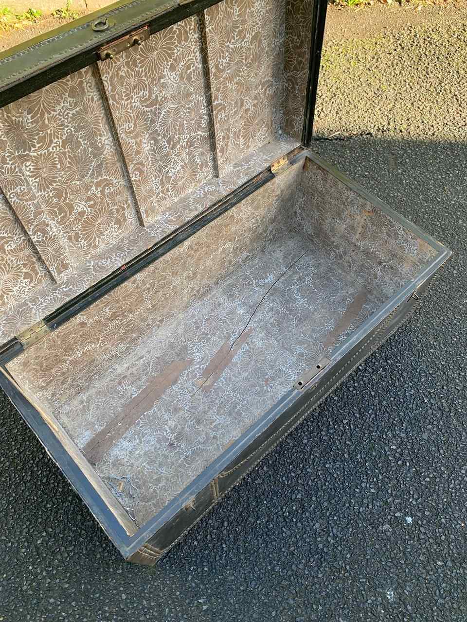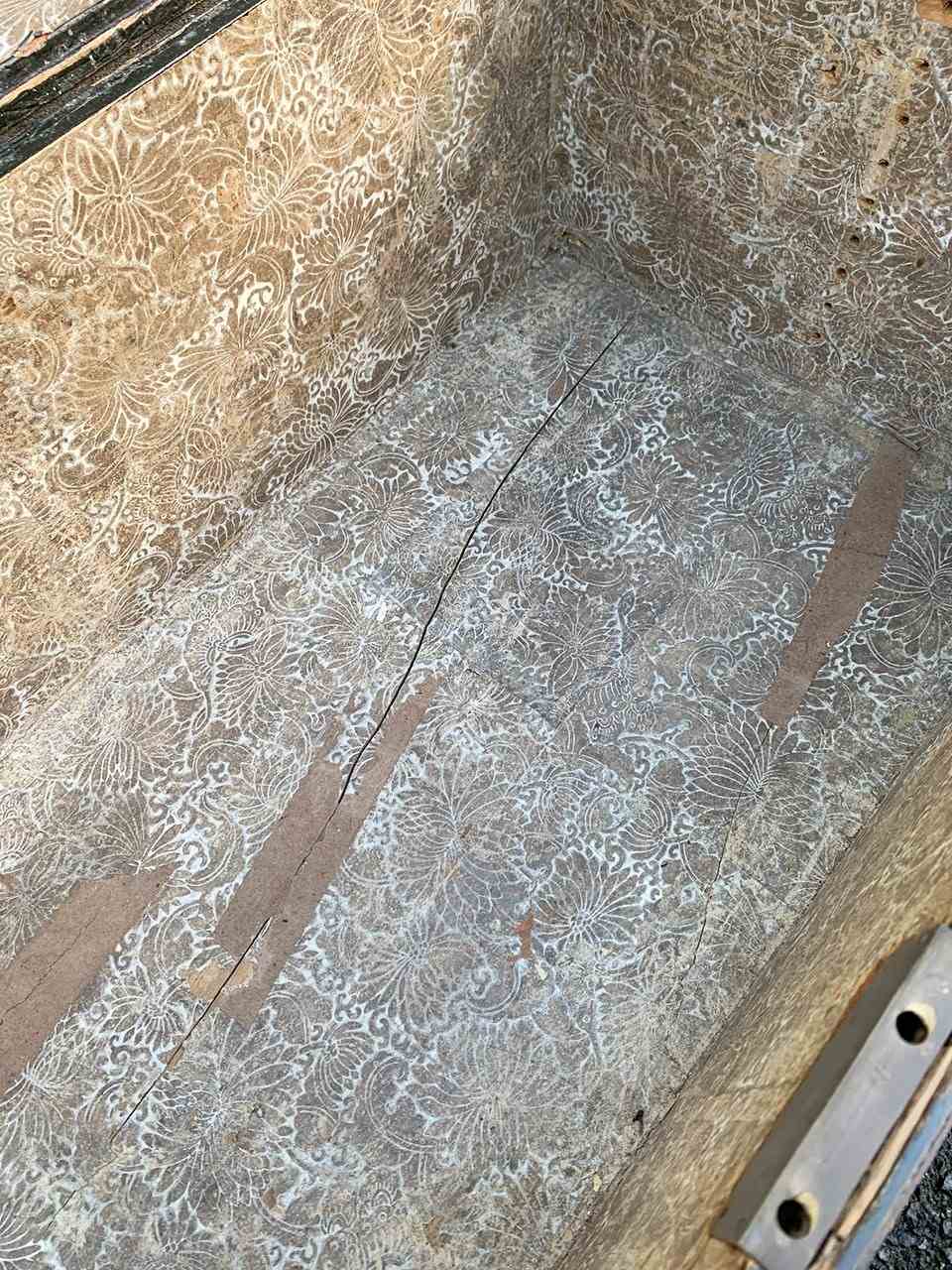Decorated with studs throughout. Inside is lined with a beige floral paper.