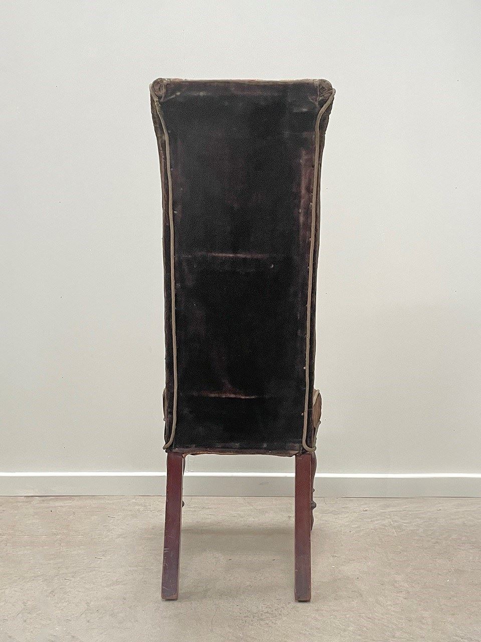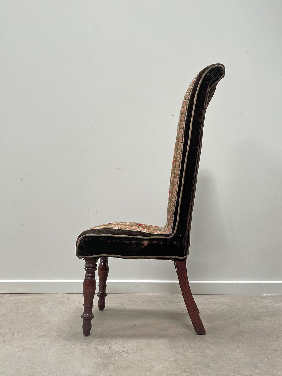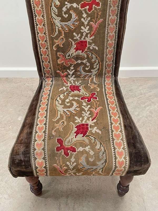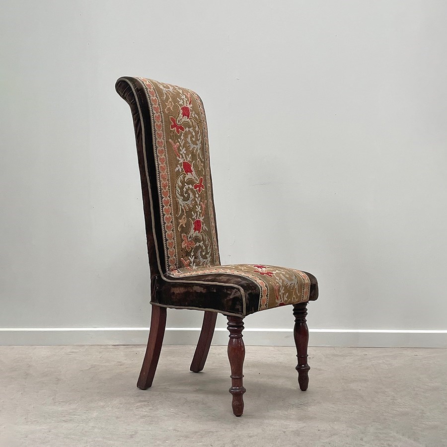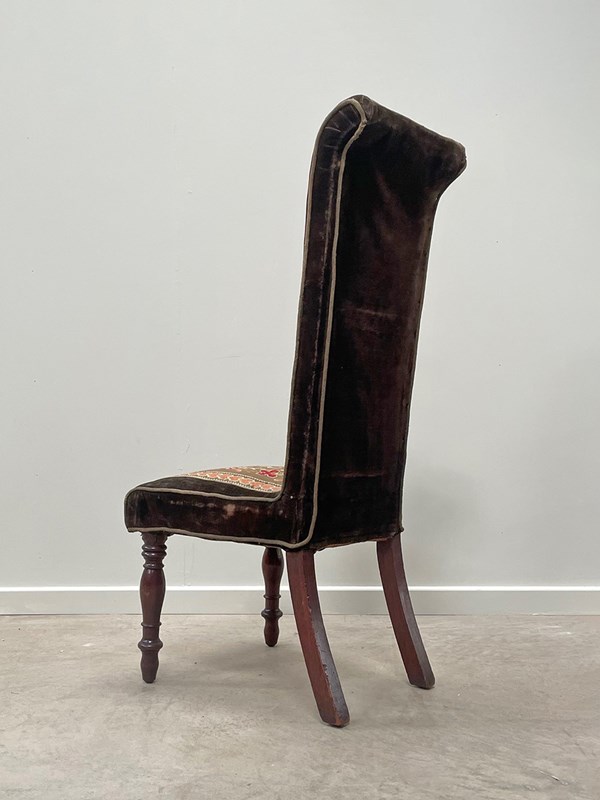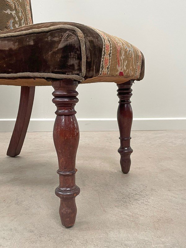 The chair sits on tall and slender mahogany turned legs. Sturdy, the chair has been covered in a chocolate velvet and fitted with a central embroidery panel.