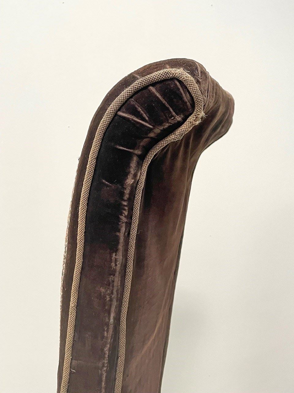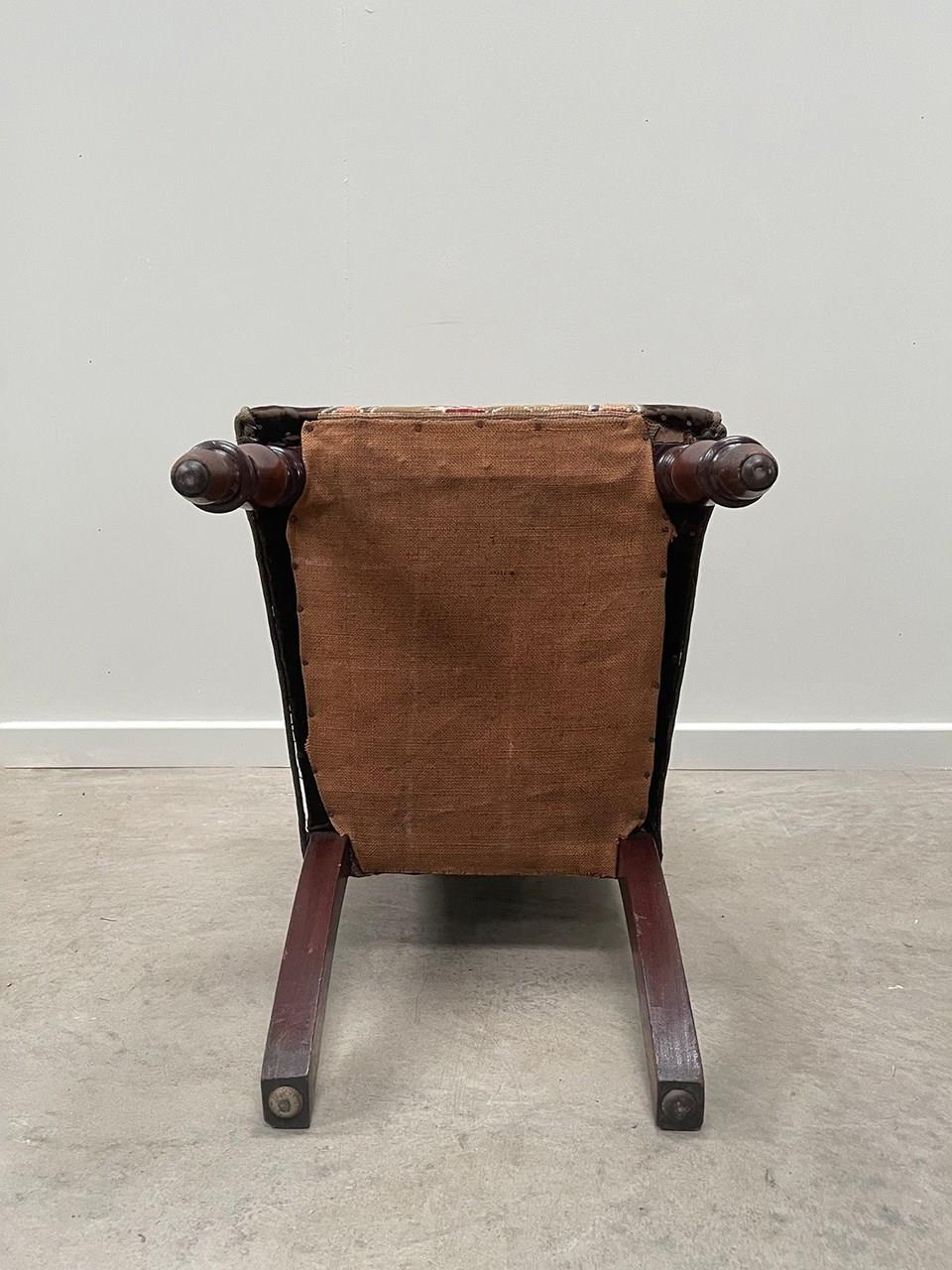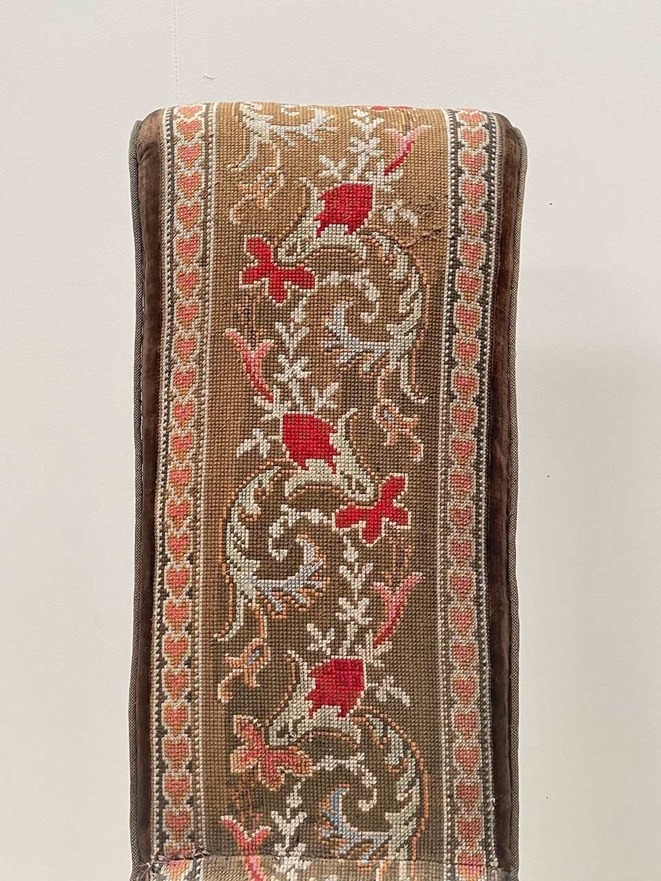 The chair sits on tall and slender mahogany turned legs. Sturdy, the chair has been covered in a chocolate velvet and fitted with a central embroidery panel.