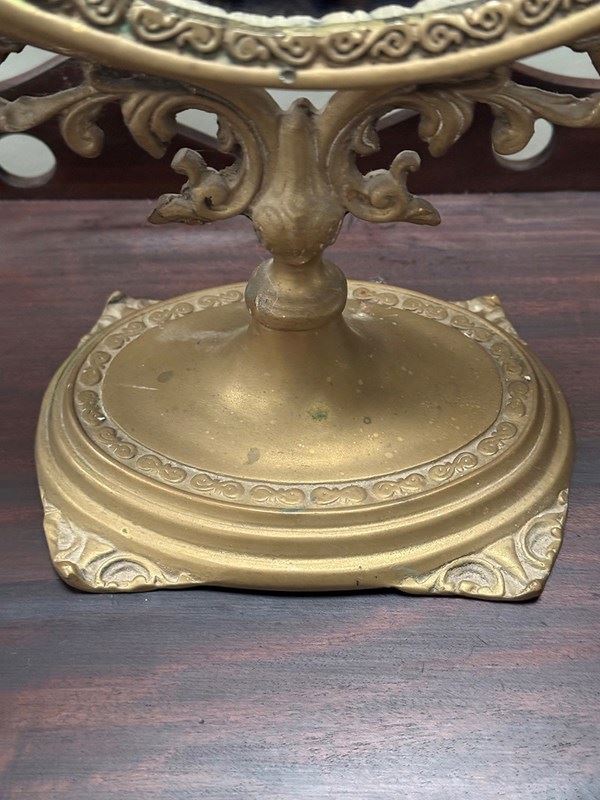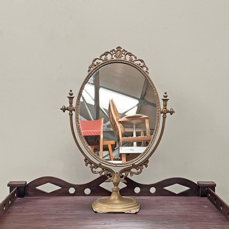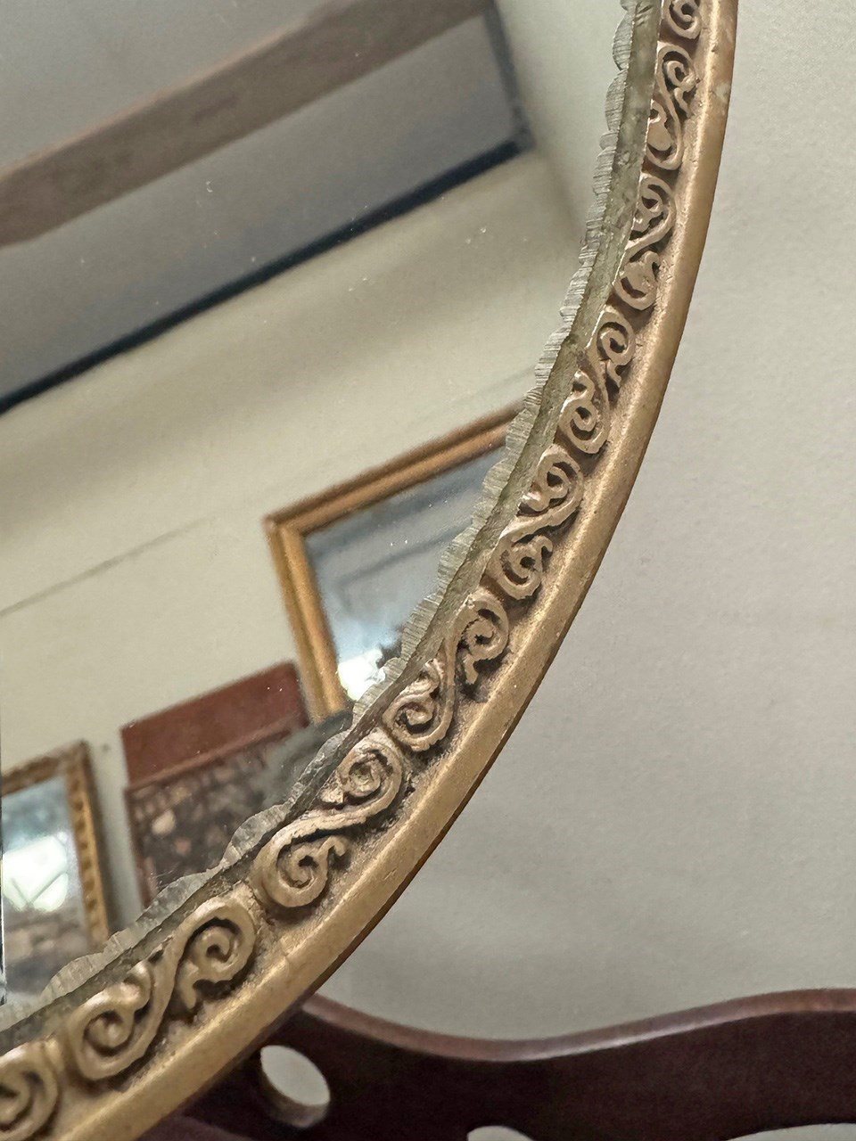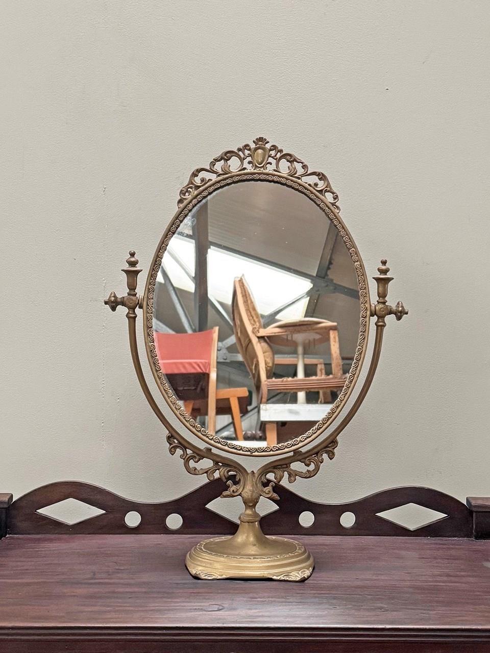 The crested mirror pivots and can be secured in the desired position via the knobs in either side of the mirror.