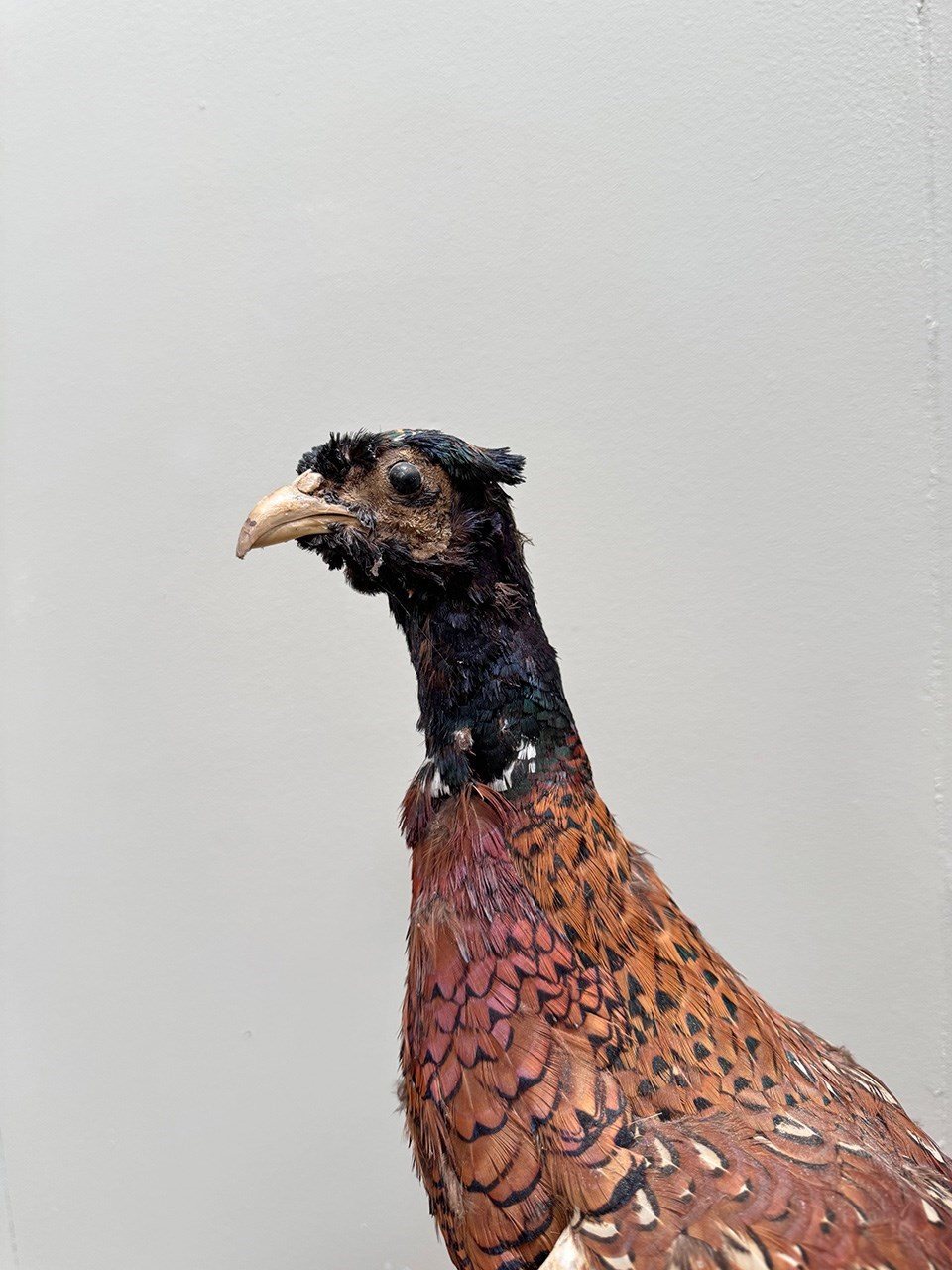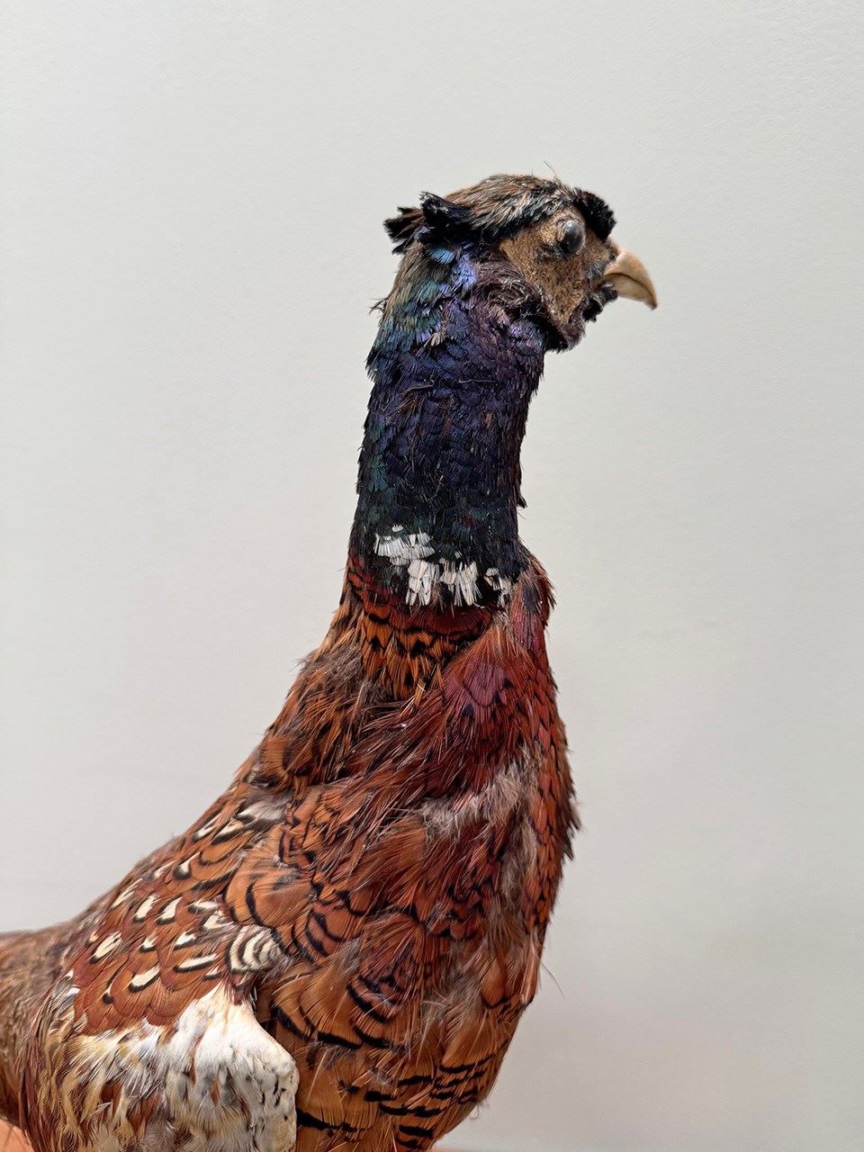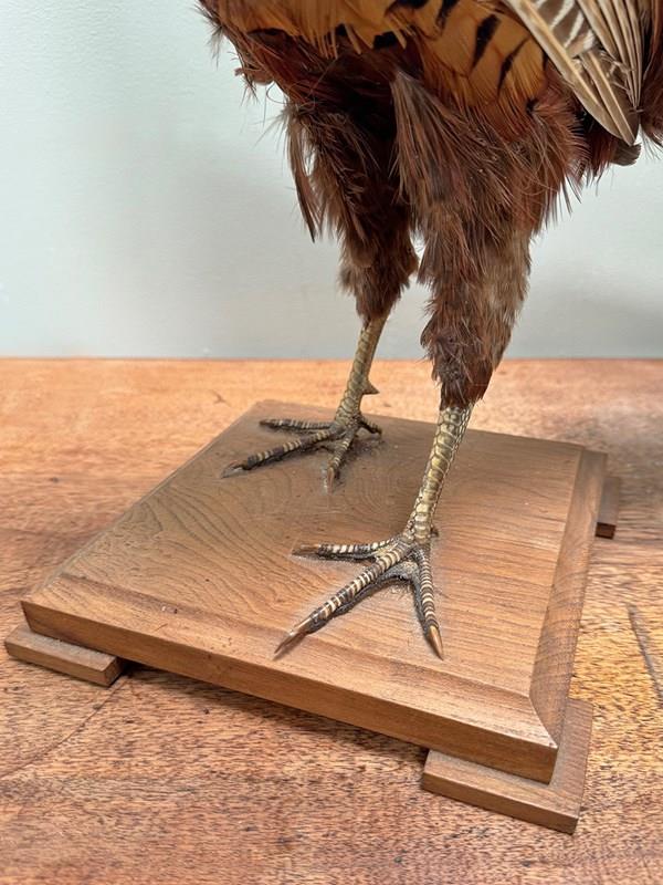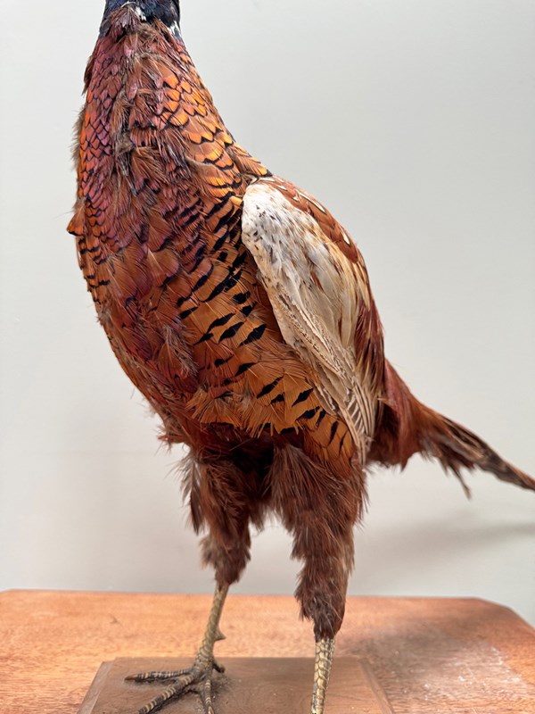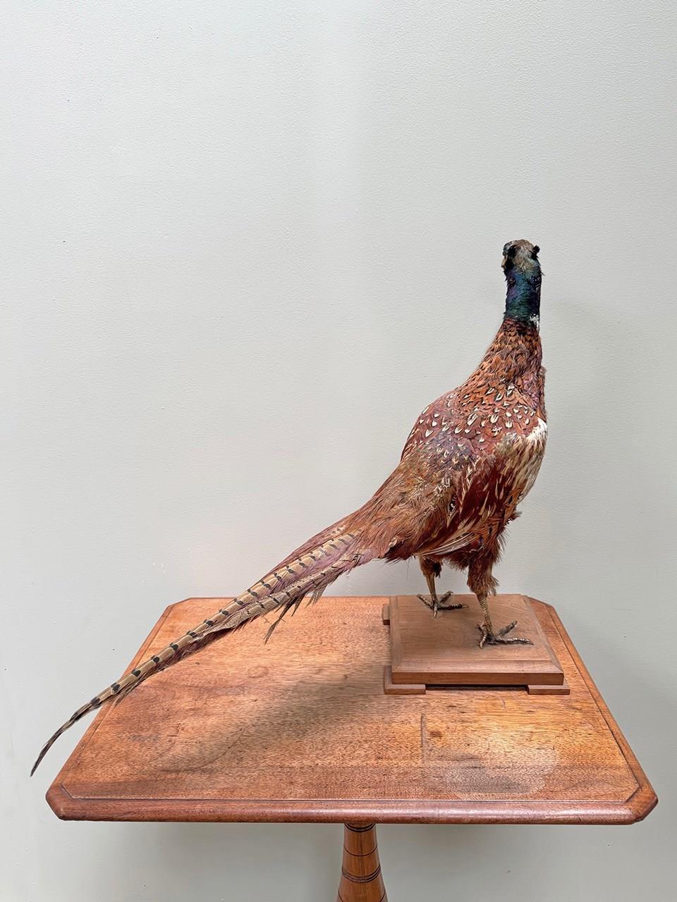 Early/mid 1900s taxidermy pheasant, set on a square wooden socle. In very good condition.