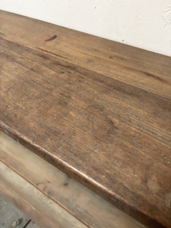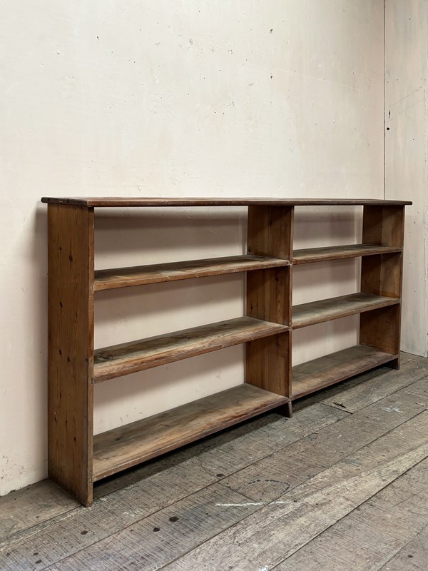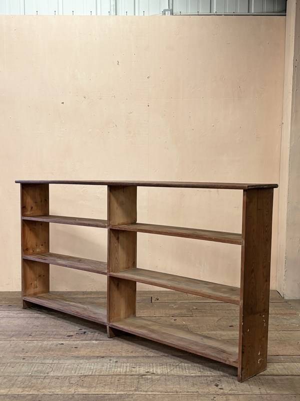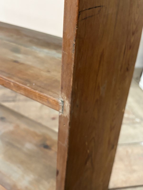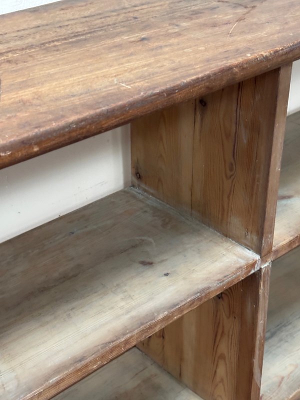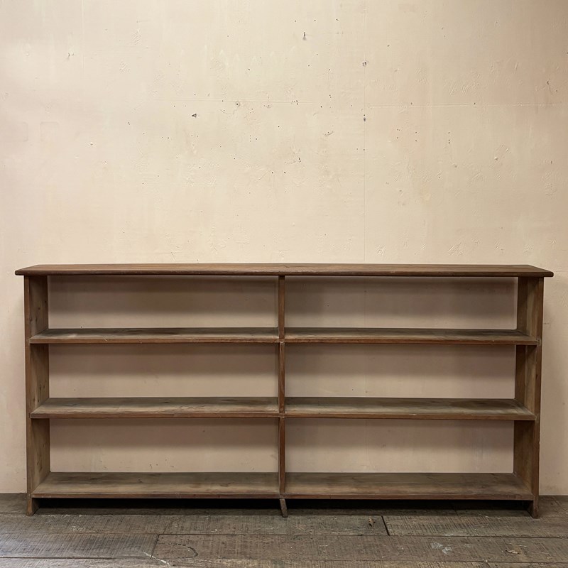 Early 20th century pine shelving unit with a teak or iroko, possibly originally from a school or college.