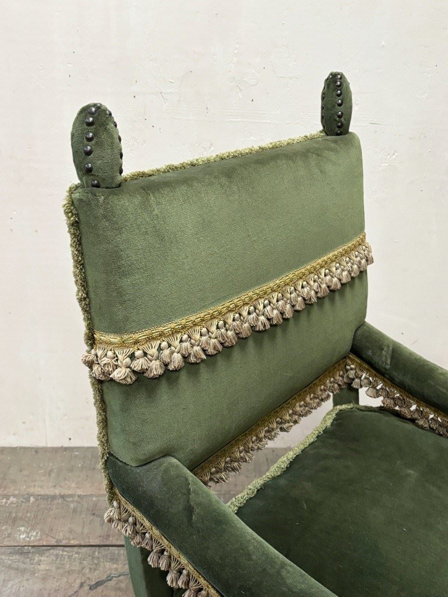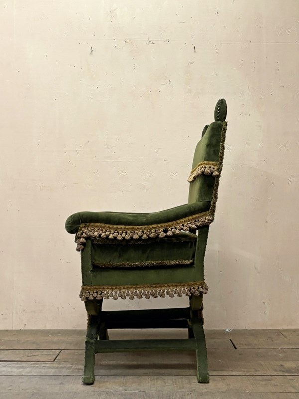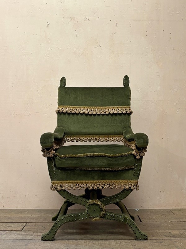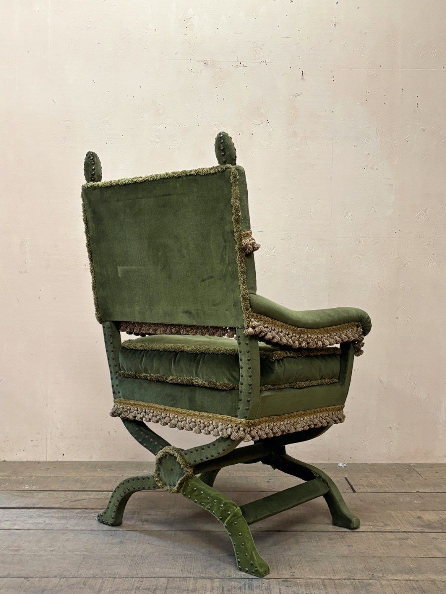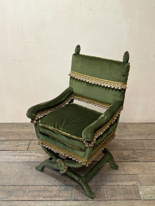Early 20th century X base throne chair, retaining its original velvet and fringing and in excellent condition.
