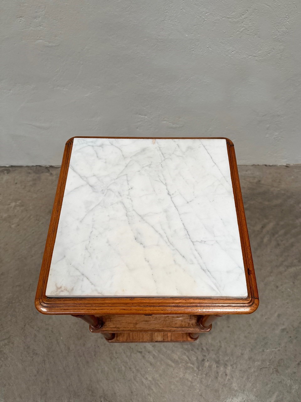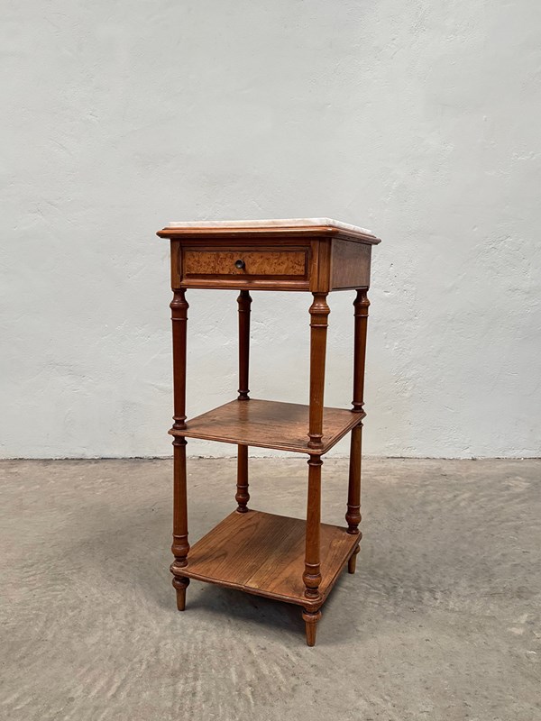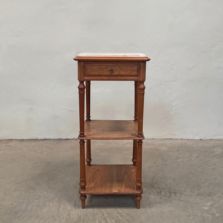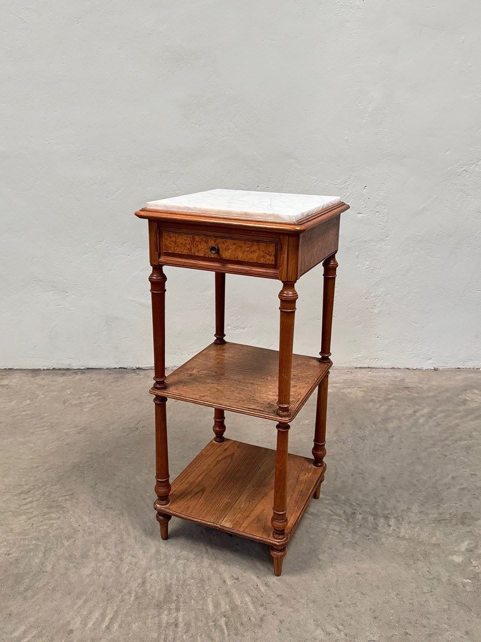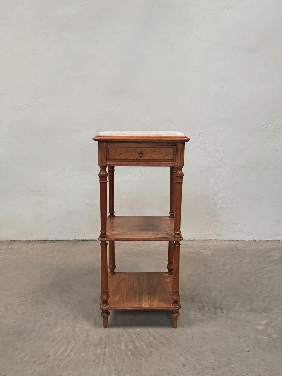A tall and slim 19th century walnut bedside table with a white marble top, a slim drawer and two large shelves.