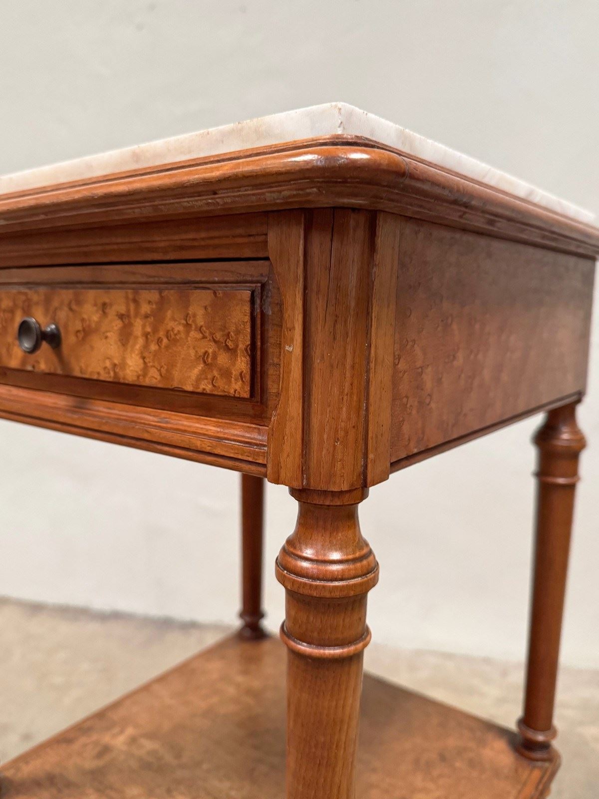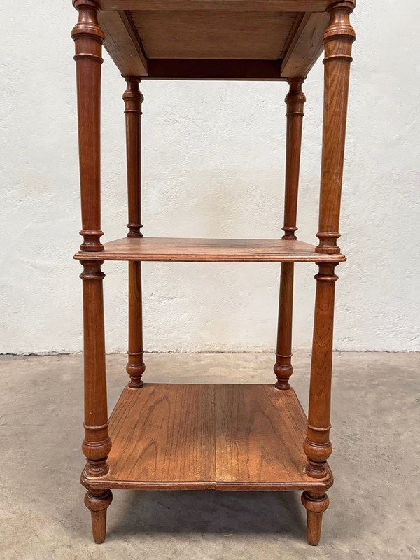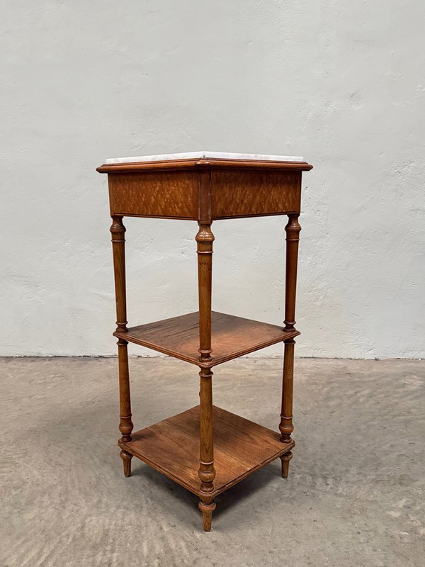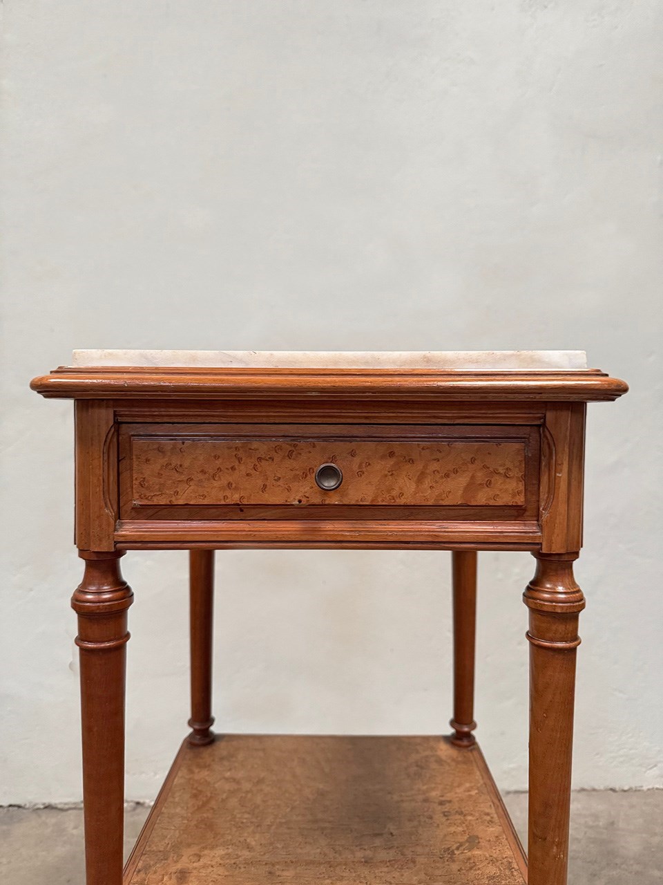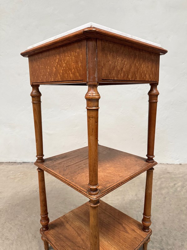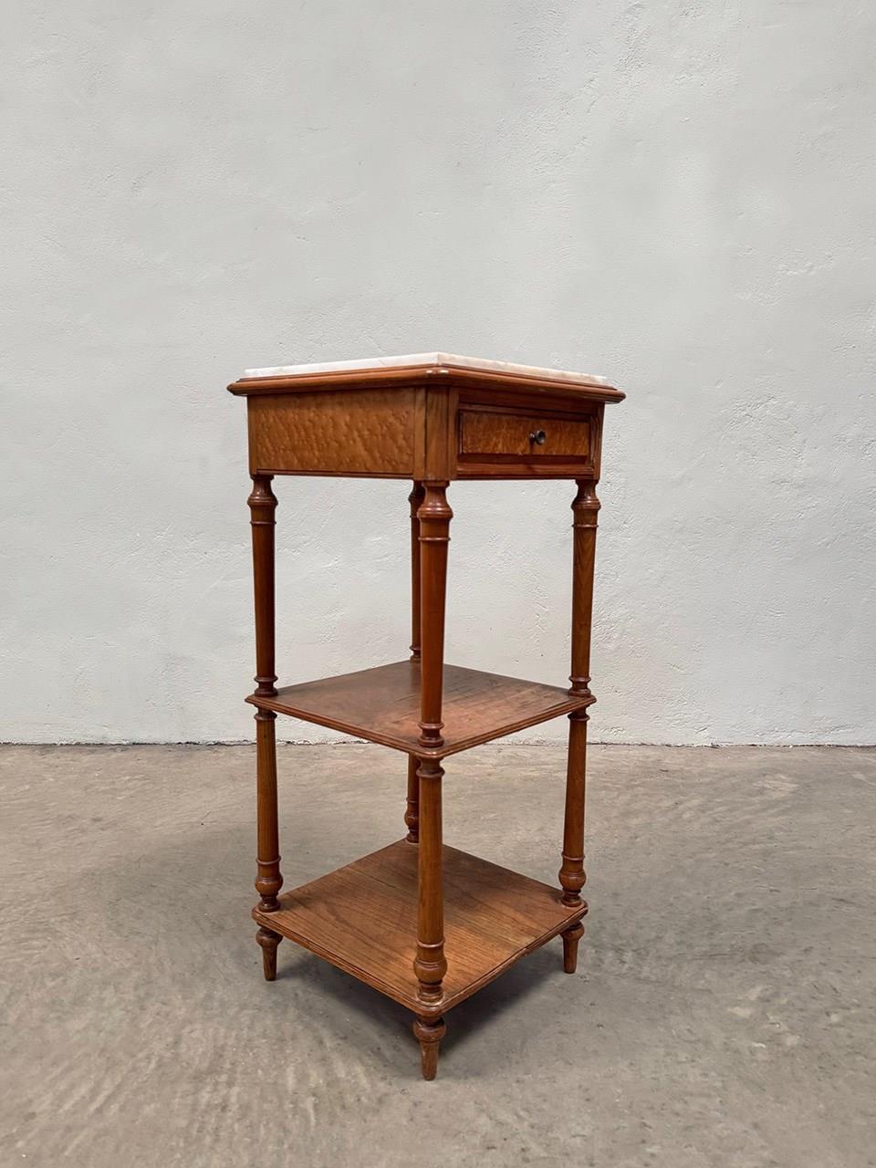 A tall and slim 19th century walnut bedside table with a white marble top, a slim drawer and two large shelves.