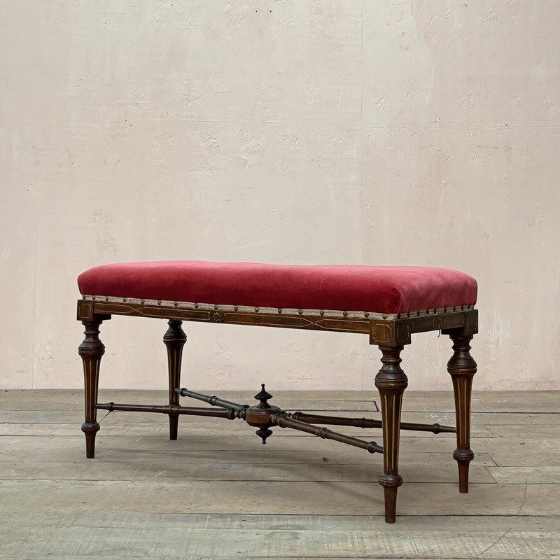 Fine, walnut upholstered bench c.1900 on tapered fluted legs with no damage or losses. Retains original fabric in clean, useable condition.