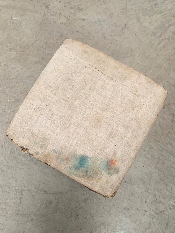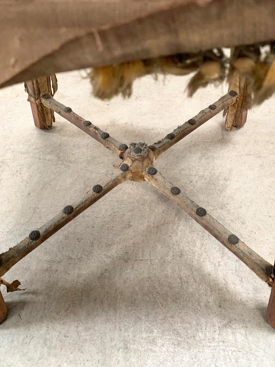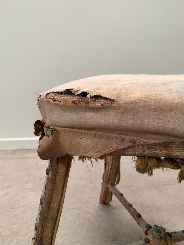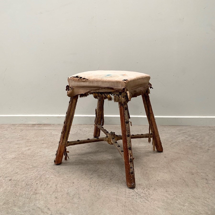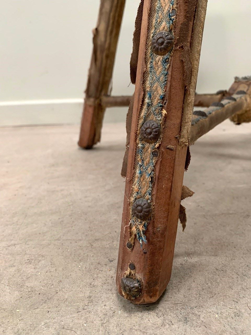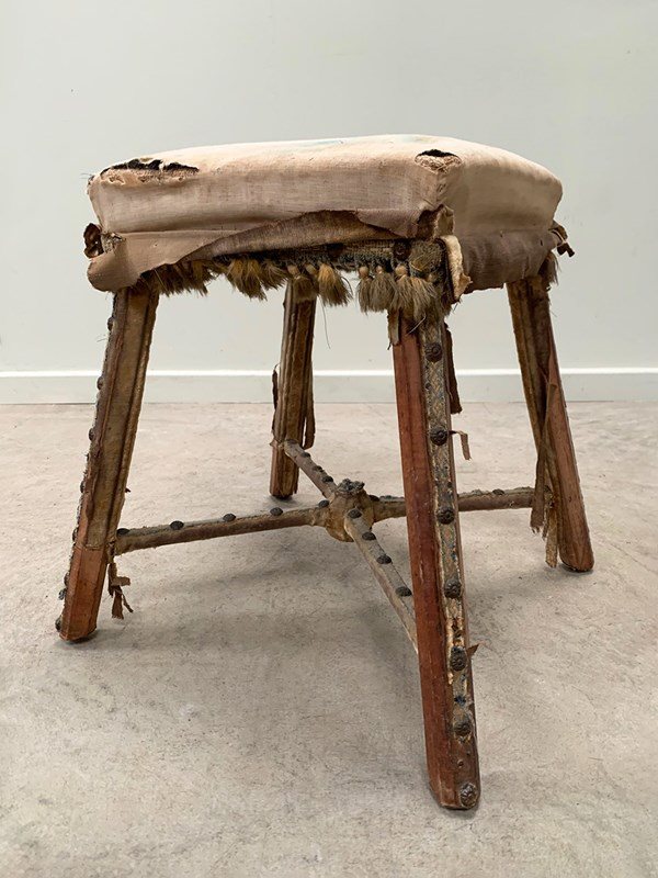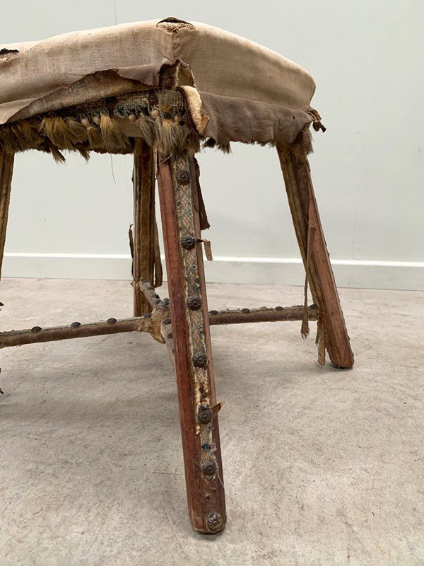 Unusual 19th century upholstered stool with studded details along the splayed legs, held by crossed stretchers.