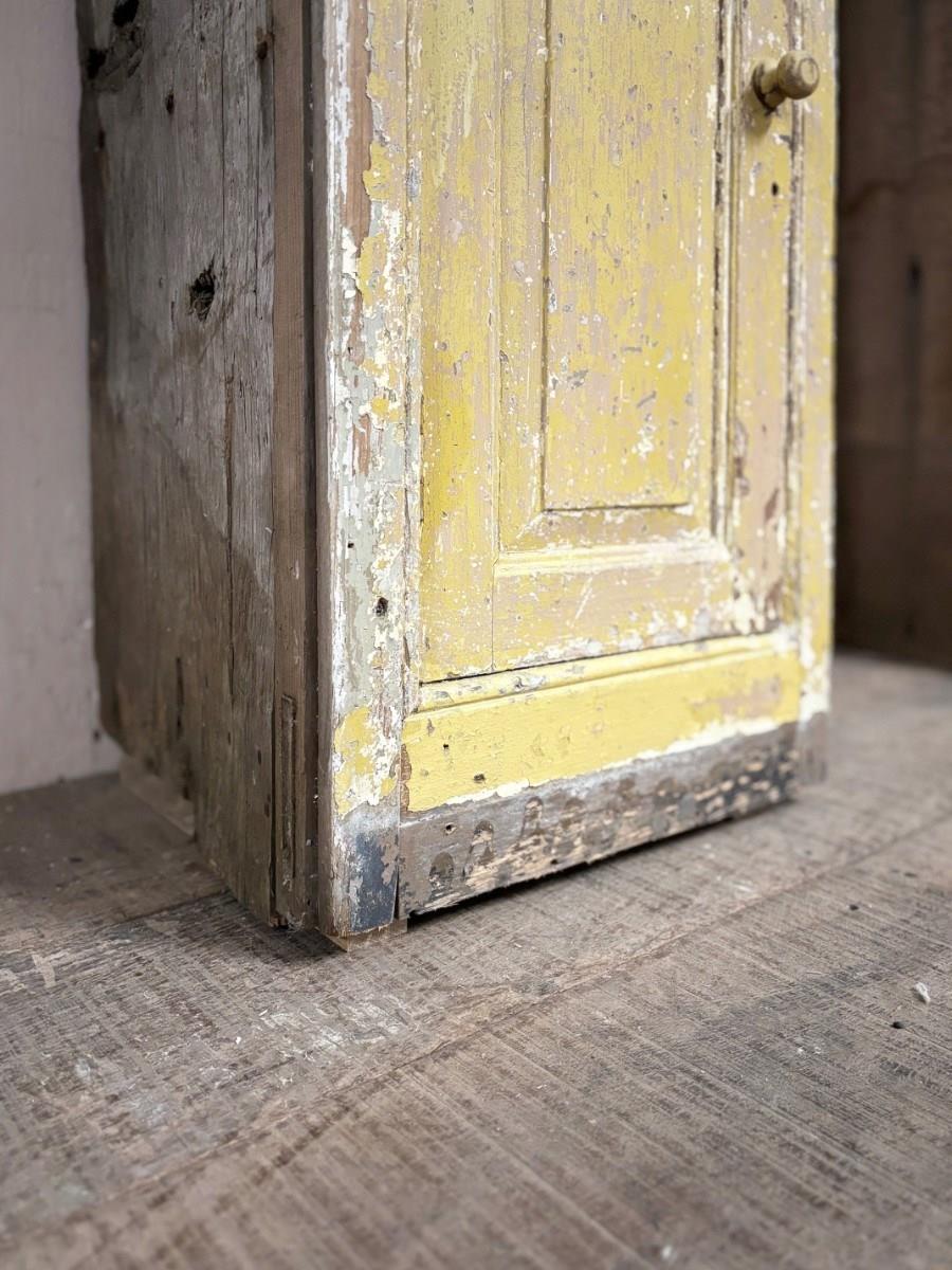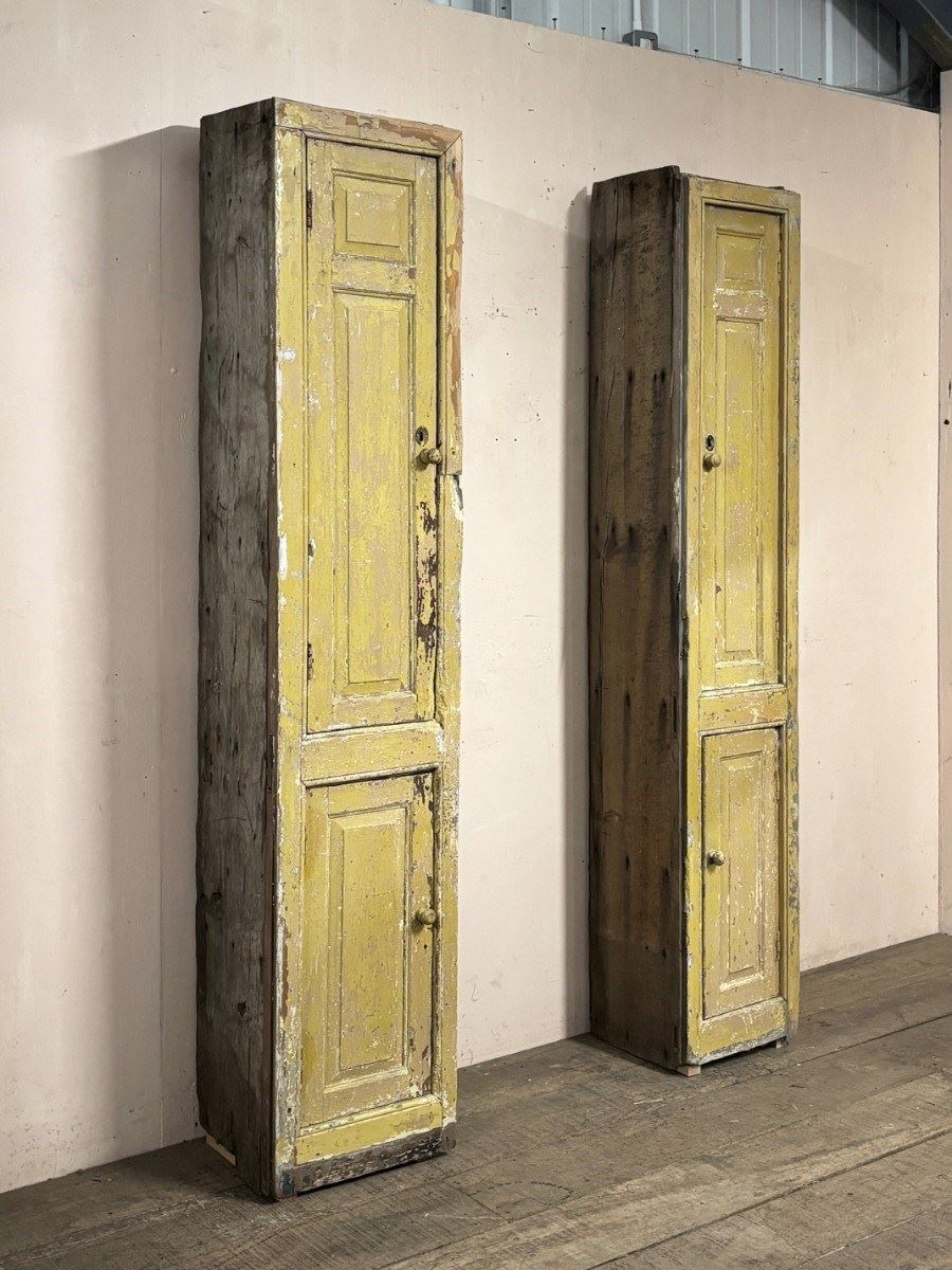 Very hard to find pair of 2 door shelved cupboards retaining original paint. These were removed from a house in the Scottish borders, and were originally fitted flush either side of a range, meaning only the cupboard fronts were visible, the rough cut sides hidden in the wall.
