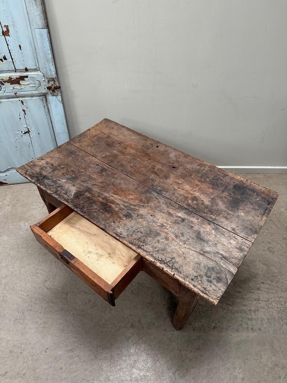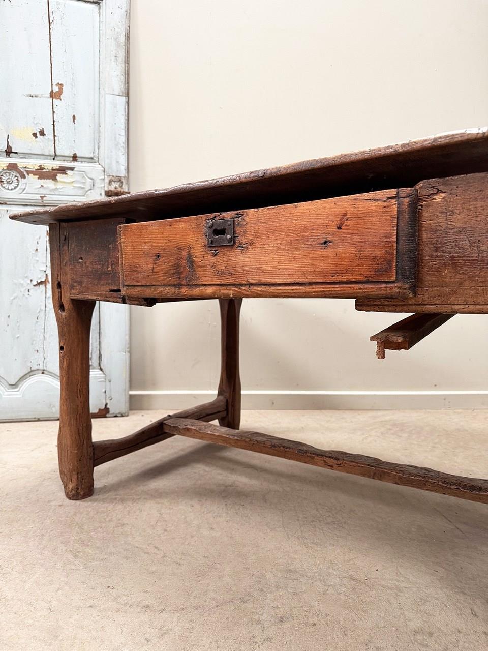 In need of restoration, this is a fabulous 2 plank top table with chamfered legs, stretcher base and a front drawer.