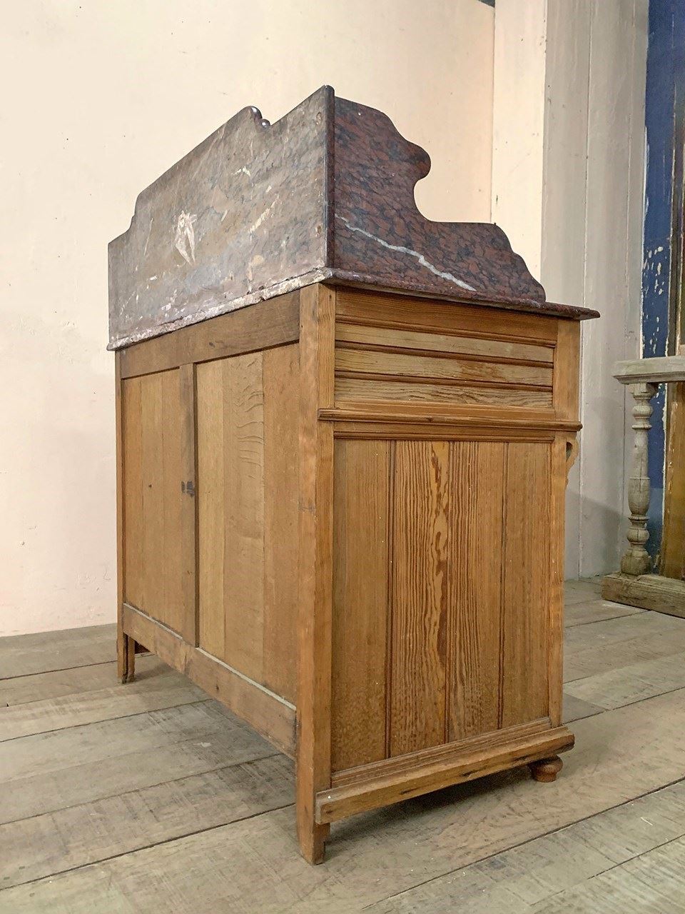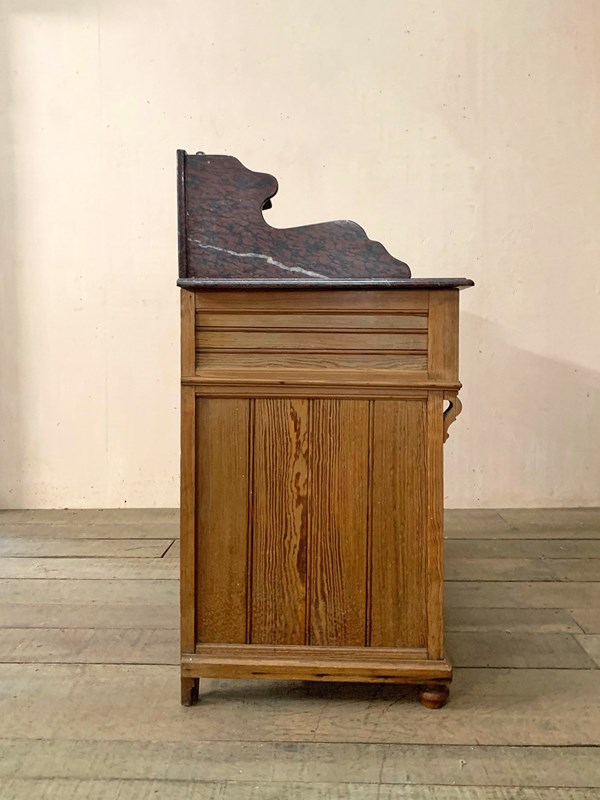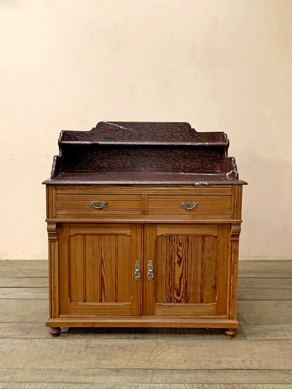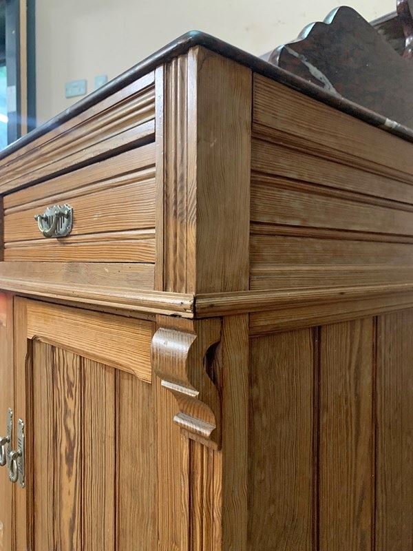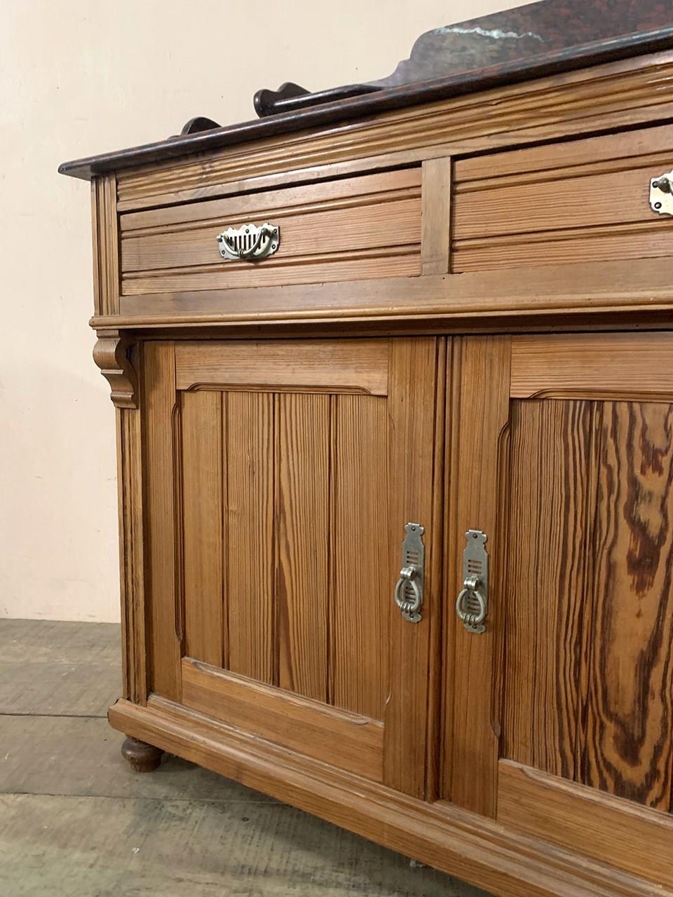 Pitch pine washstand with two upper drawers and a lower cupboard storage area, all with brass handles and pulls.