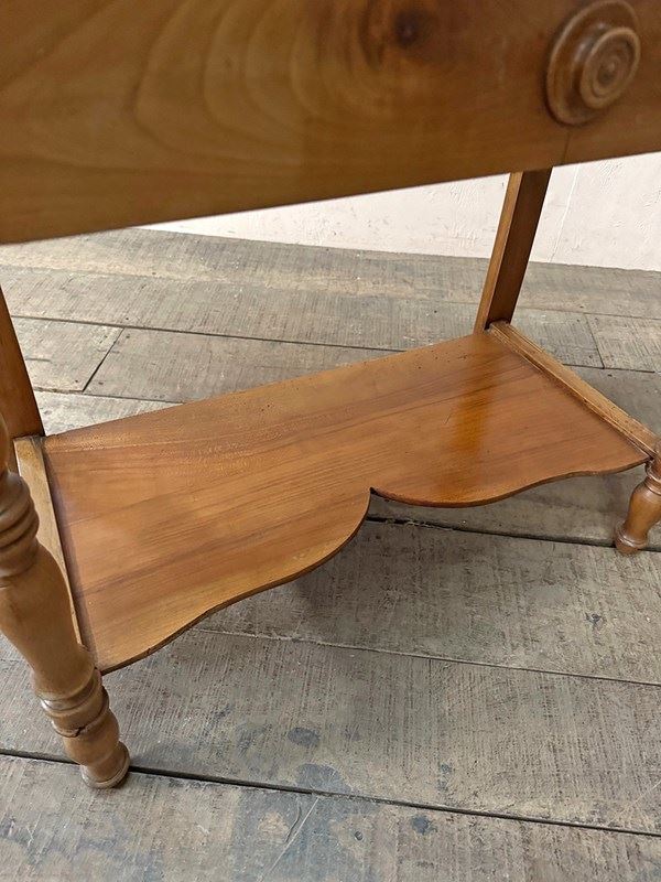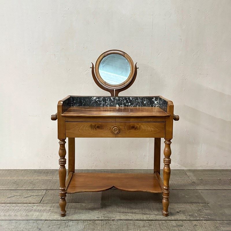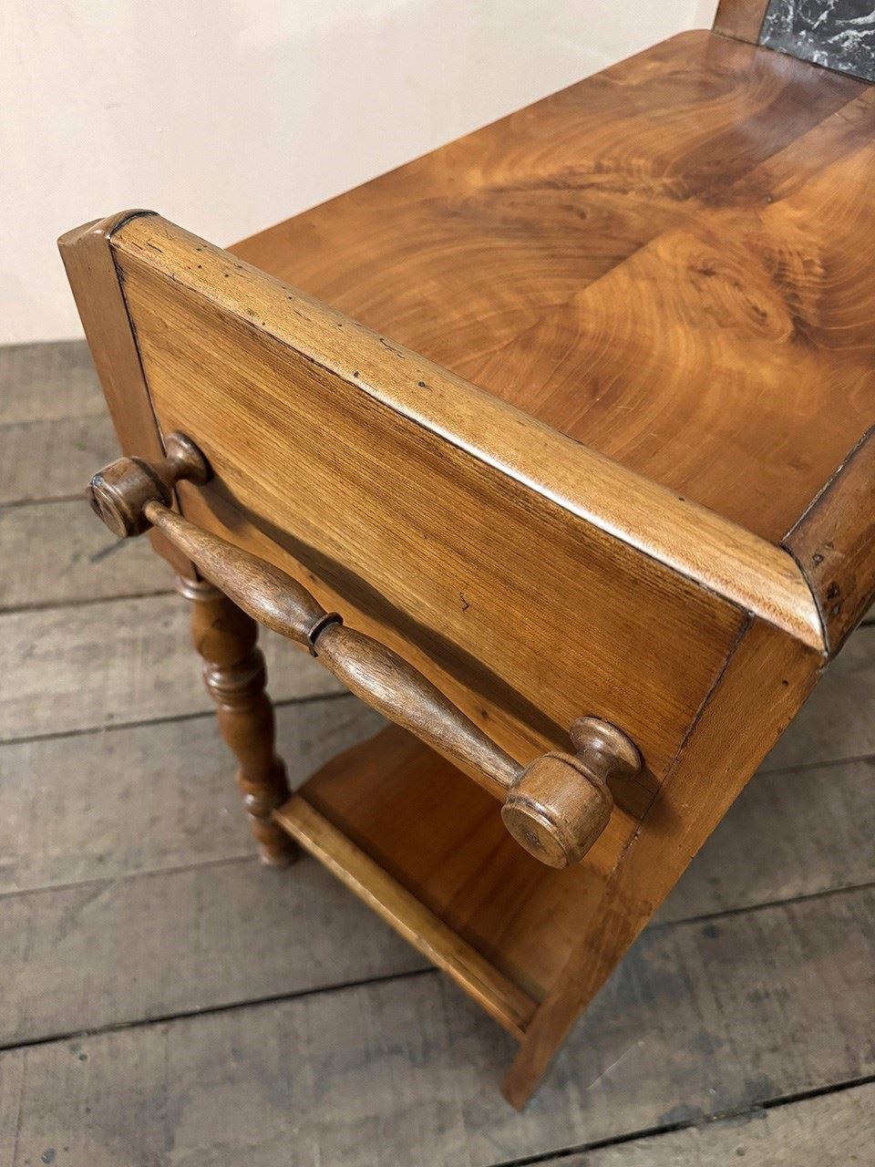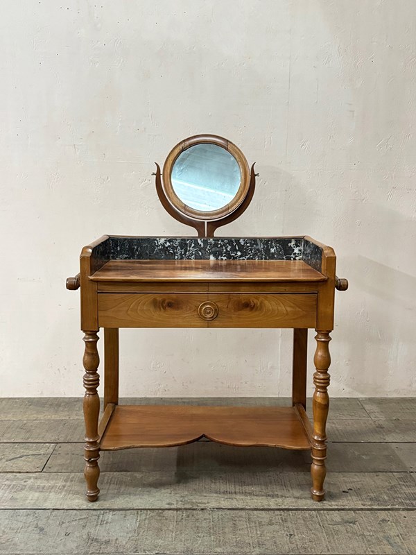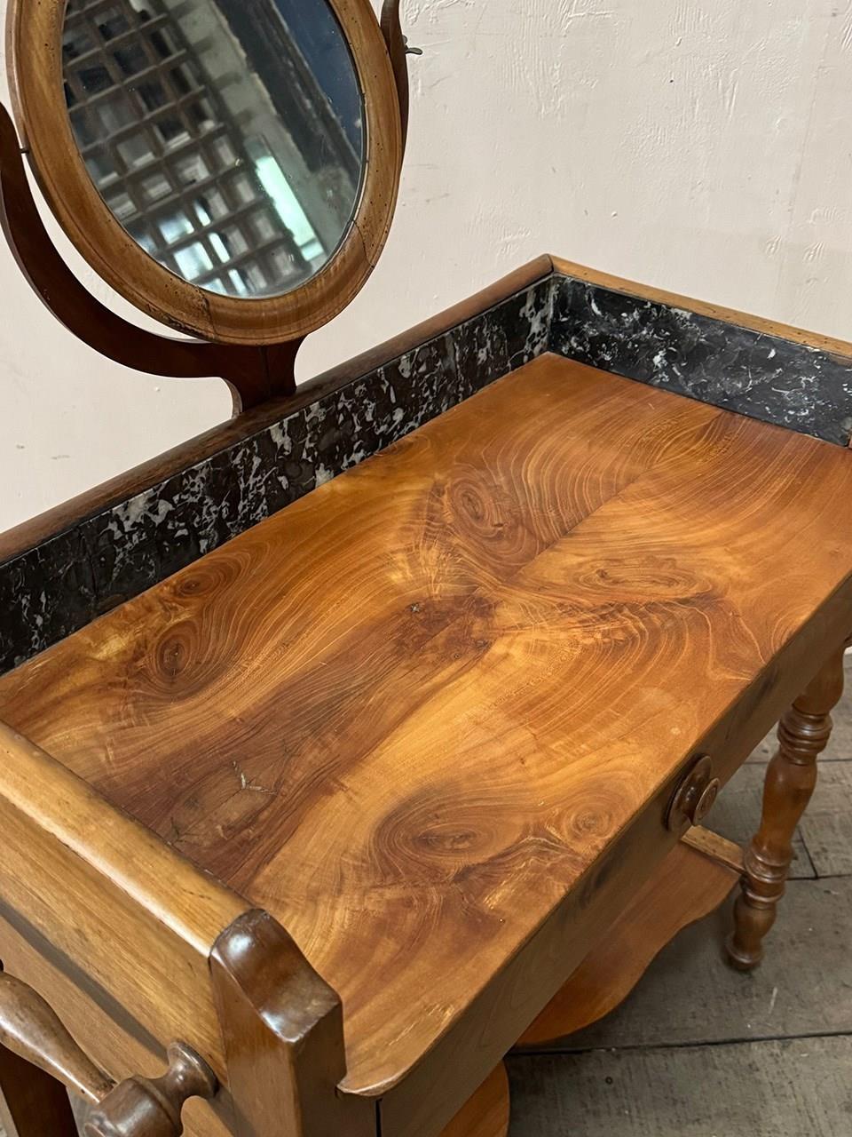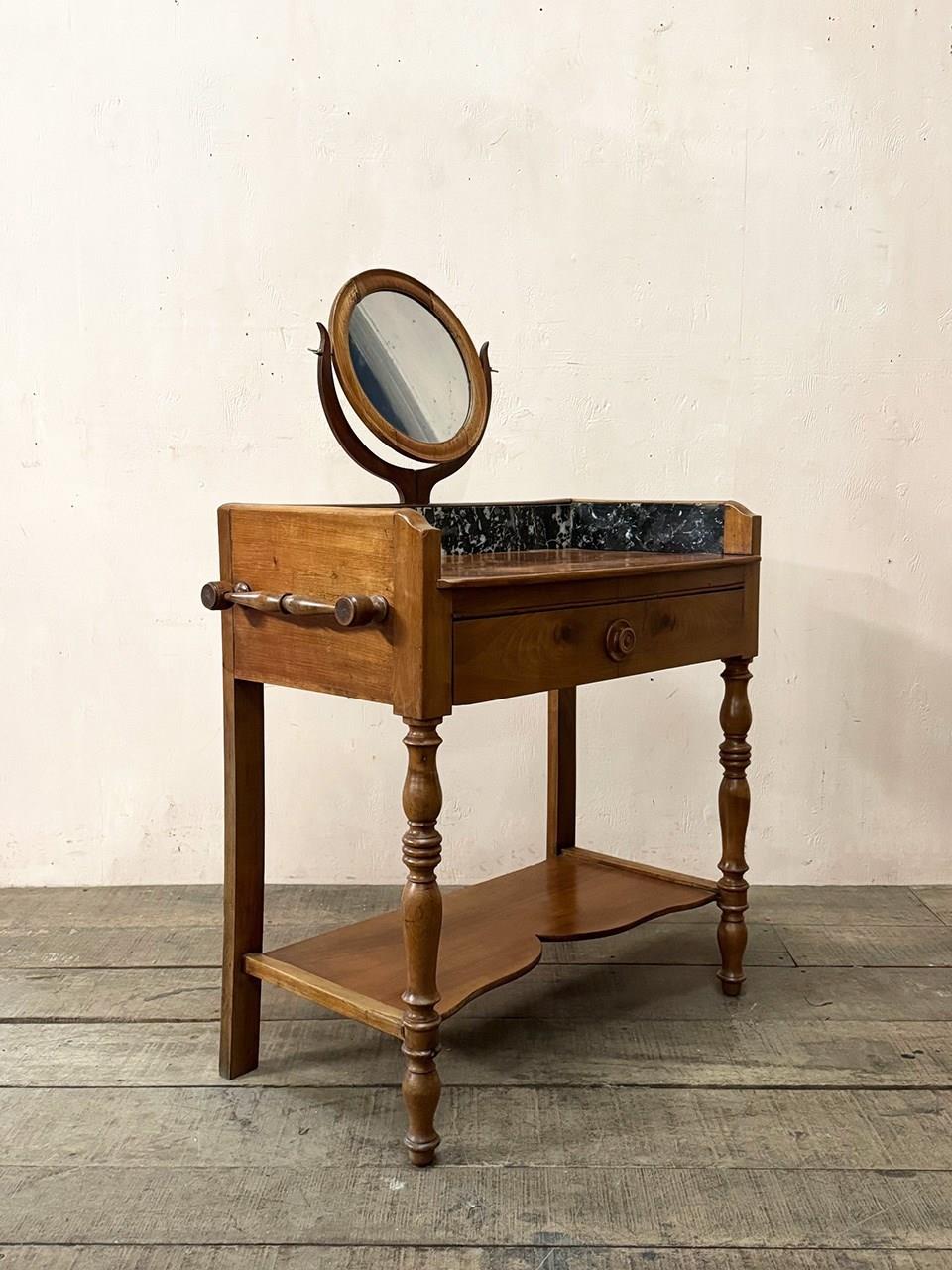 Petite walnut washstand with a black and white marble upright and wide front drawer.