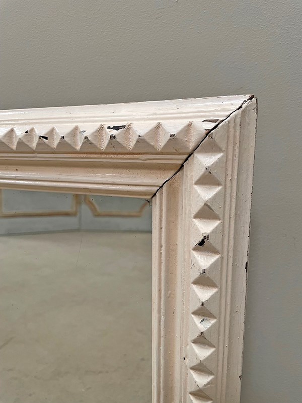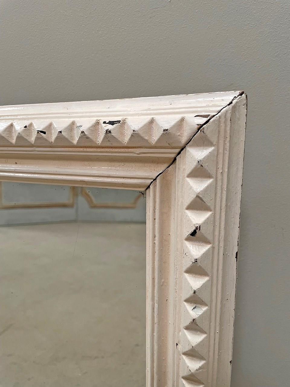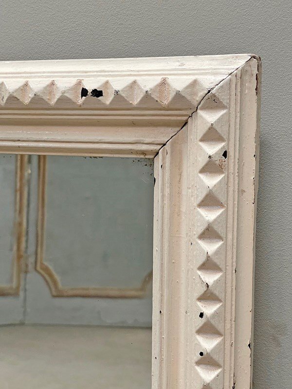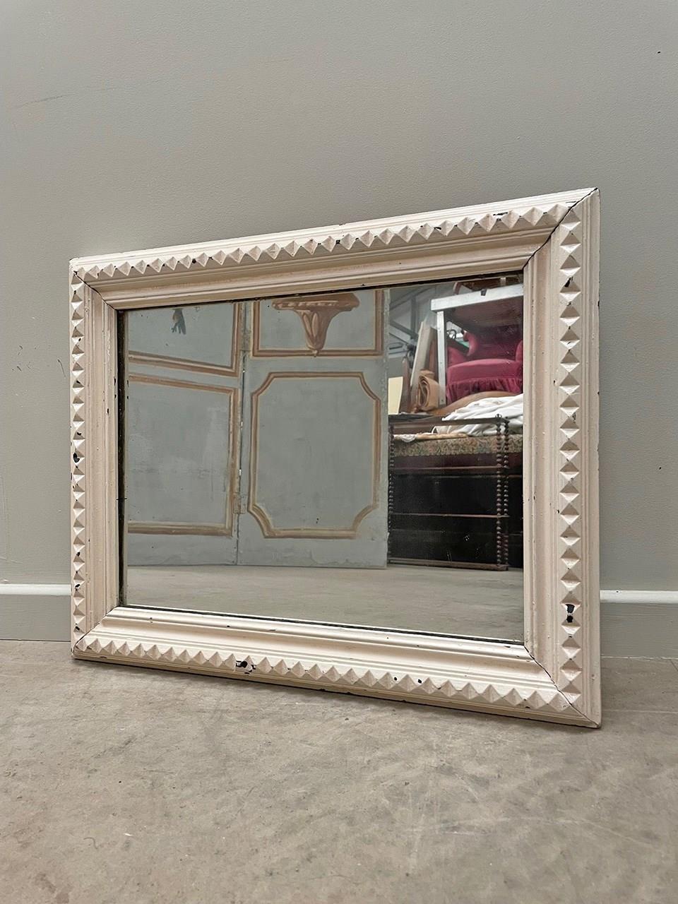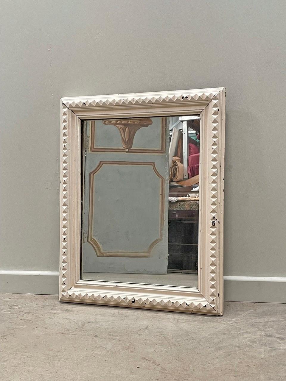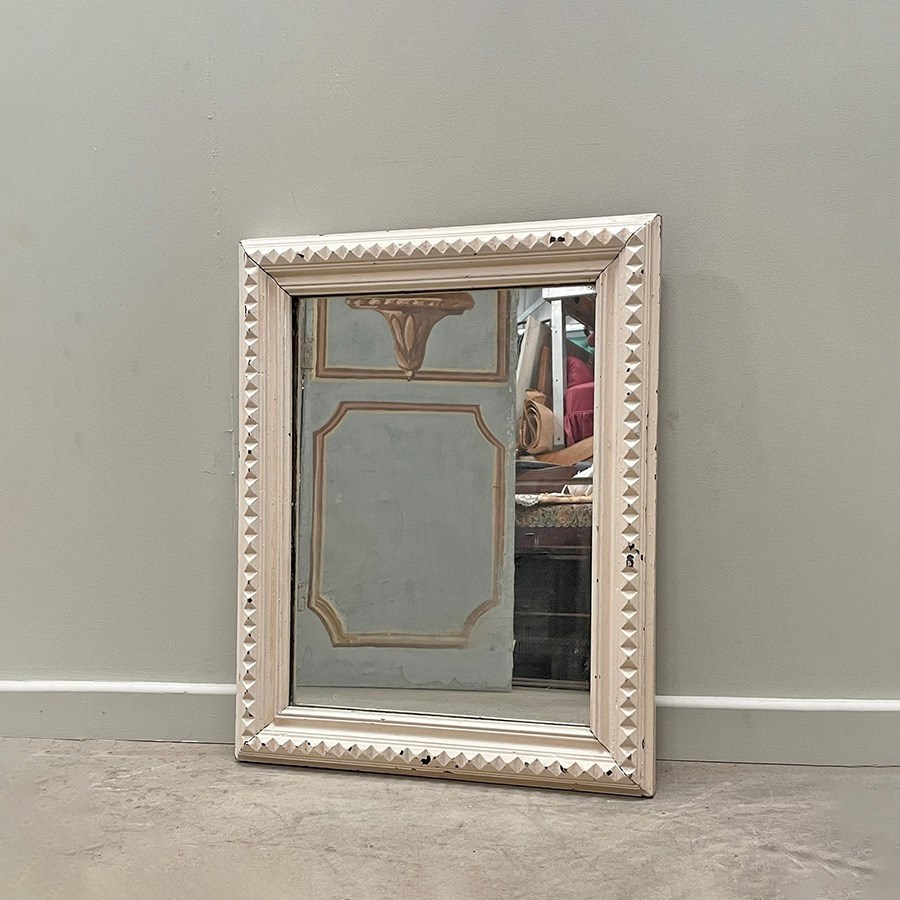 A small and slightly distressed mirror with a carved geometric pattern around the frame.