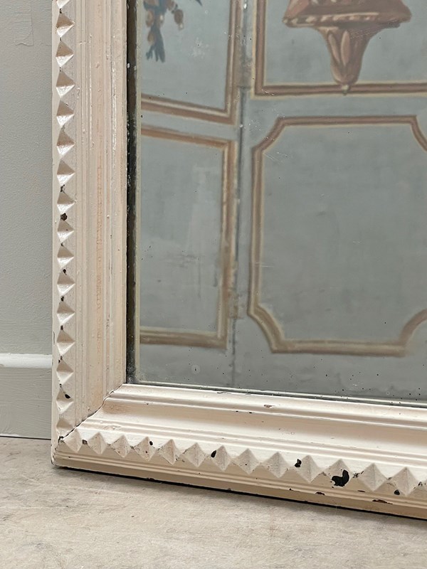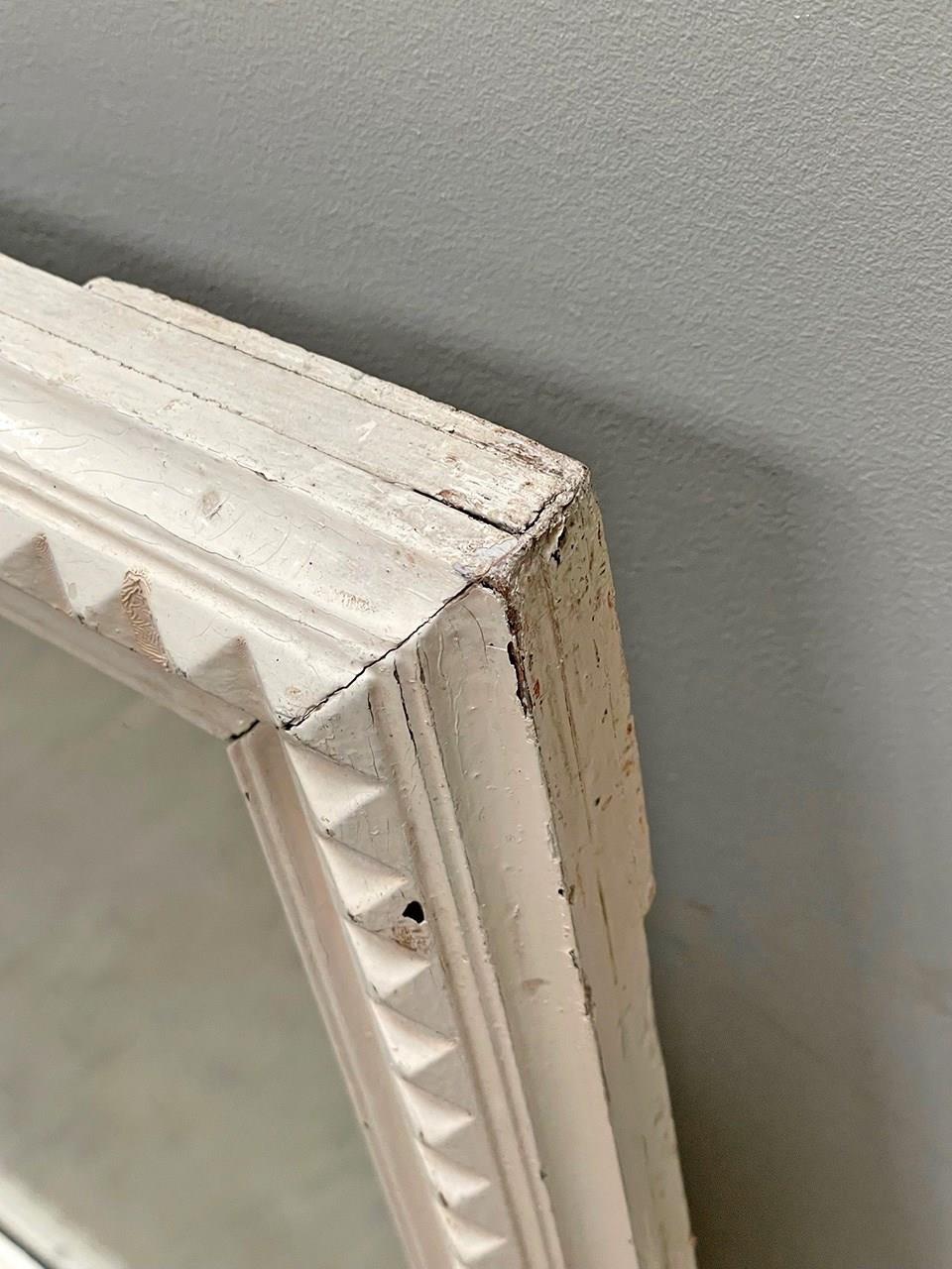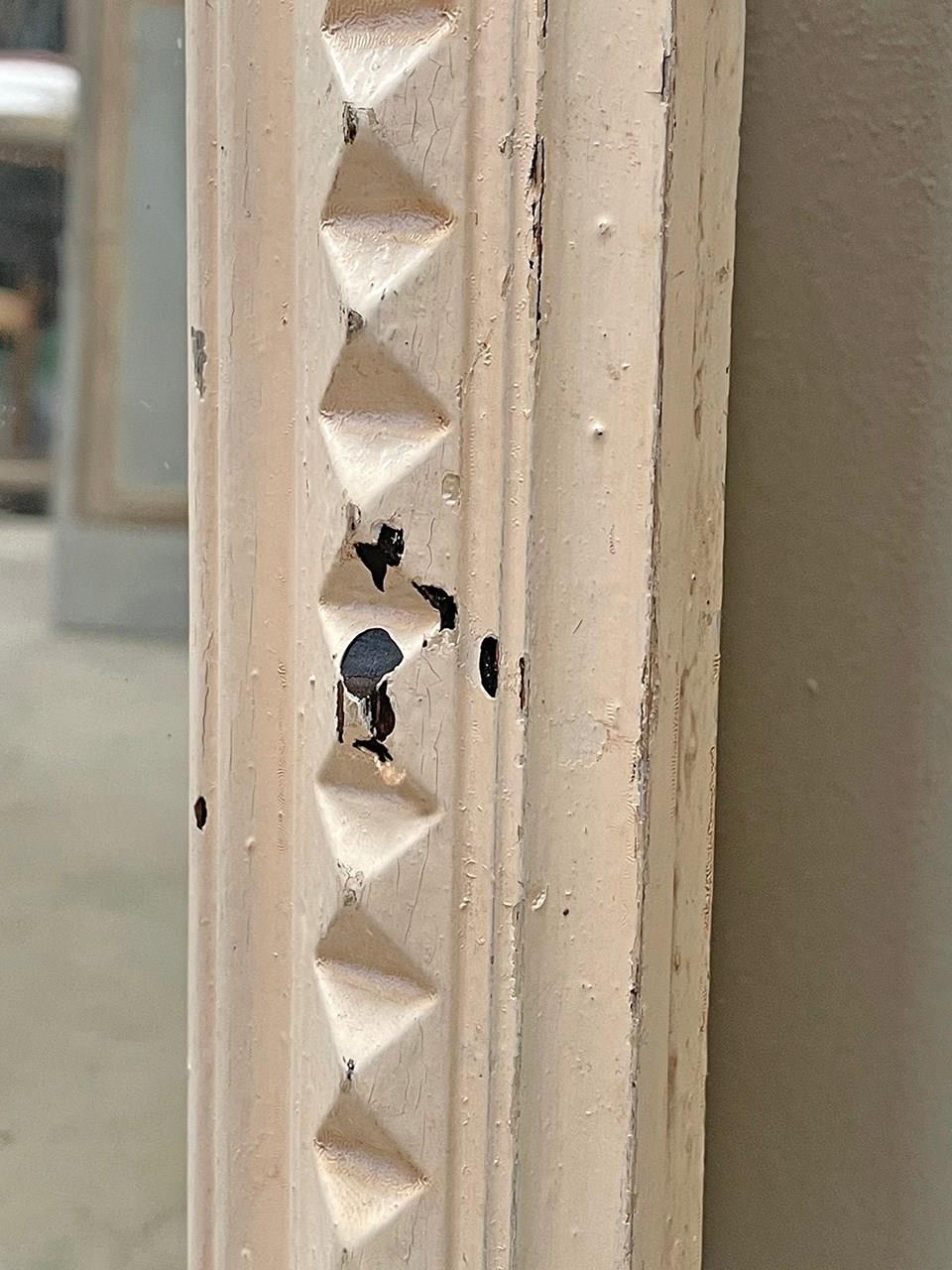 The off-white paint is chipping away in places and there is light foxing on the glass.