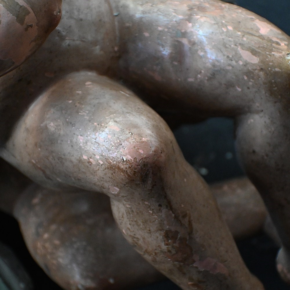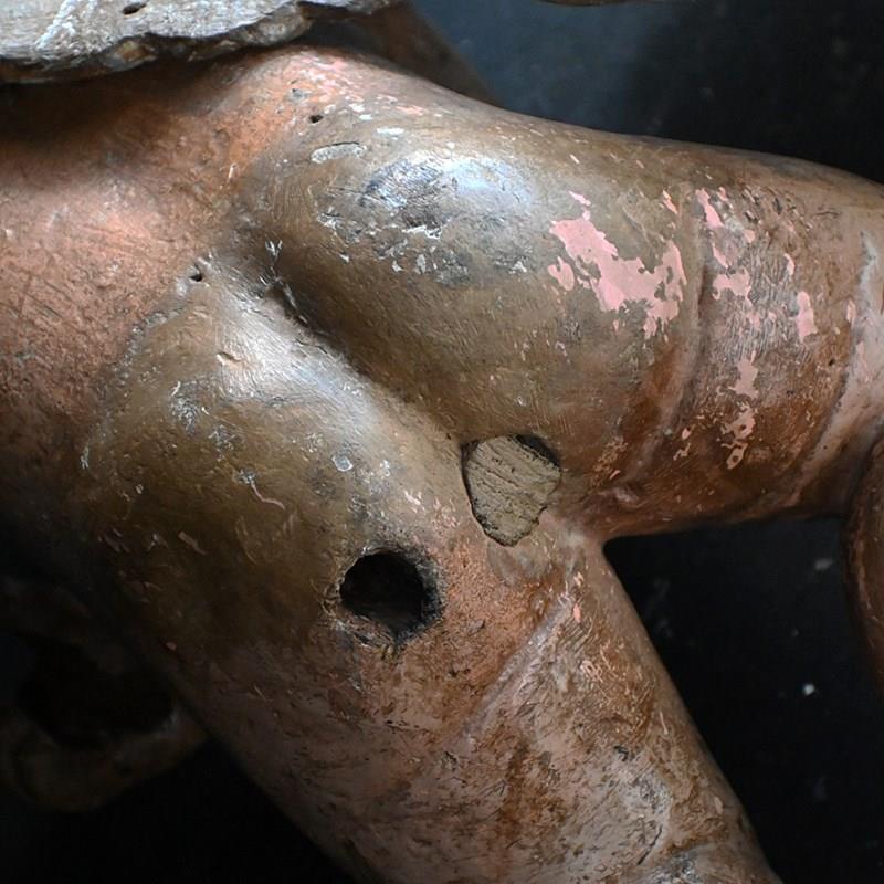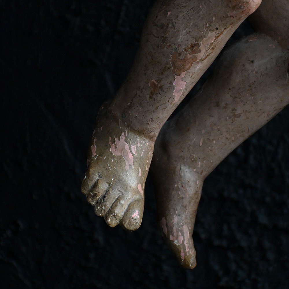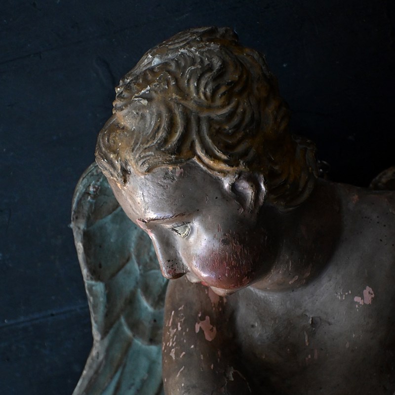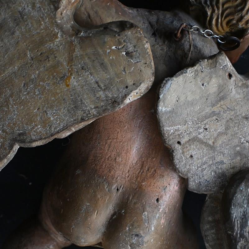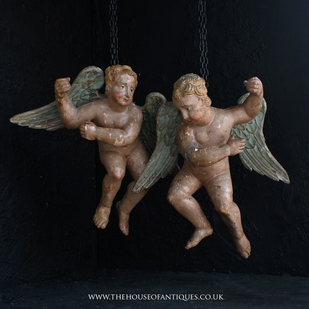 A rare and highly decorative pair of late 18th century hand carved large scale matched pair angels. All hand paint is still original as of these examples date. With hanging hooks and small chains still in place. The wings are separate to the figures but firmly in please with their original nails as shown. Weighing roughly 5kg each.