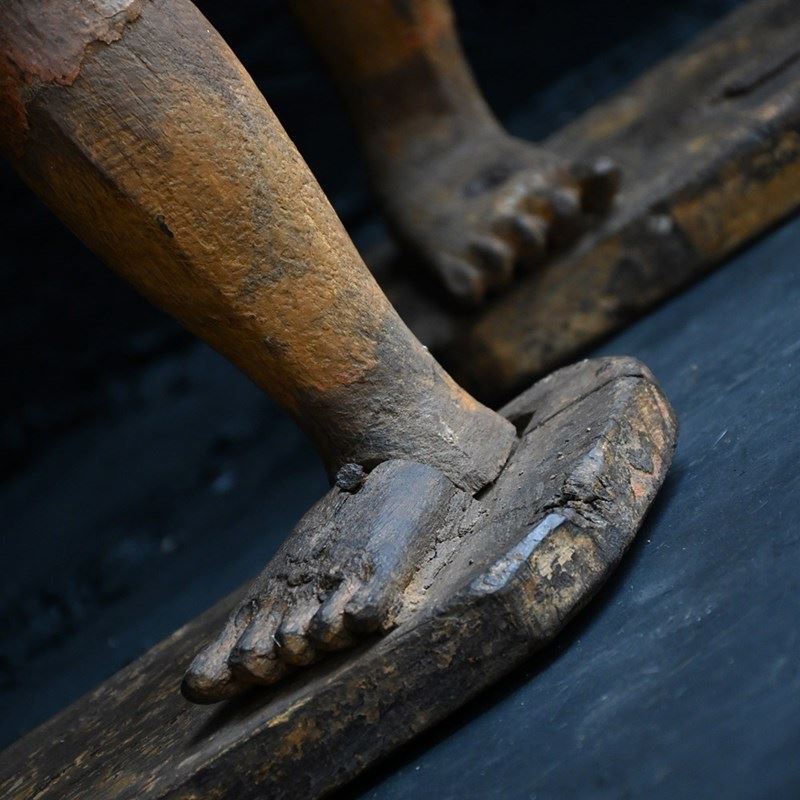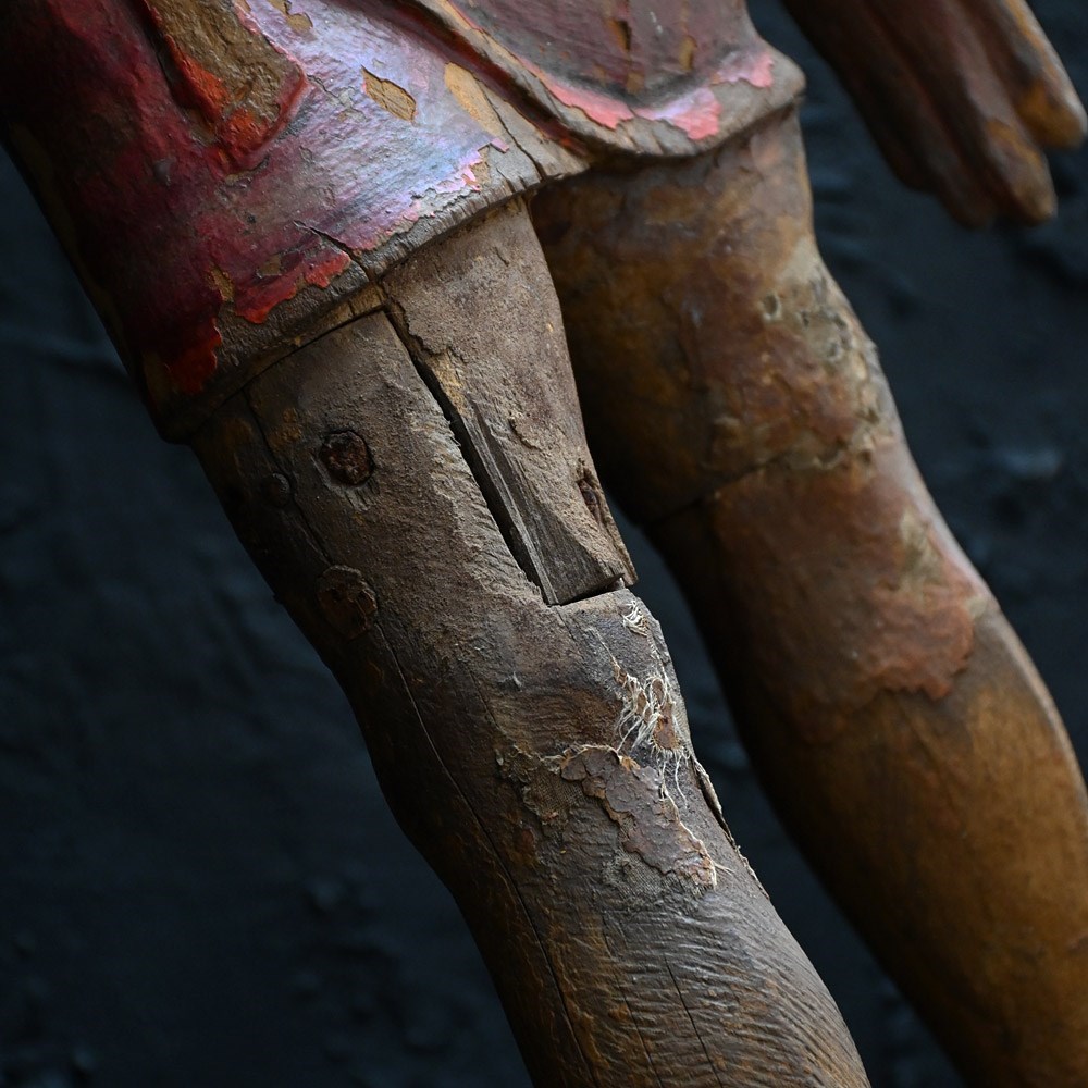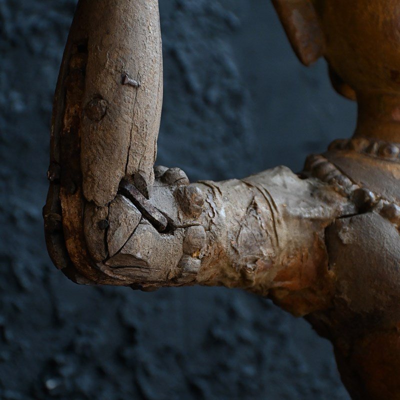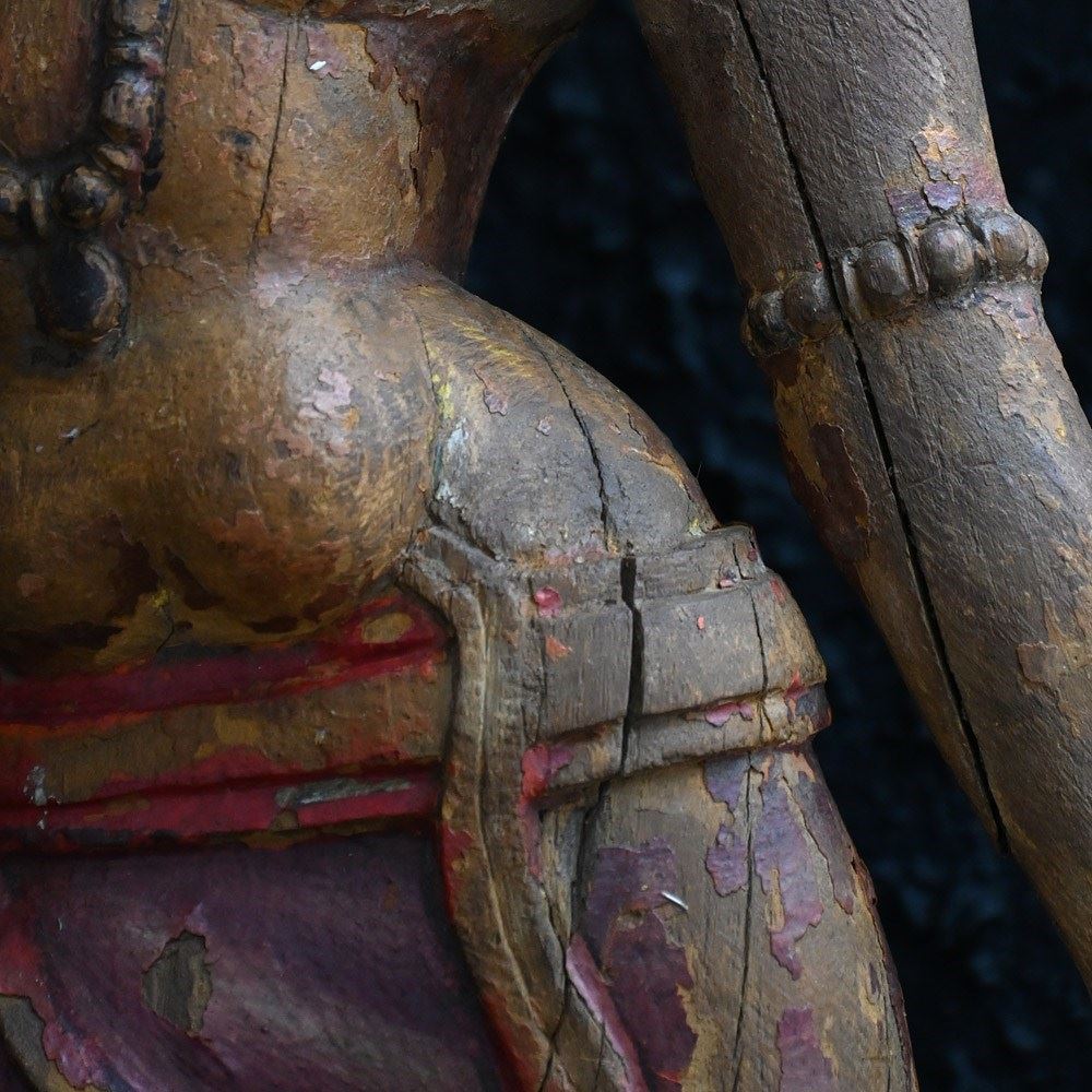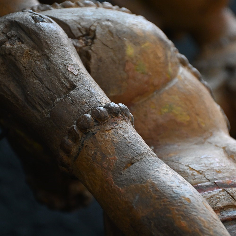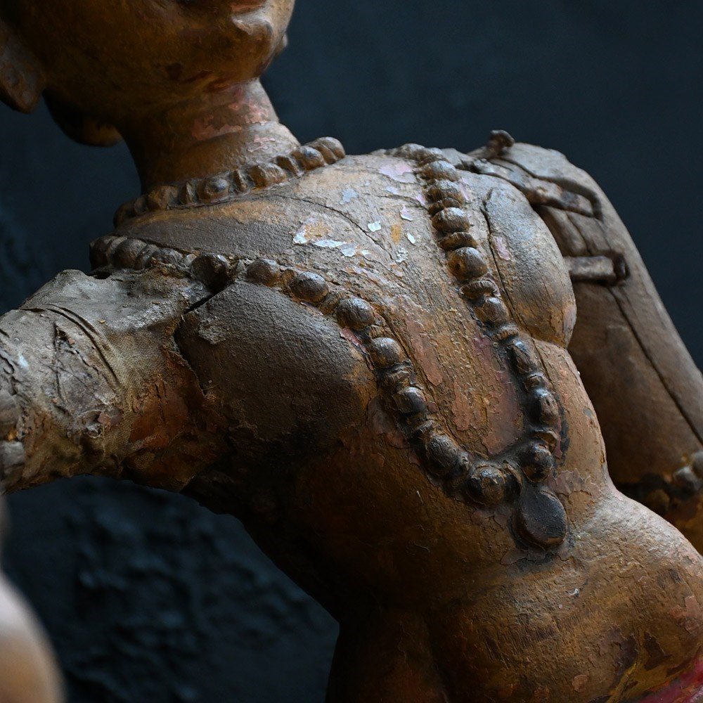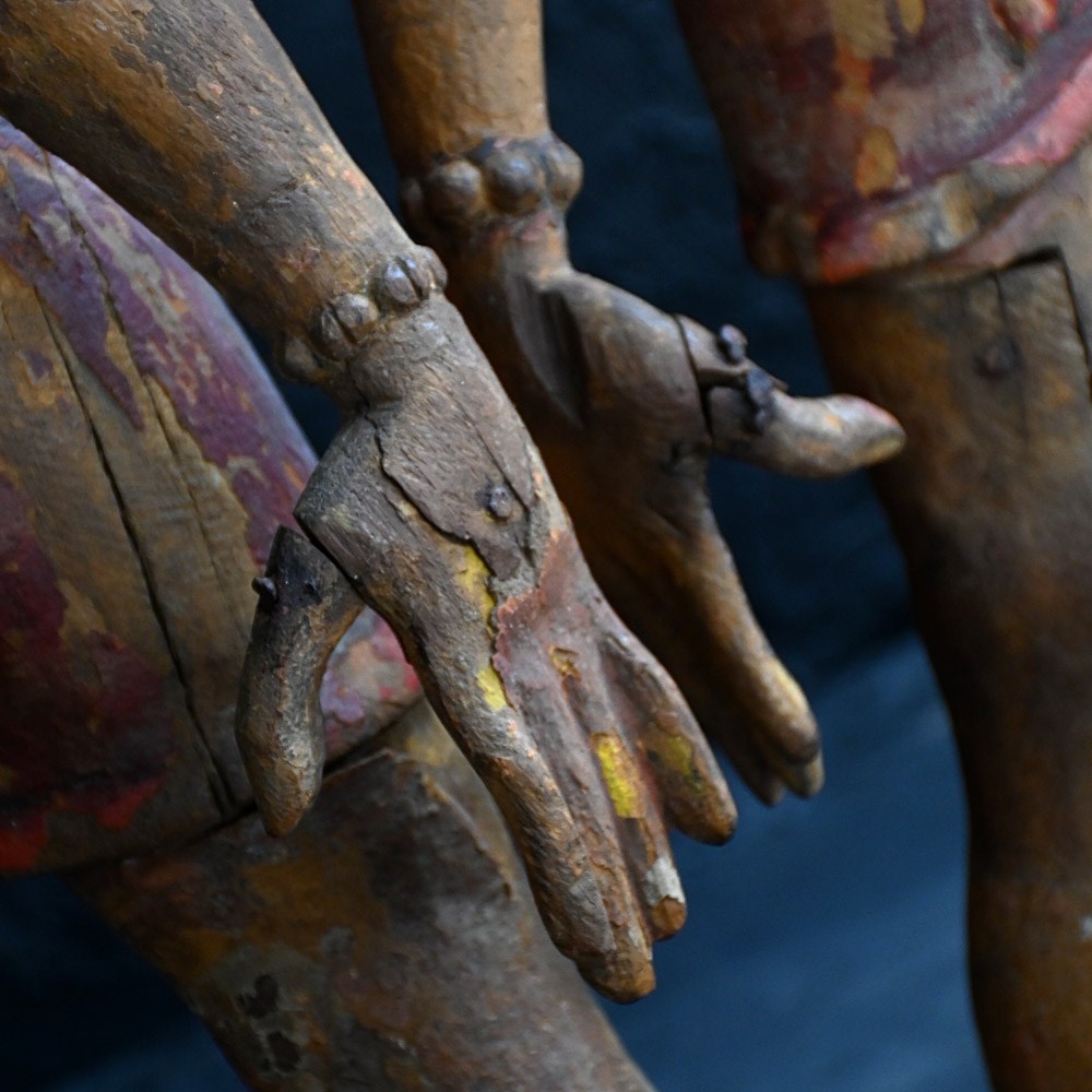 Dated to the later part of the 19th Century this matched pair of Indian temple processional figures stand on their original stamped bases as shown. With support hooks to the rear to which they would have been attached to a large processional set of sorts. Hand carved detail across both these figures with old metal rivets and nails where old repairs have taken place (firmly in place). Some areas still have canvas material covering fewer flexible parts. A lot of the painted surface has faded over the years, but the colour left is firmly in place.