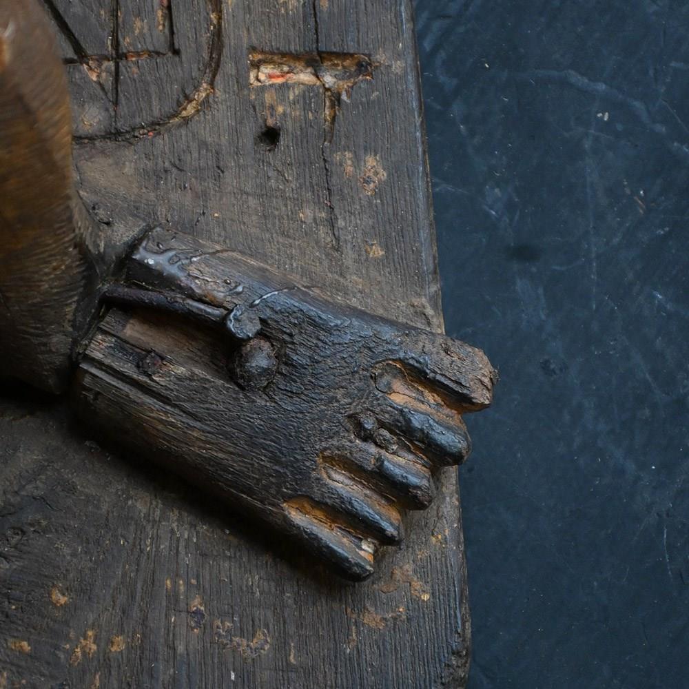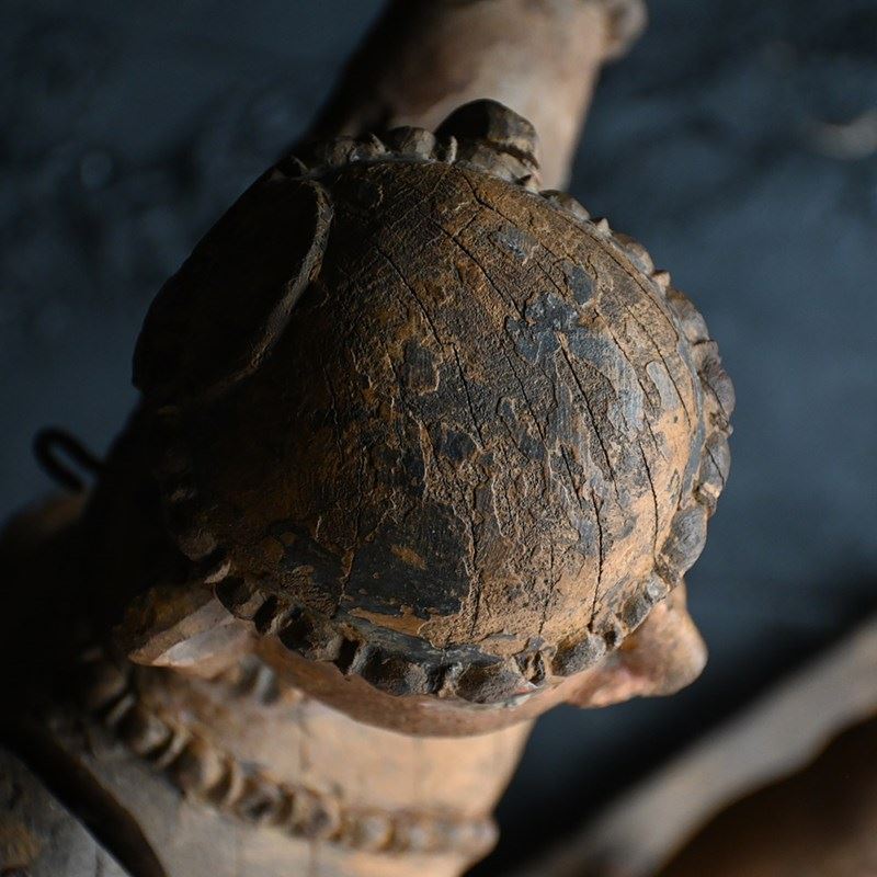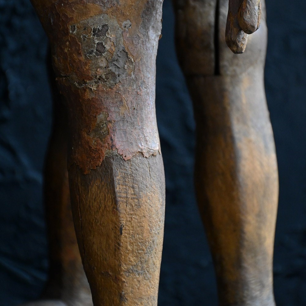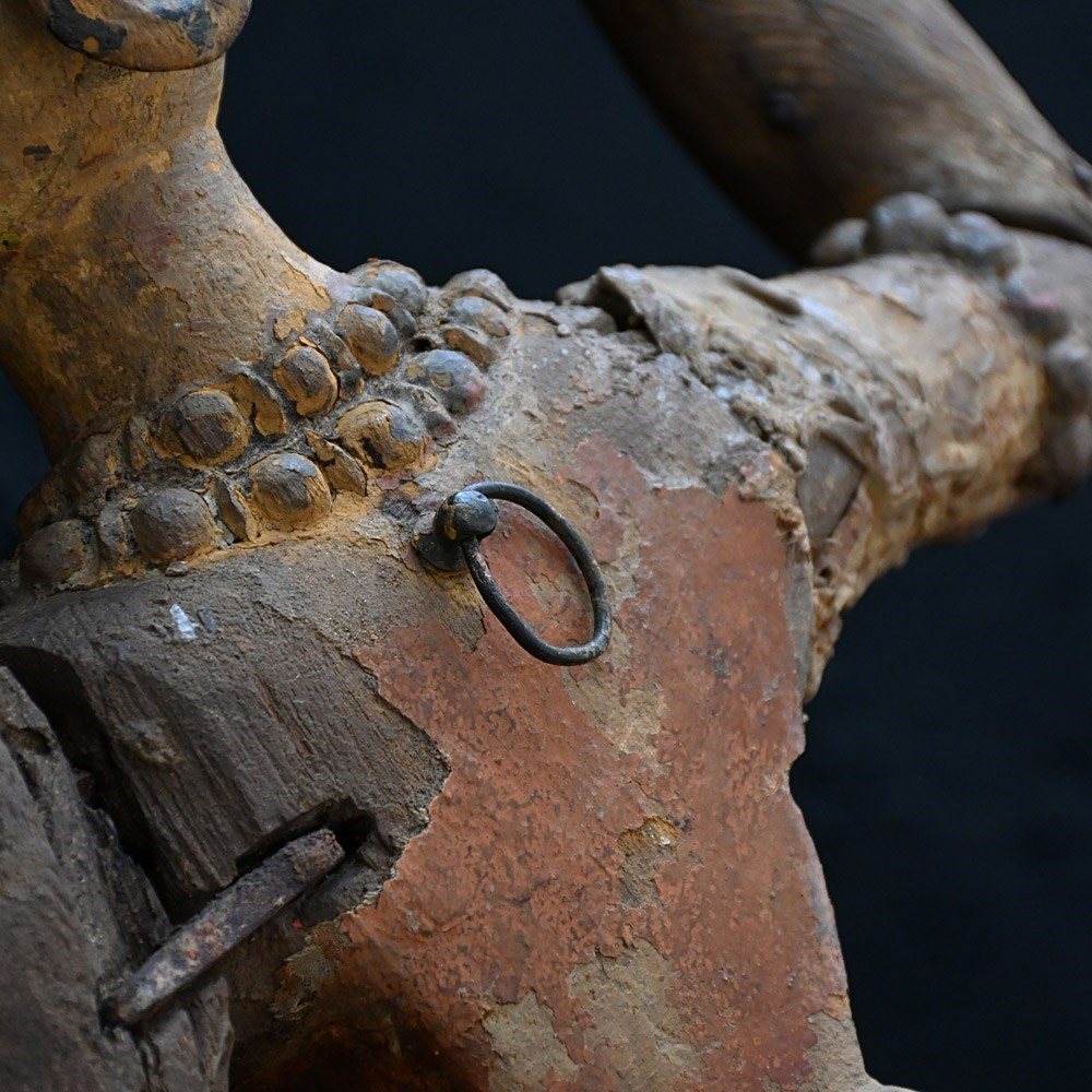 These are solid object with lots of surface wear and missing detail as shown. Numerous old nails and metal rivets are in place where old repairs have taken place as well as old dried out canvas sections to help support the repairs. Chipped and faded surface detail is present. Missing wooden surface detail is also present. Authentic antique examples with lots of age and use.