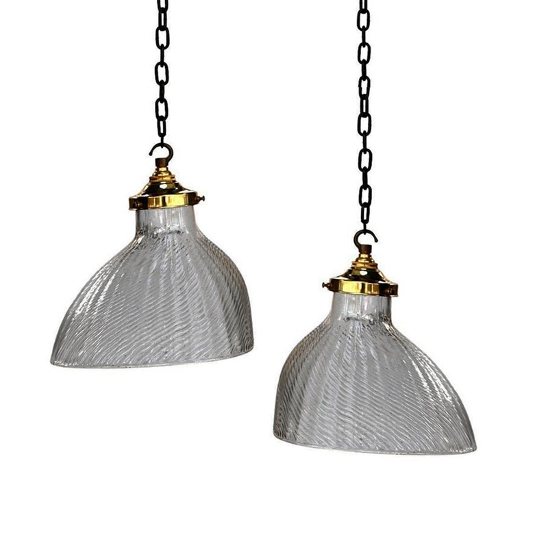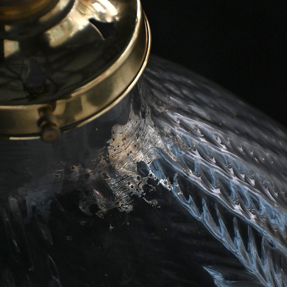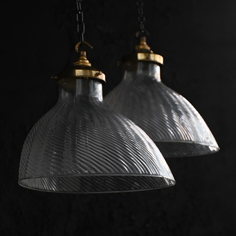 Likely to have been painted with reflective paint at some point but have been striped to reveal just the glass shades as shown. With new brass galleries for modern day use.