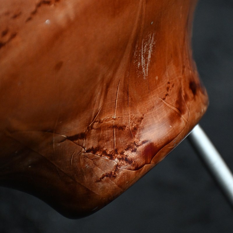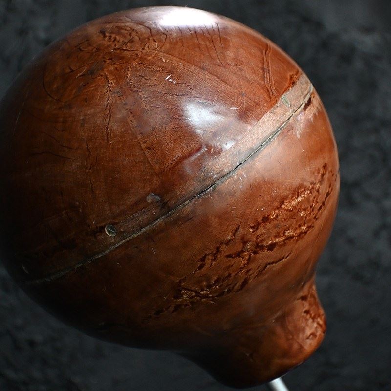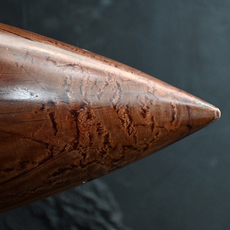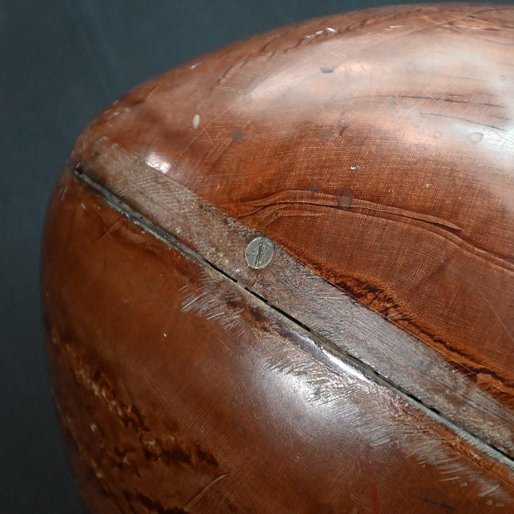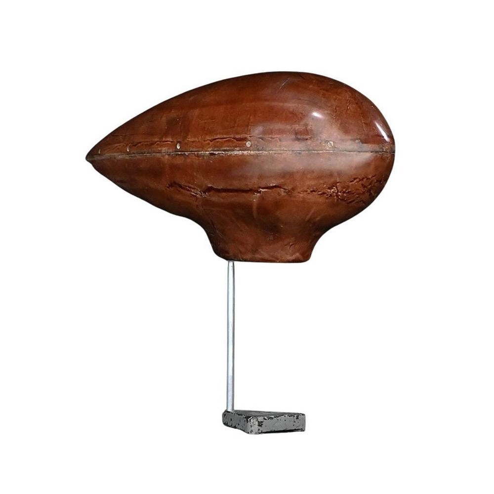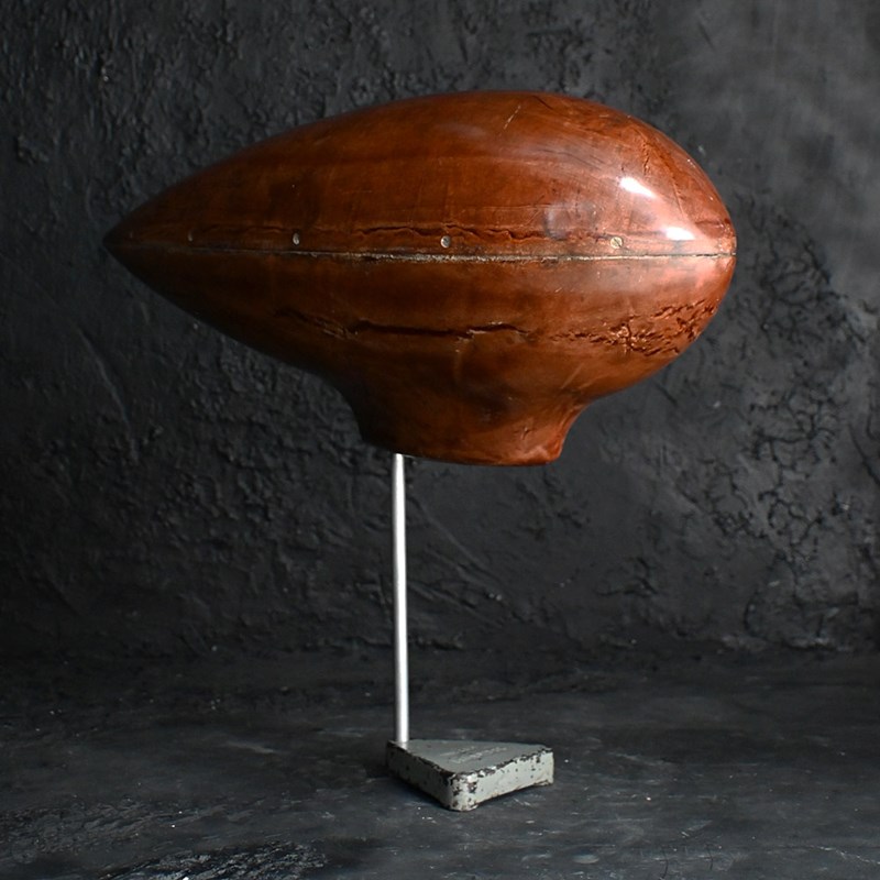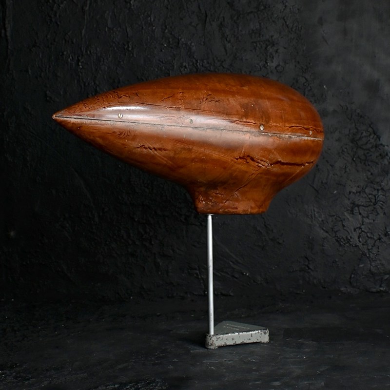 Rare, unusual and very sculptural. This item has it all, it may remind you of an alien’s head or model of a Zeppelin. When actually a similar example is housed in the Smithsonian Design Museum. This object is dated from the 1930 – 1940 and would have originally sat on top of a WW2 bomber plane and named a Radio Compass Loop Antenna. Made from coated fabric it would have supported the Stirling bomber to find its route and guidance as it flew in the air. A highly sculptural object recently uncovered from Cambridge university and still in its cast metal support base. A worn-out marking is stamped at the base of this form as shown.