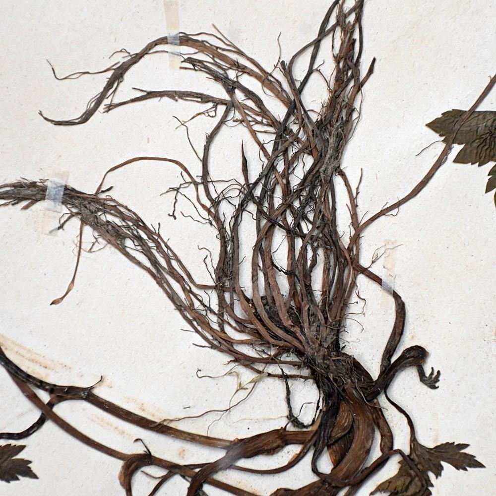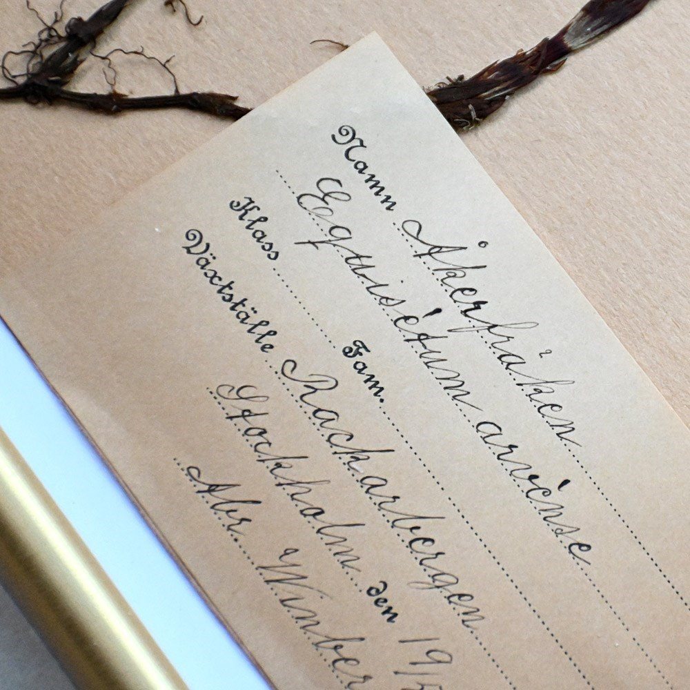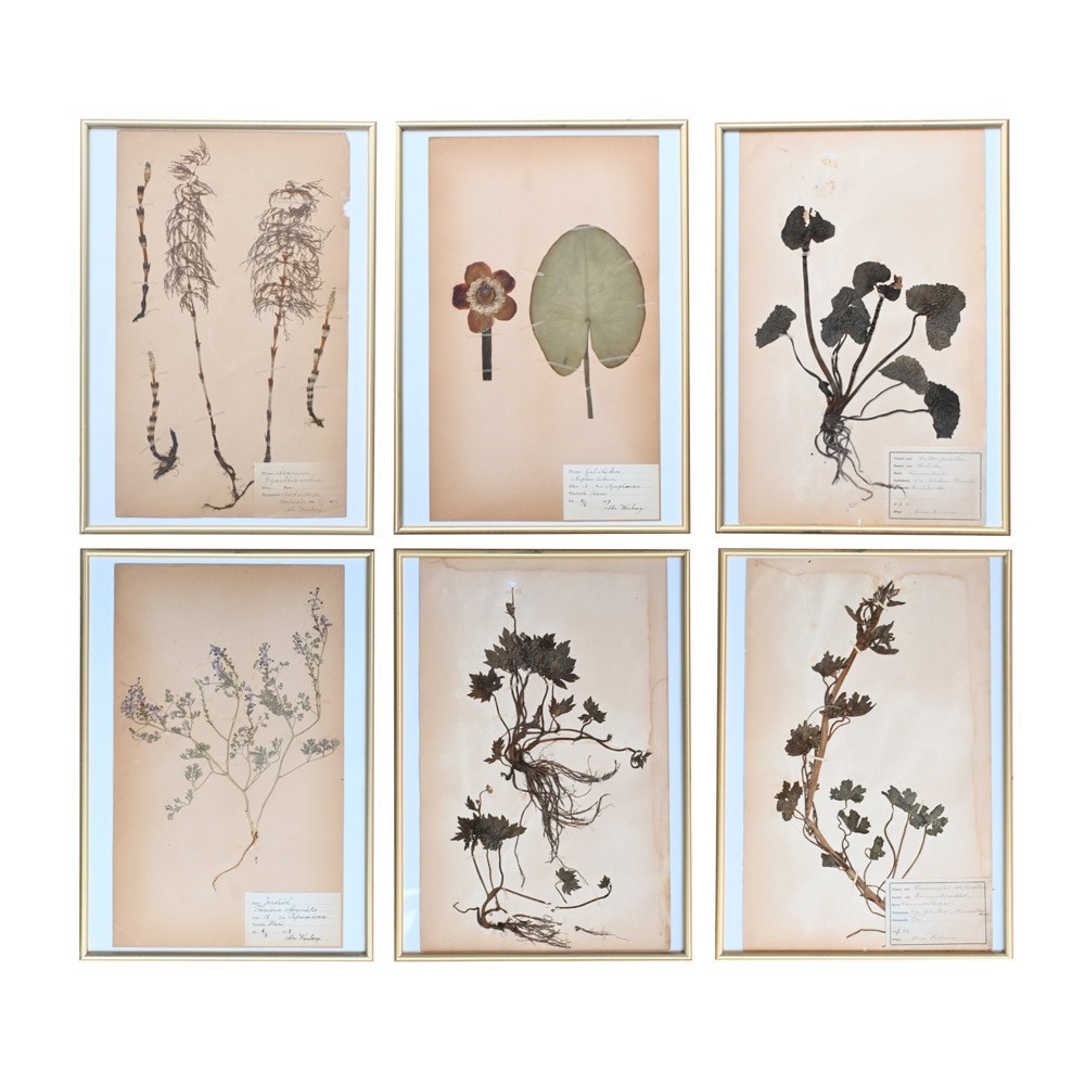 Six early 20th Century pressed botanic samples signed and dated 1908. Each example has a handwritten paper description of the specimen shown. Framed in acrylic gold front covered display and ready to be hung.
