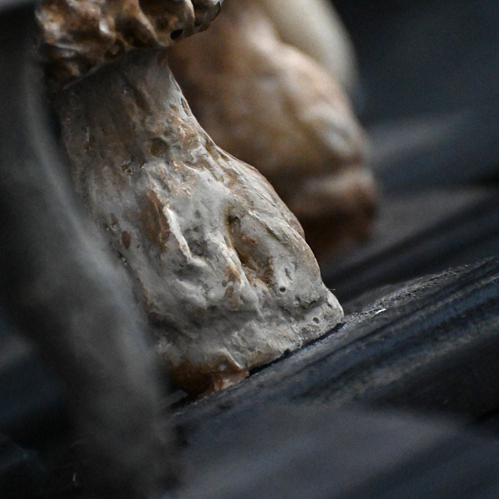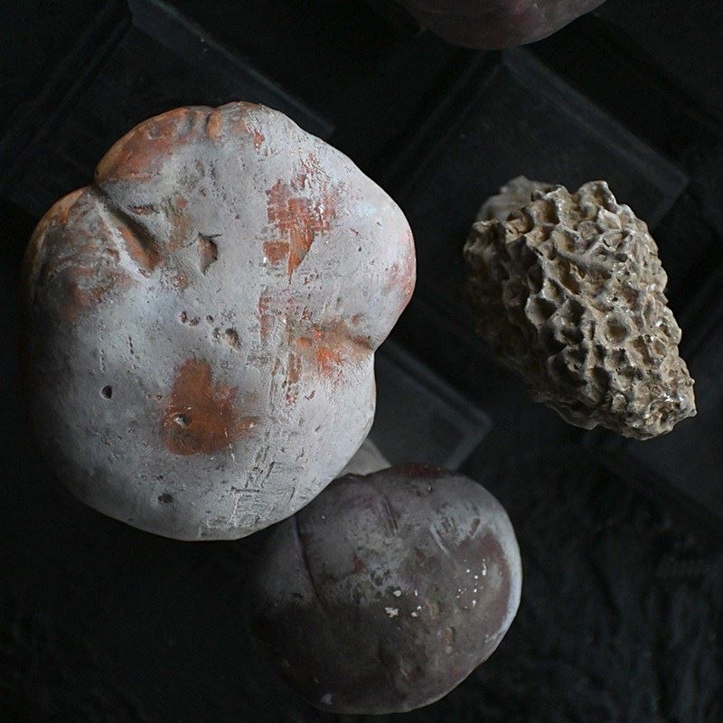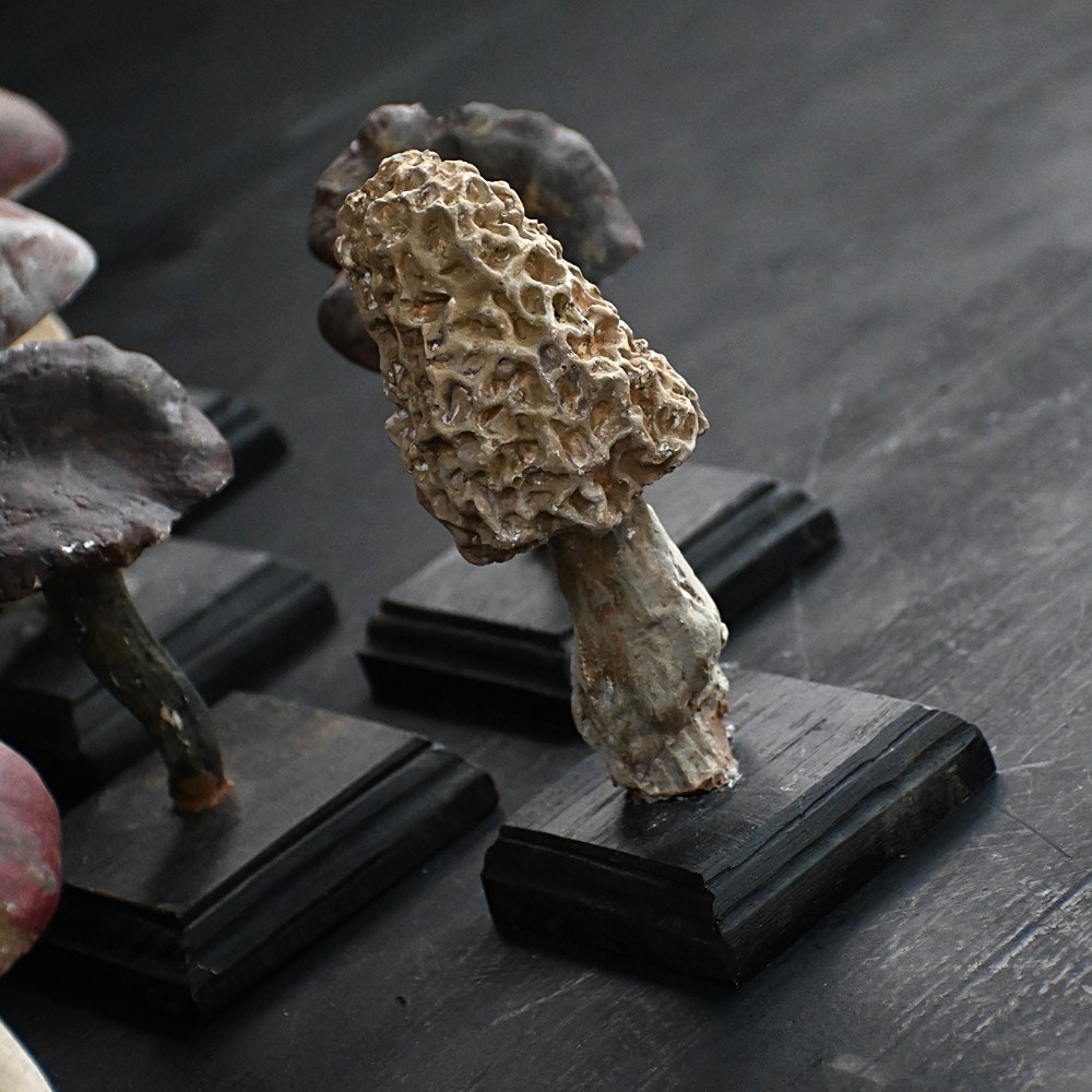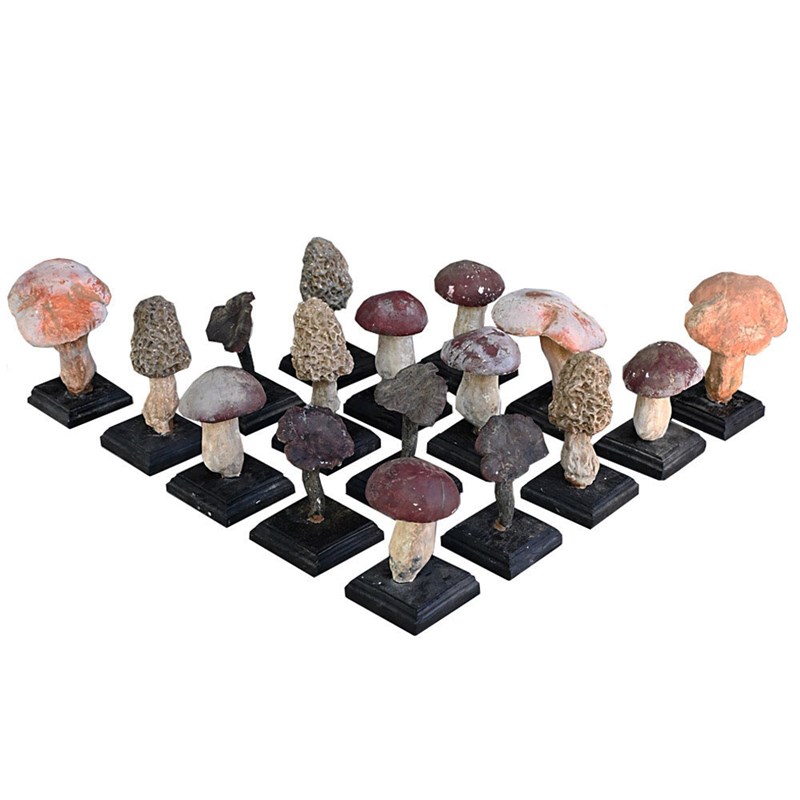 A set of seventeen hand crafted mid-20th century plaster and pine scientific / botanical mushroom specimens. Each specimen is attached to a pine wooden base and hand painted with detail.