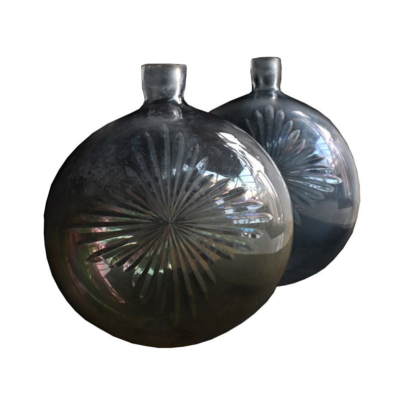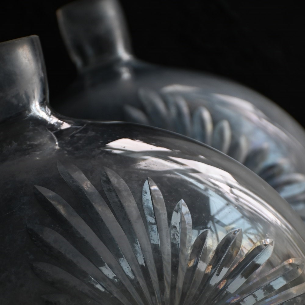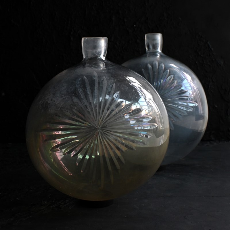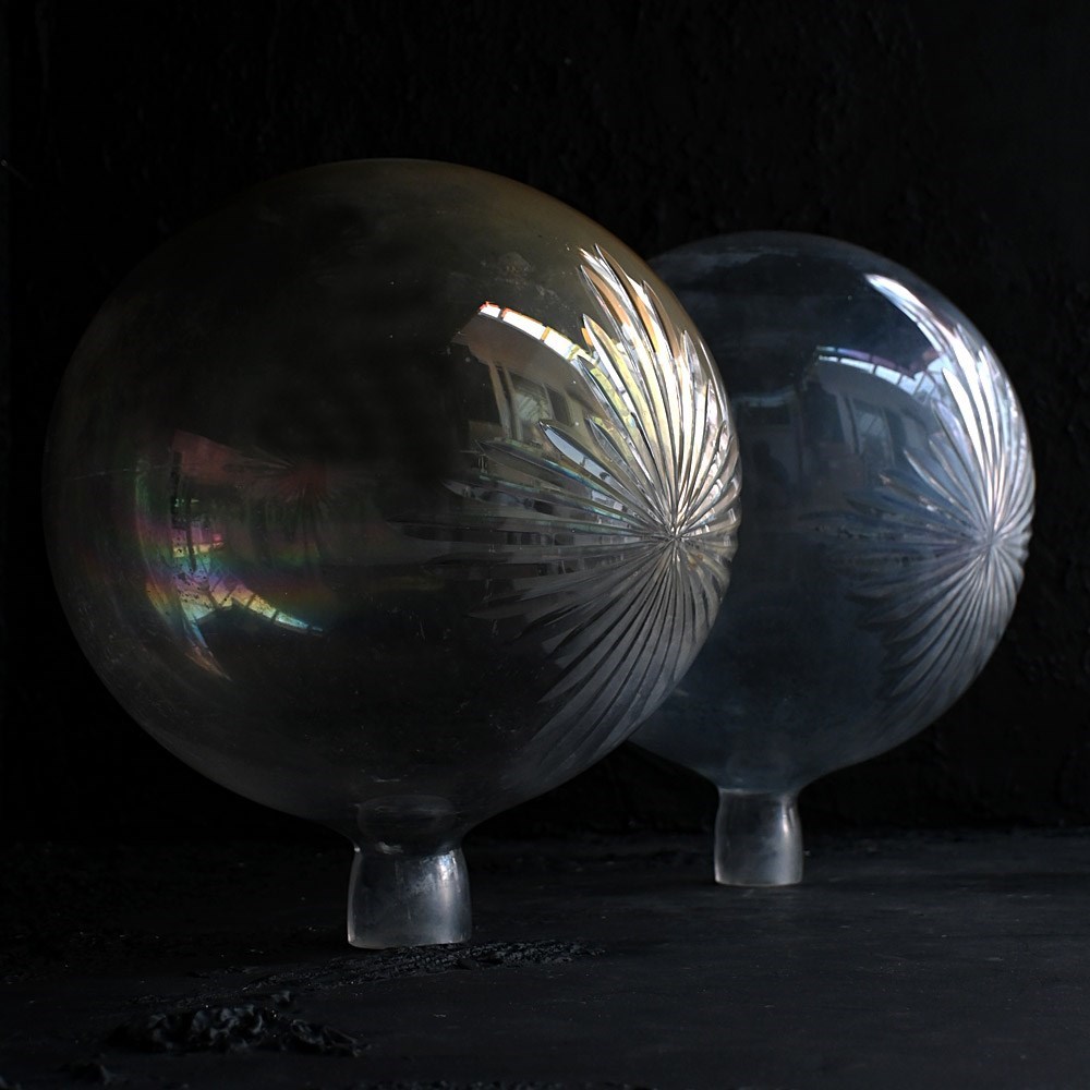 A huge pair of glass chemists advertising carboy, hand blown, with large wheel cut stars to the front, once filled with colourful liquid & graced a chemist window as part of an eye-catching advertising display.