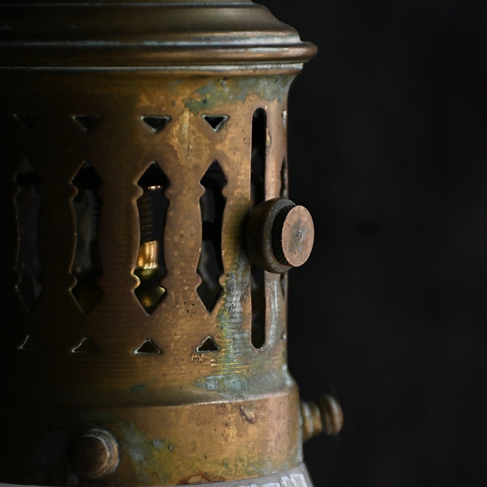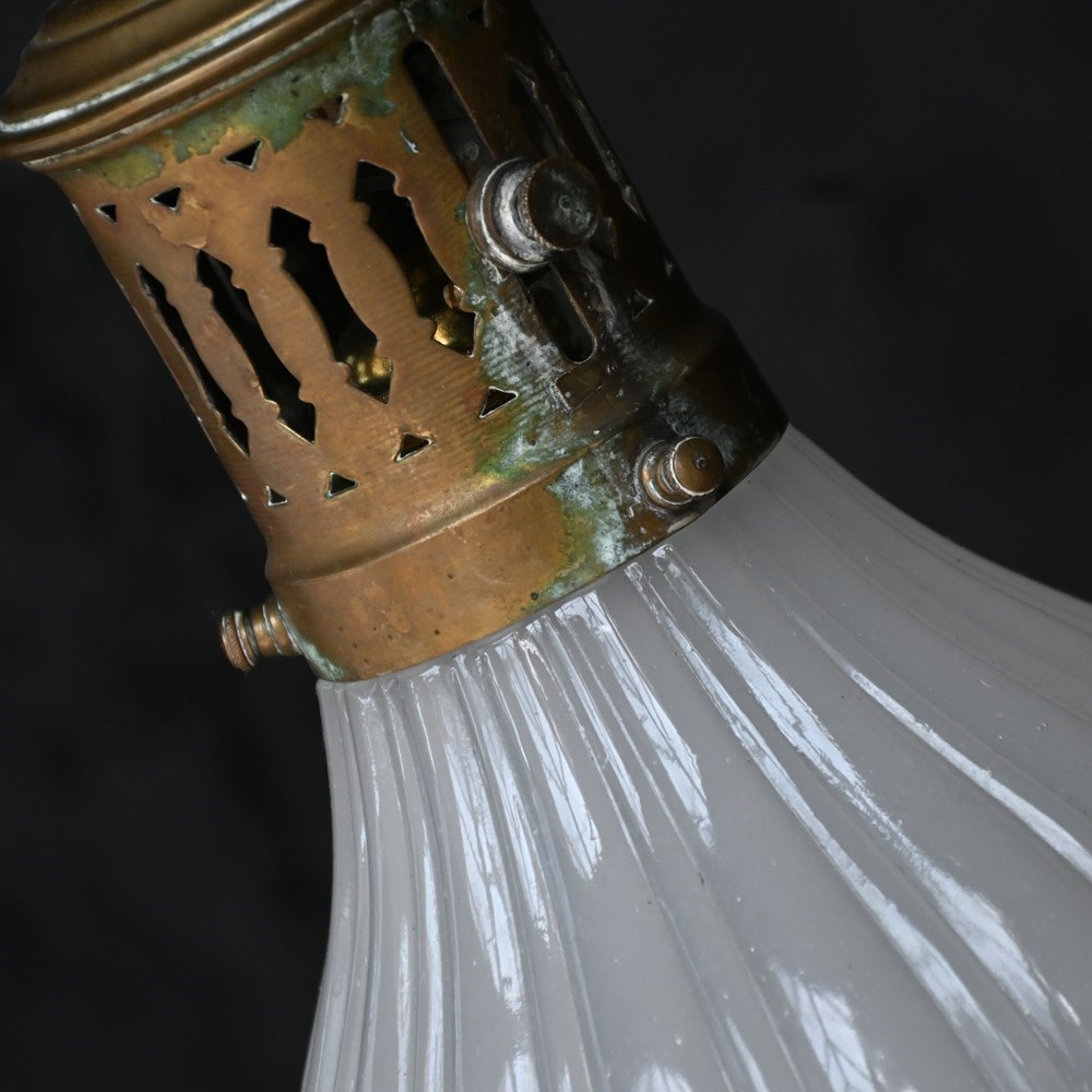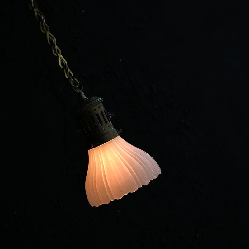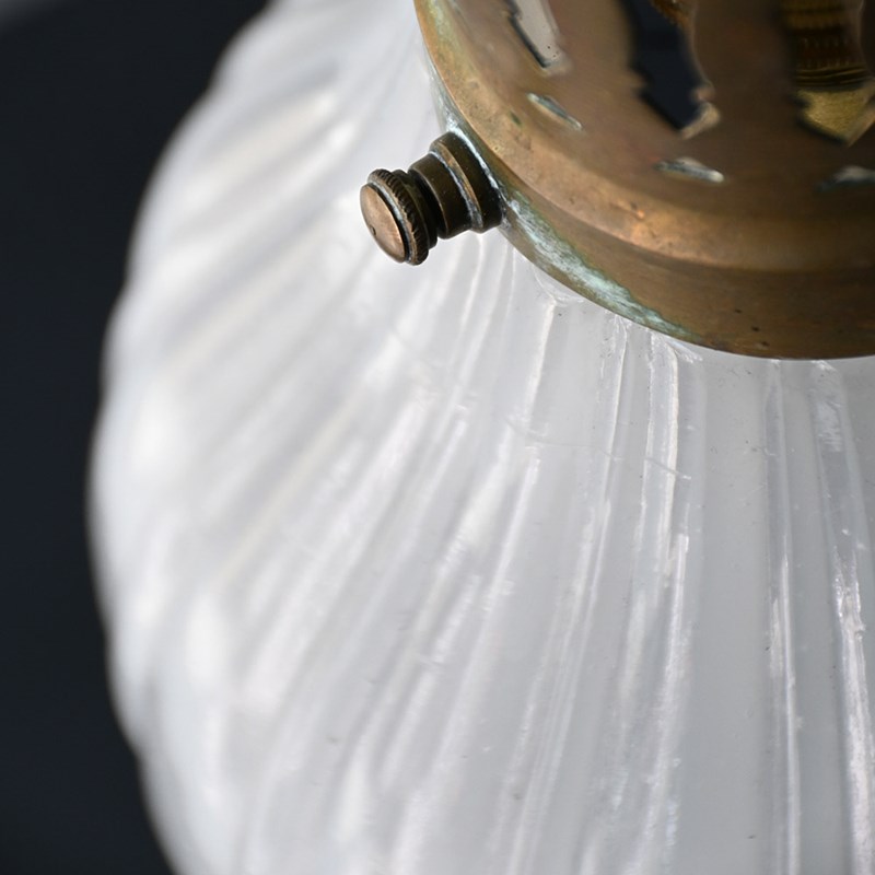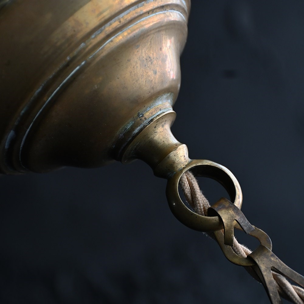 These items are completely solid in structure and form. Wear is present across all the surfaces of the brass material as shown. Re-wired to a UK 240v power source, the glass is aged well with a deep soft glow. (We would recommend a professional installing this light fitting).