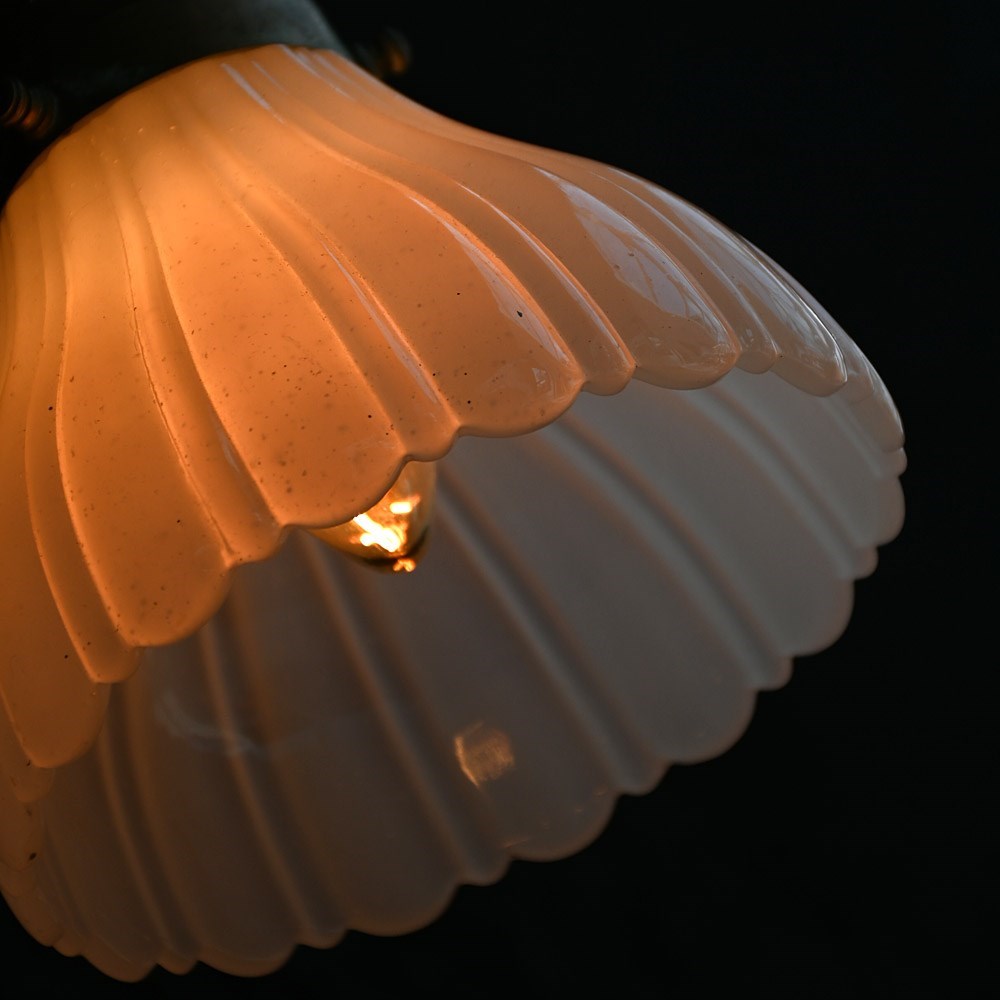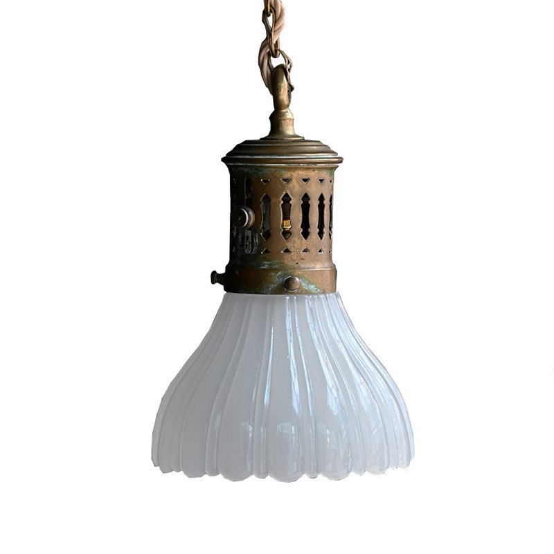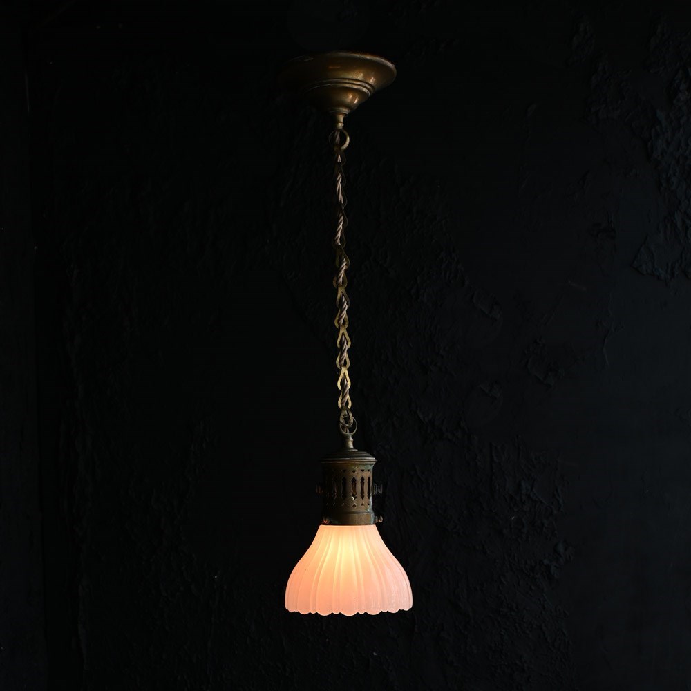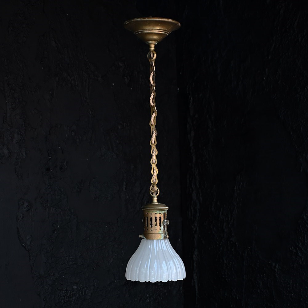 Still attached to its original brass ceiling rose and chain this diminutive milk glass light shade is rewired and ready to use. Aged well with a deep patina and highly decorative glowing visual appeal as shown in the photos provided. The dimensions below are of the ceiling rose diameter and from the top of the rose to the bottom of the glass shade.