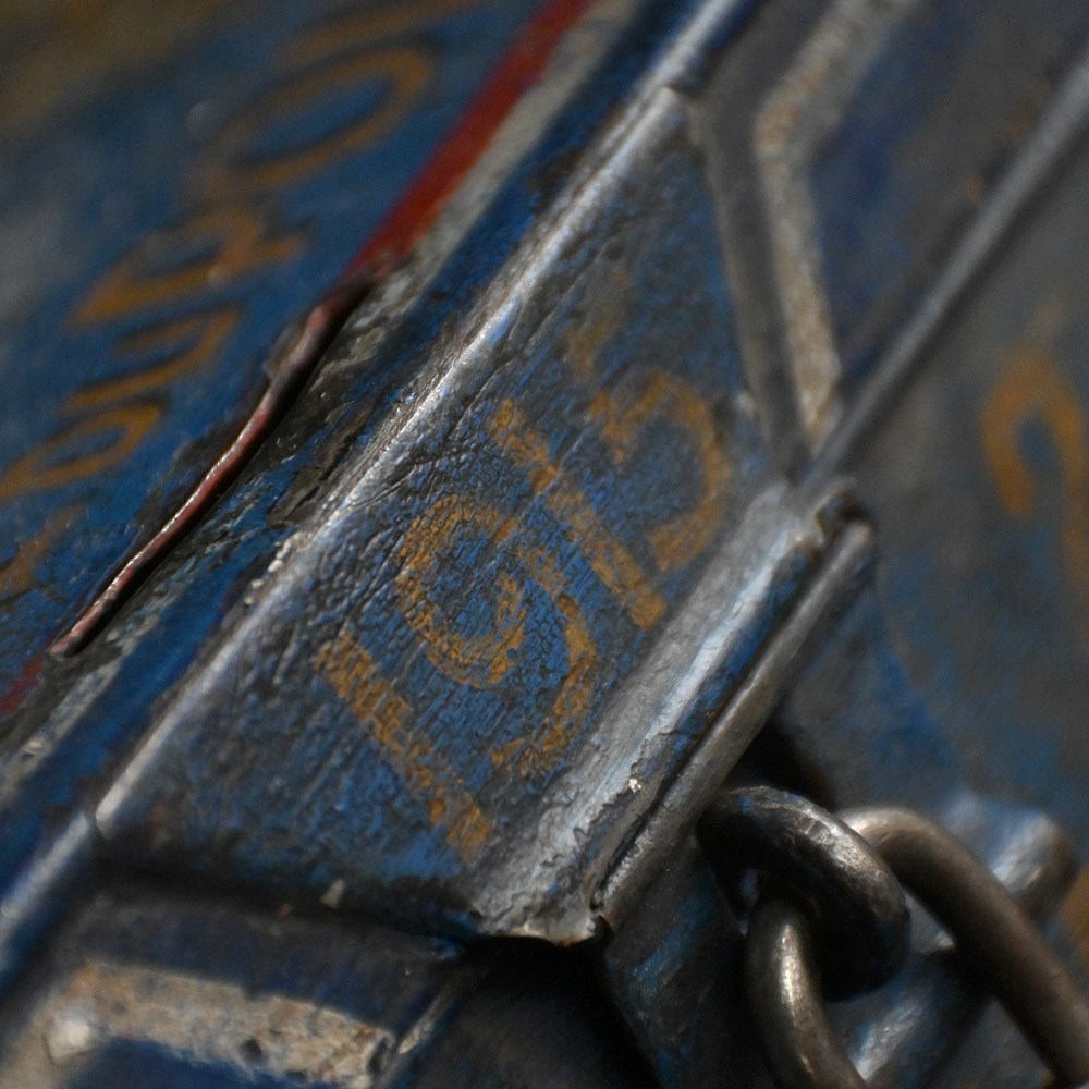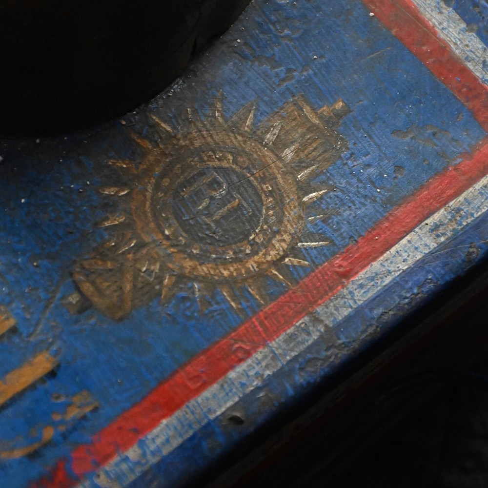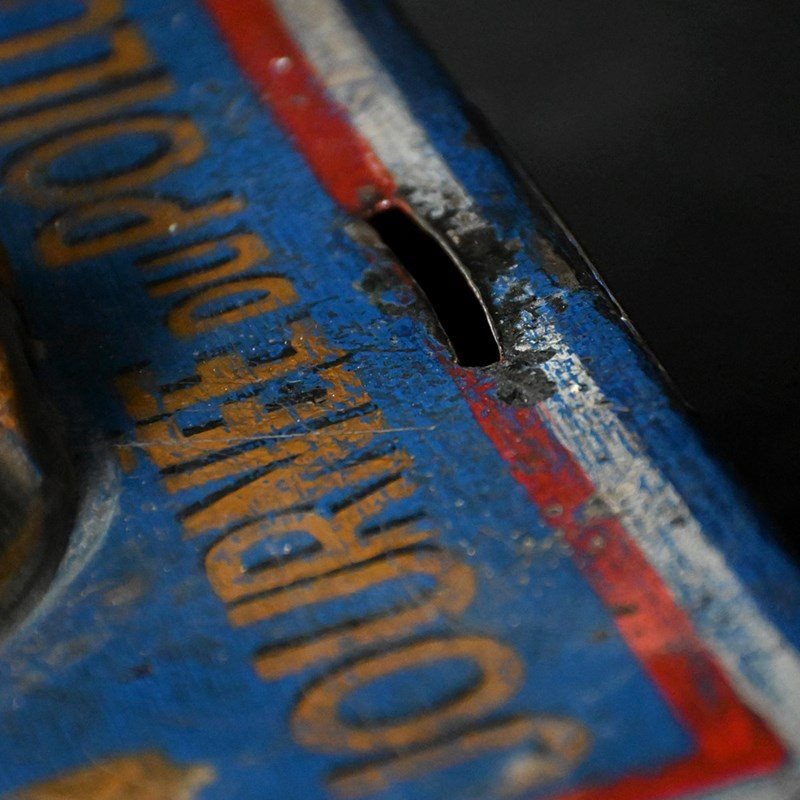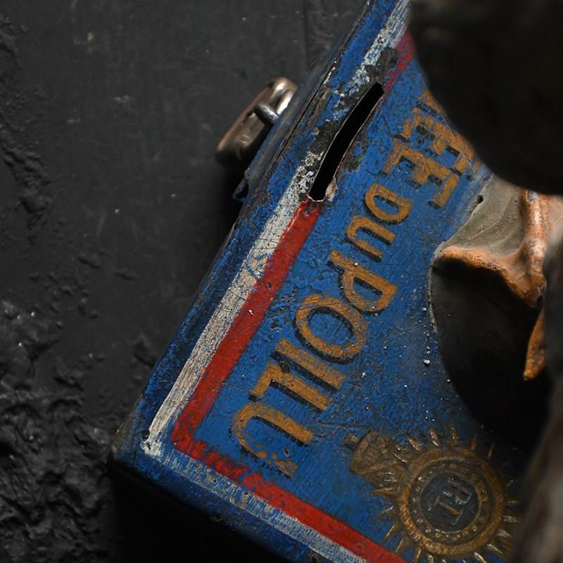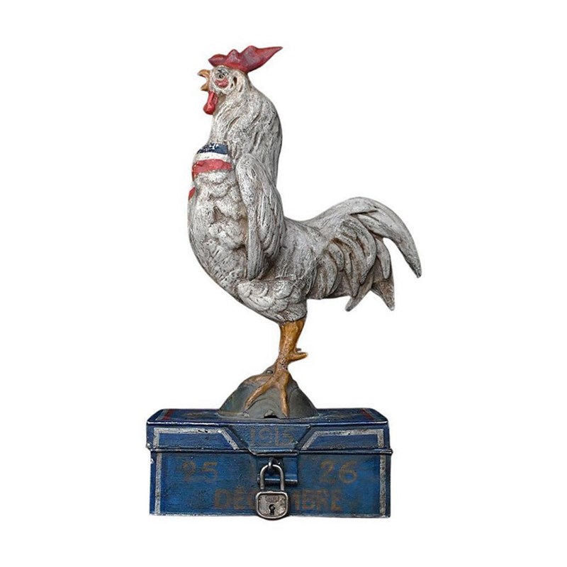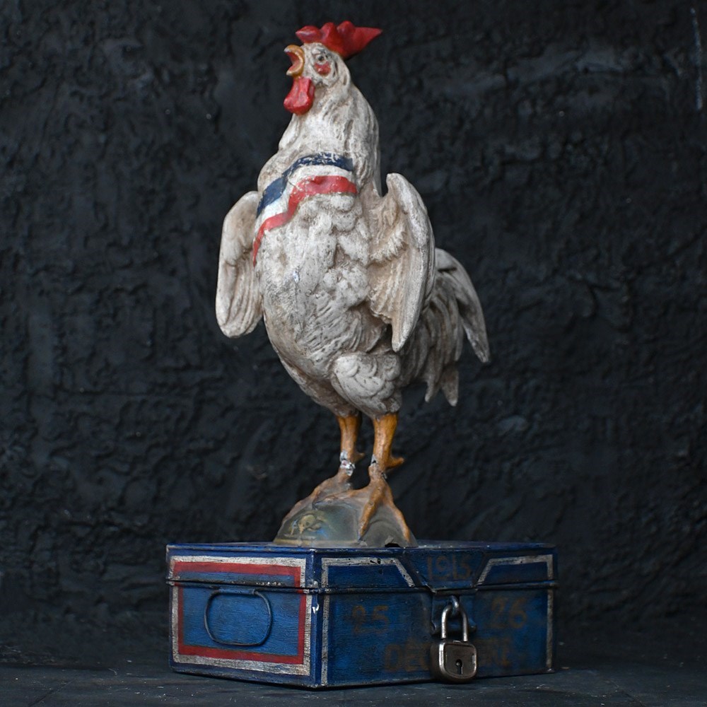 A one-off example in the form of an early 20th century hand made tin metal charity box, with hand crafted cockerel positioned centrally. Hand painted French colours and original lock still in place. This charity box would have been used to collect donations for soldier’s families left behind as the soldiers in their family went to war.