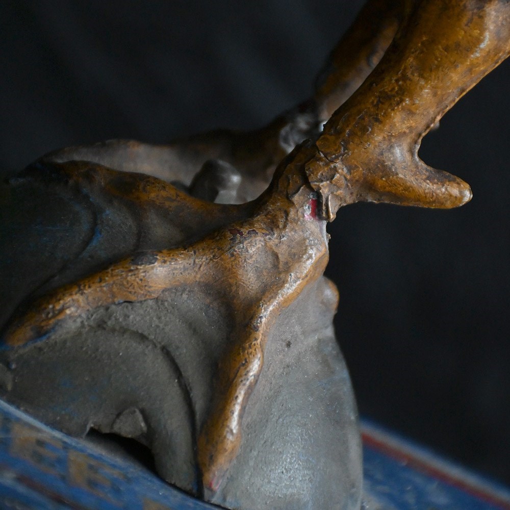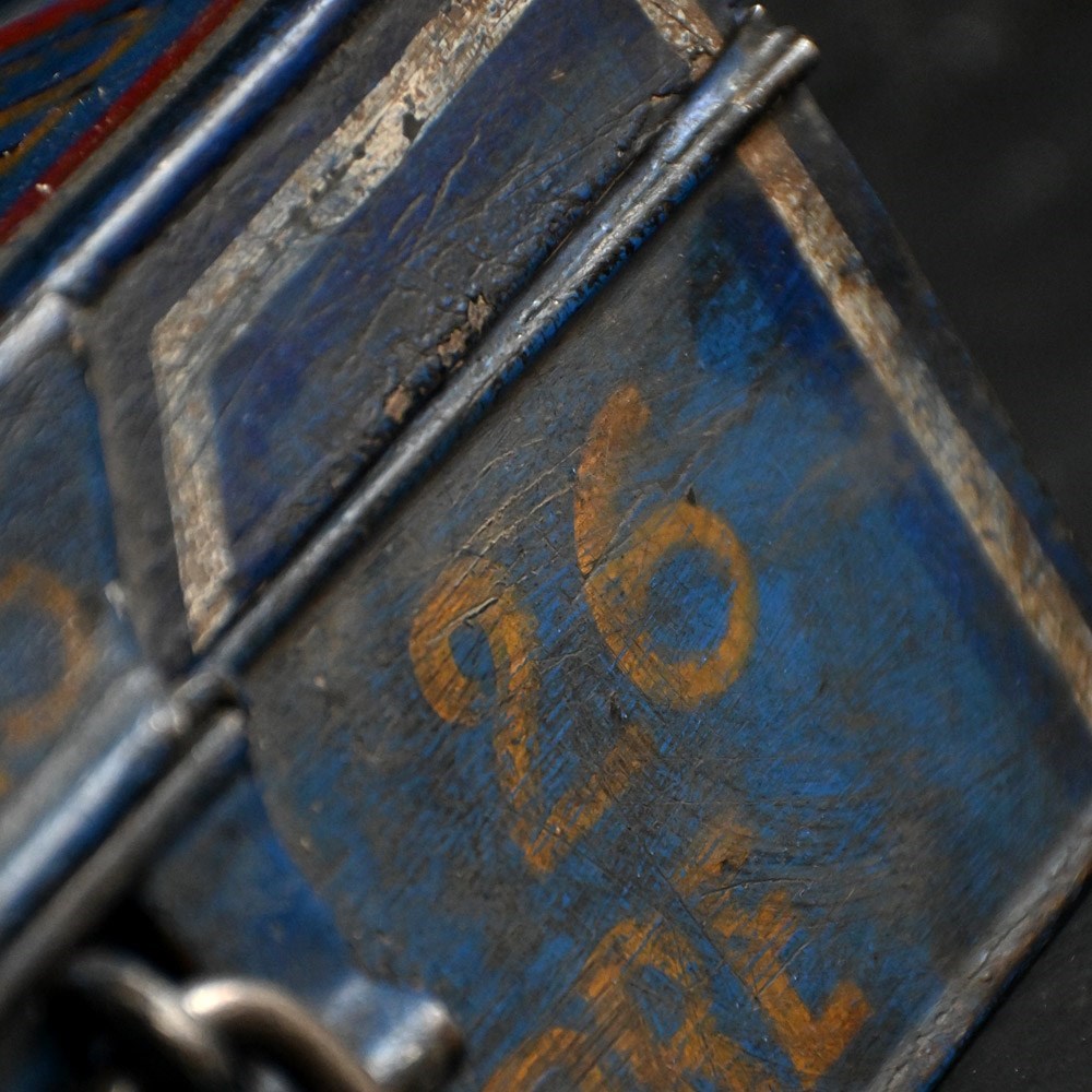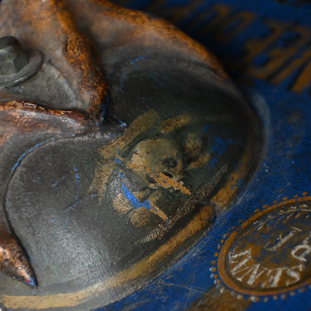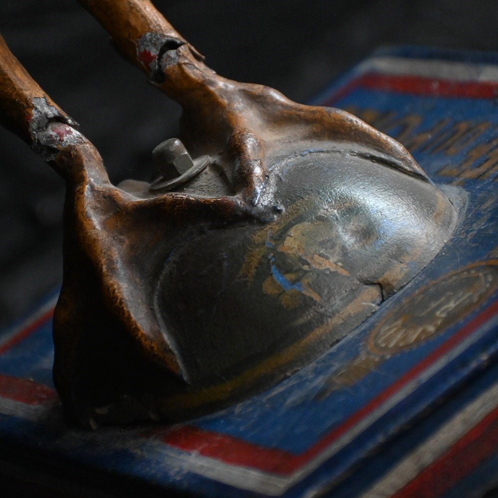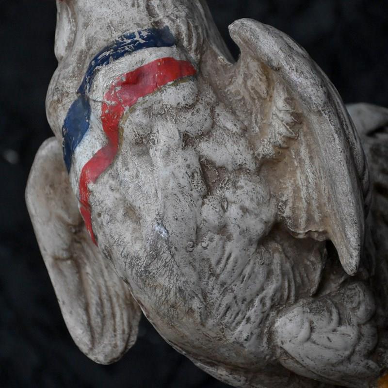 A one-off example in the form of an early 20th century hand made tin metal charity box, with hand crafted cockerel positioned centrally. Hand painted French colours and original lock still in place. This charity box would have been used to collect donations for soldier’s families left behind as the soldiers in their family went to war.