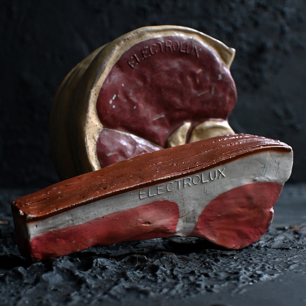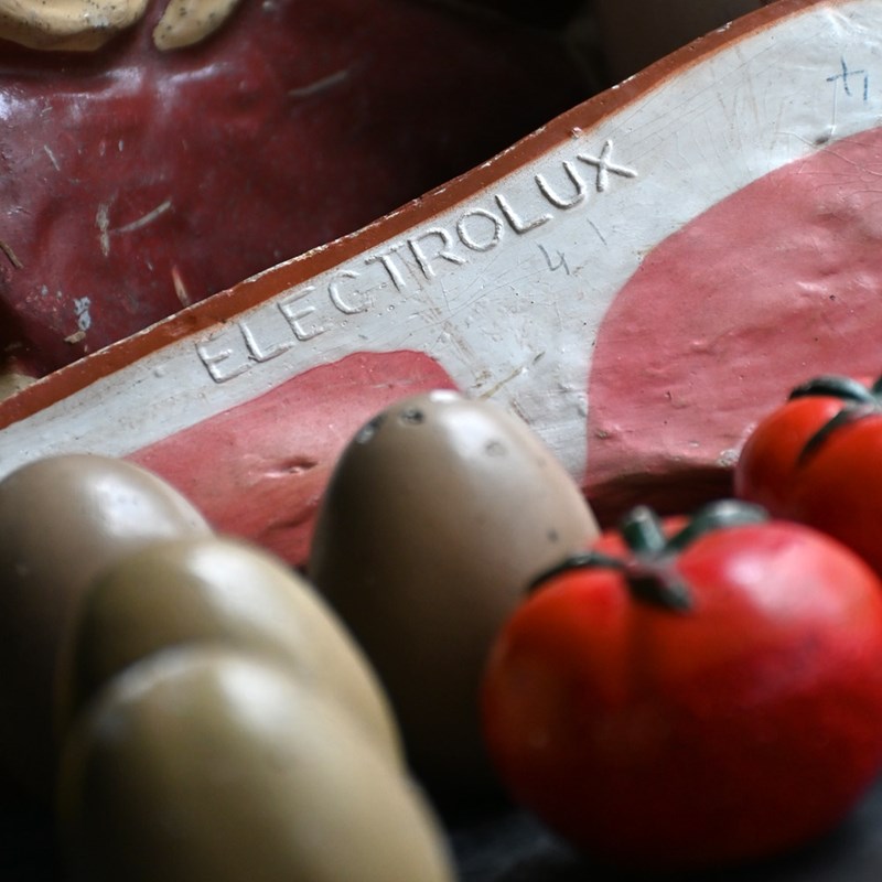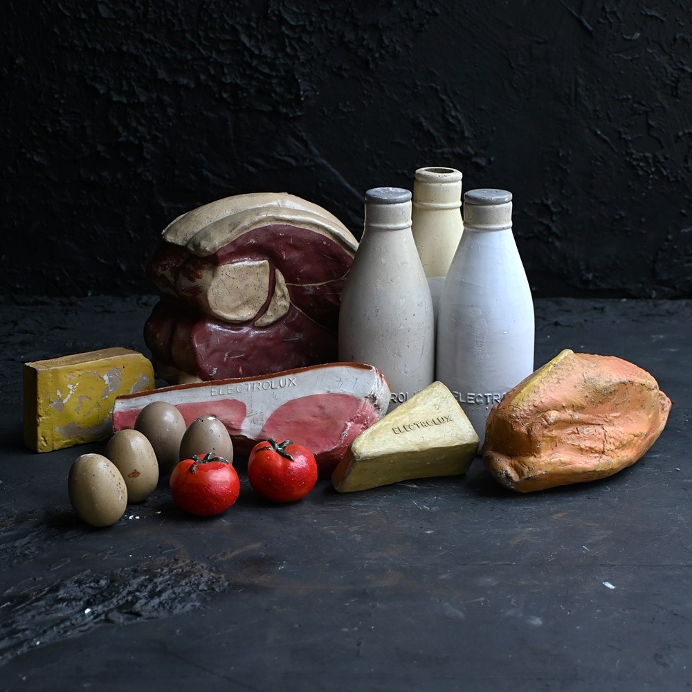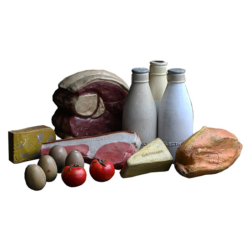 Used in the mid-20th century by Electrolux Corporation these rare survivors are in the form of hand painted hardened Ruberoid display groceries. Designed for display in point-of-sale fridges in stores and the like. Most objects shown with branded text. You just don’t see these items anymore and it’s rare to get such a complete set in original condition.