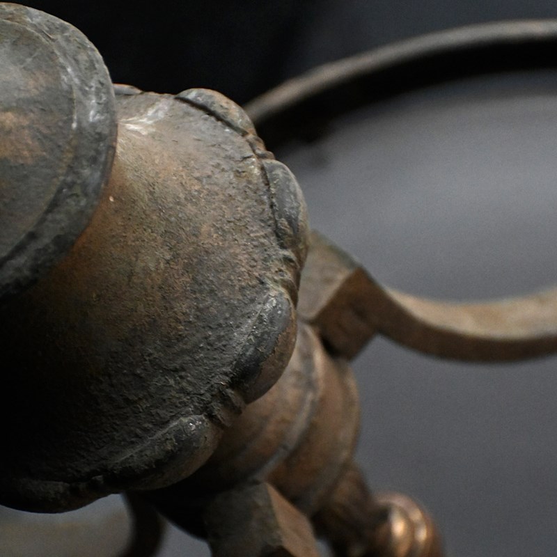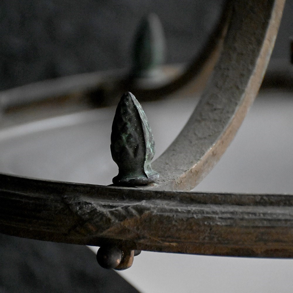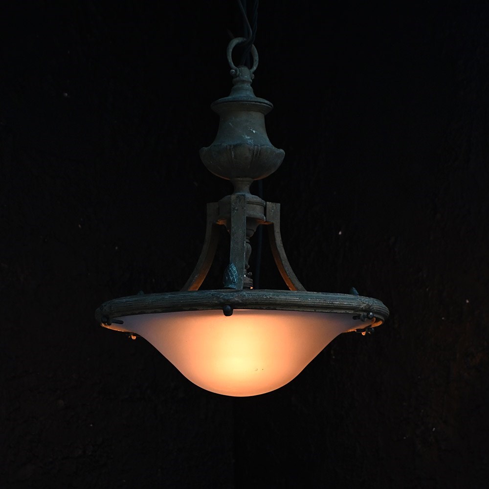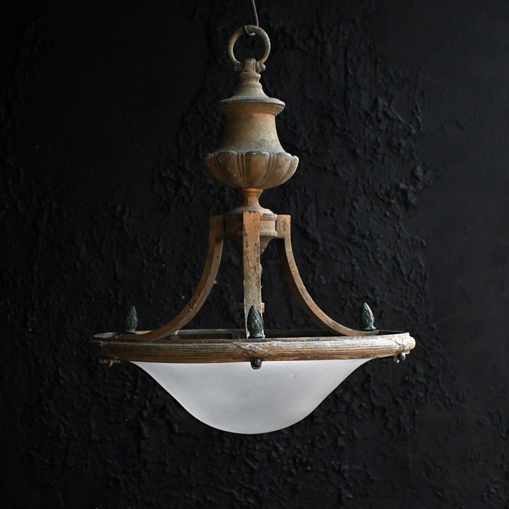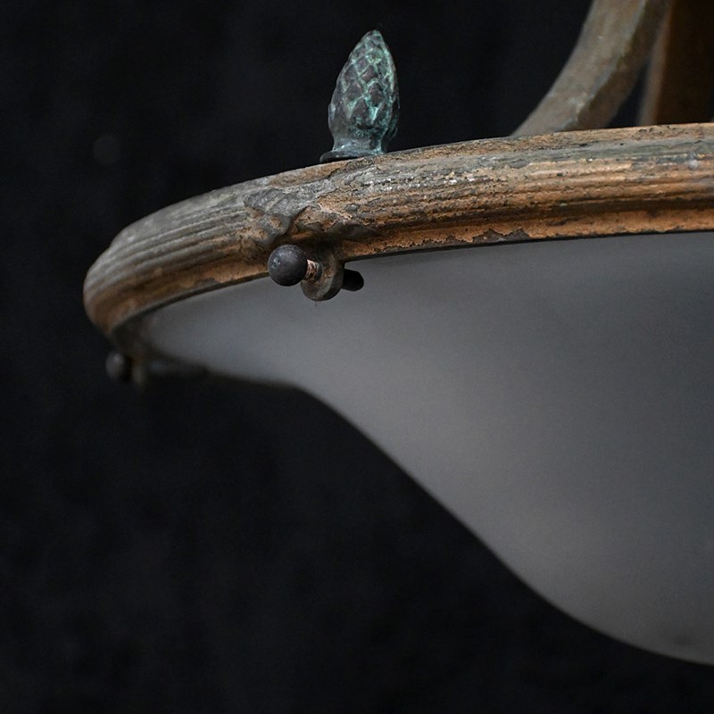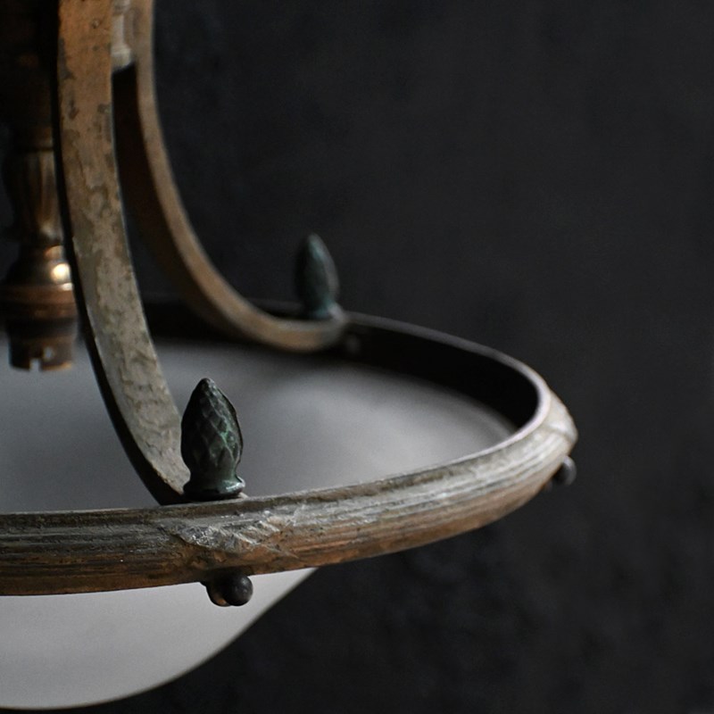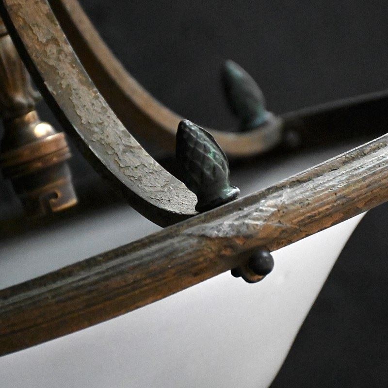 A very stylish late 19th Century English bronze ceiling light. With brass bayonet light fittings in place and black cords rewired. Ornate decorative detail including central rose shaped gallery with acorn edge finish. With original milk tone glass shade which is detachable.