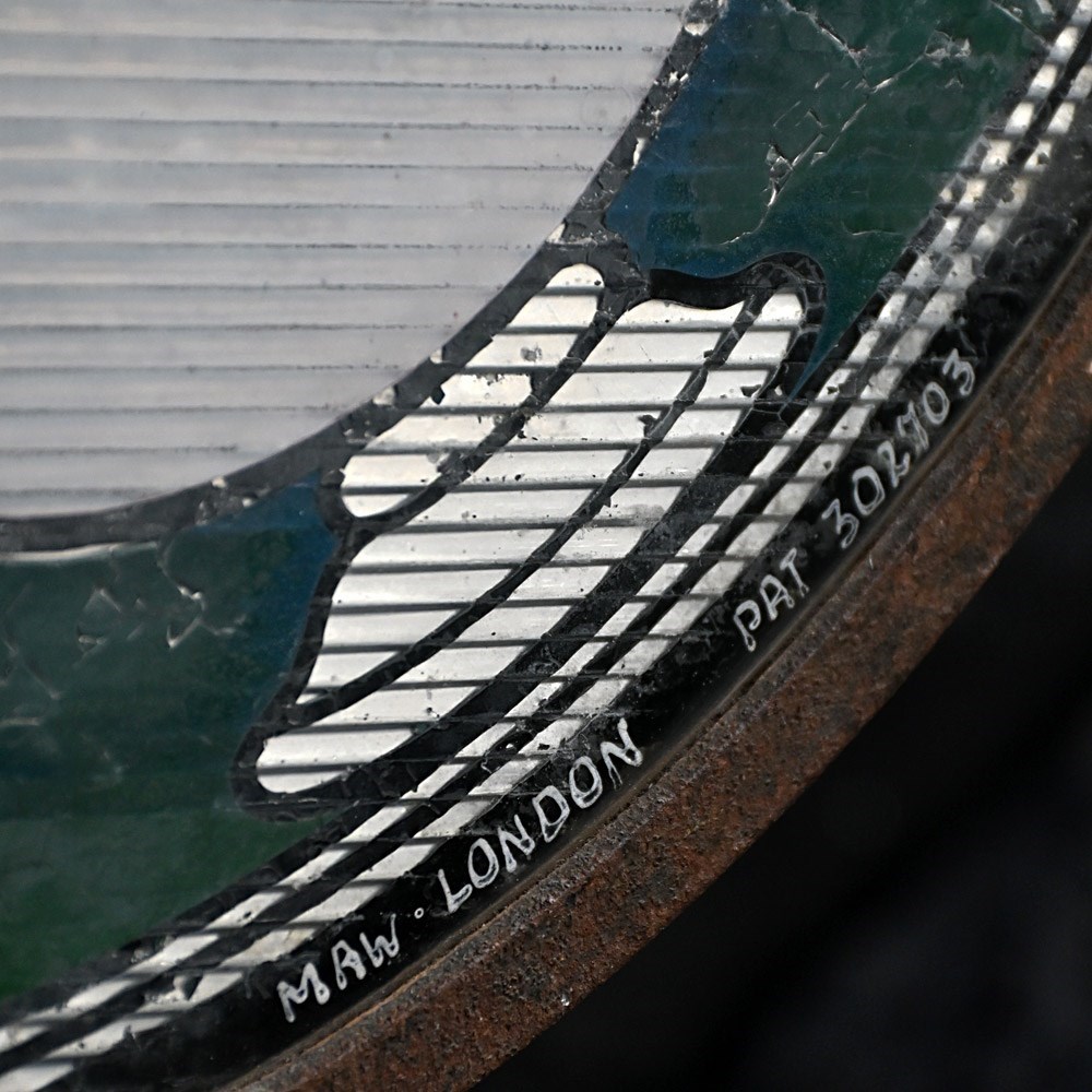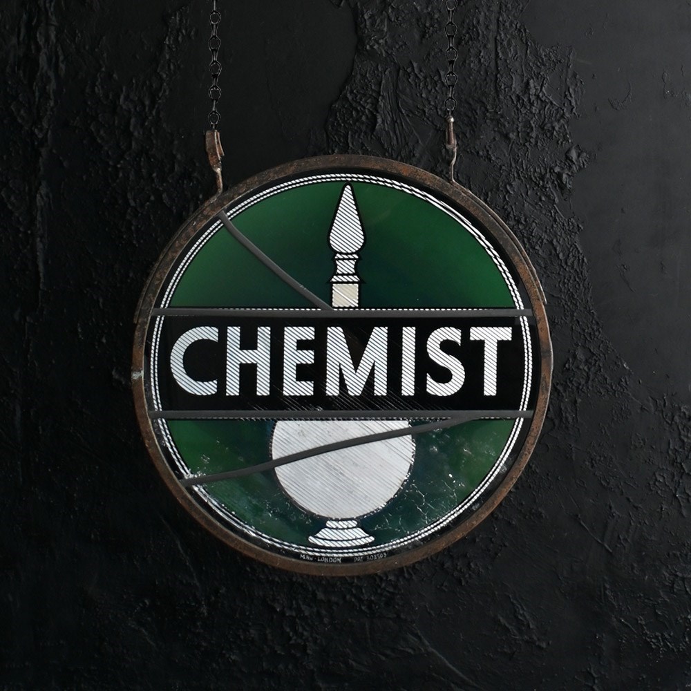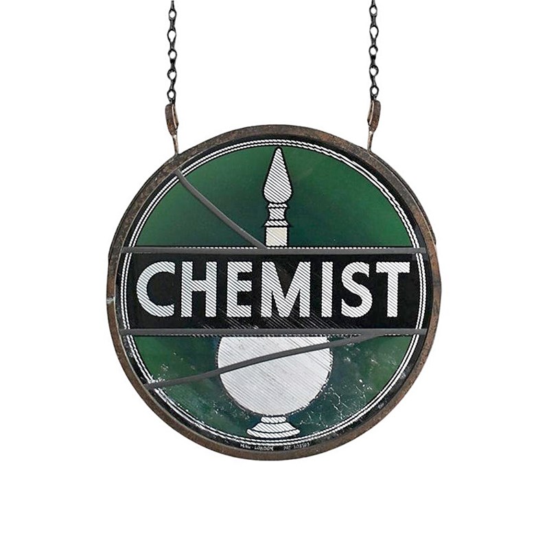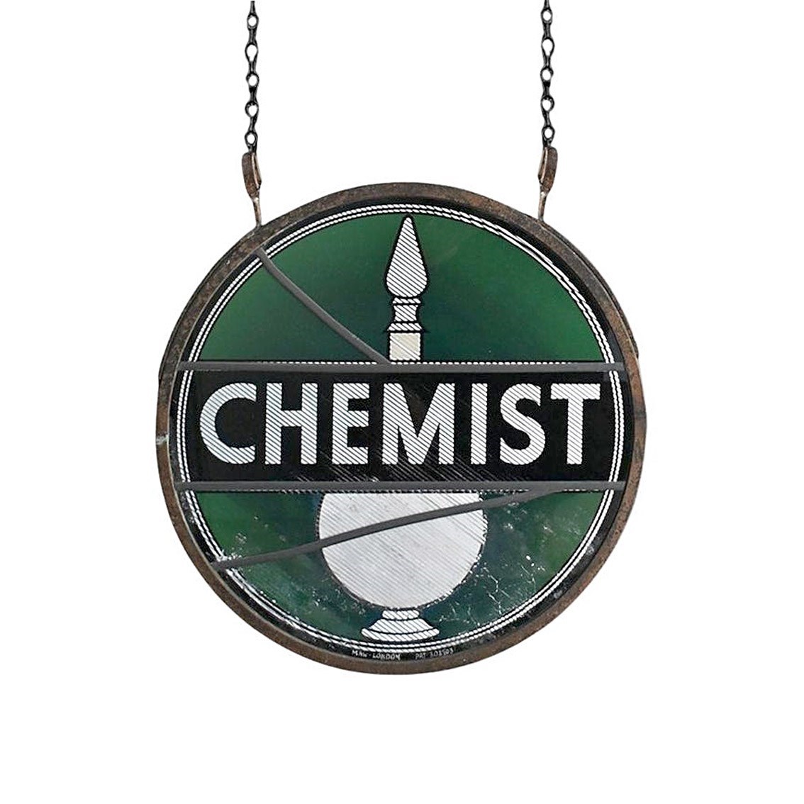 Made from double sided glass with reflective silver illuminated text, this early 20th century example of an English chemist trade sign would have hung outside a pharmacist for most of its life. Framed with a cast metal support and hanging hooks as shown. The sign has had some restoration lead supports added a while ago, but overall, in completely original condition as shown and firm in form. Signed MAW London PAT 302703 at the base of the graphic.