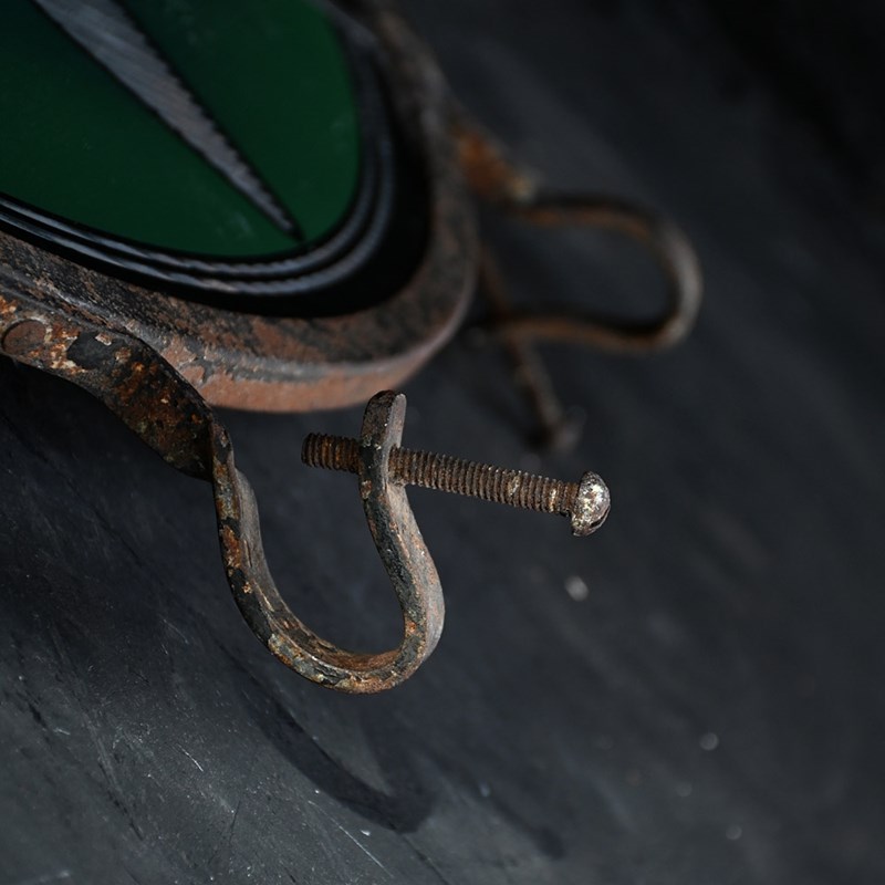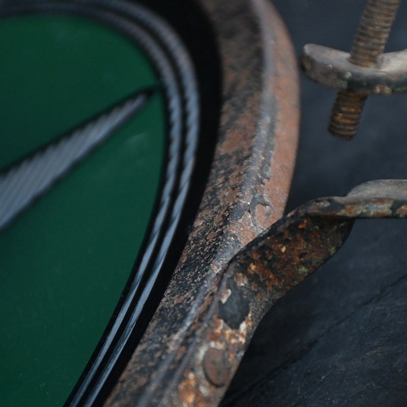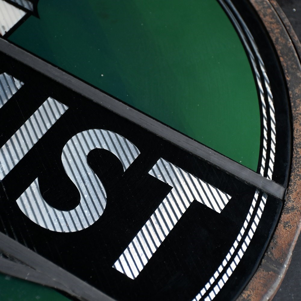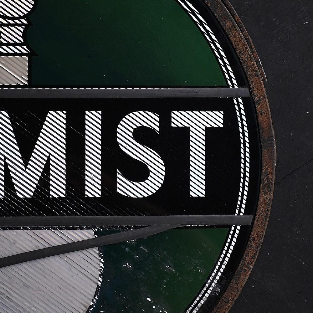 Made from double sided glass with reflective silver illuminated text, this early 20th century example of an English chemist trade sign would have hung outside a pharmacist for most of its life. Framed with a cast metal support and hanging hooks as shown. The sign has had some restoration lead supports added a while ago, but overall, in completely original condition as shown and firm in form. Signed MAW London PAT 302703 at the base of the graphic.