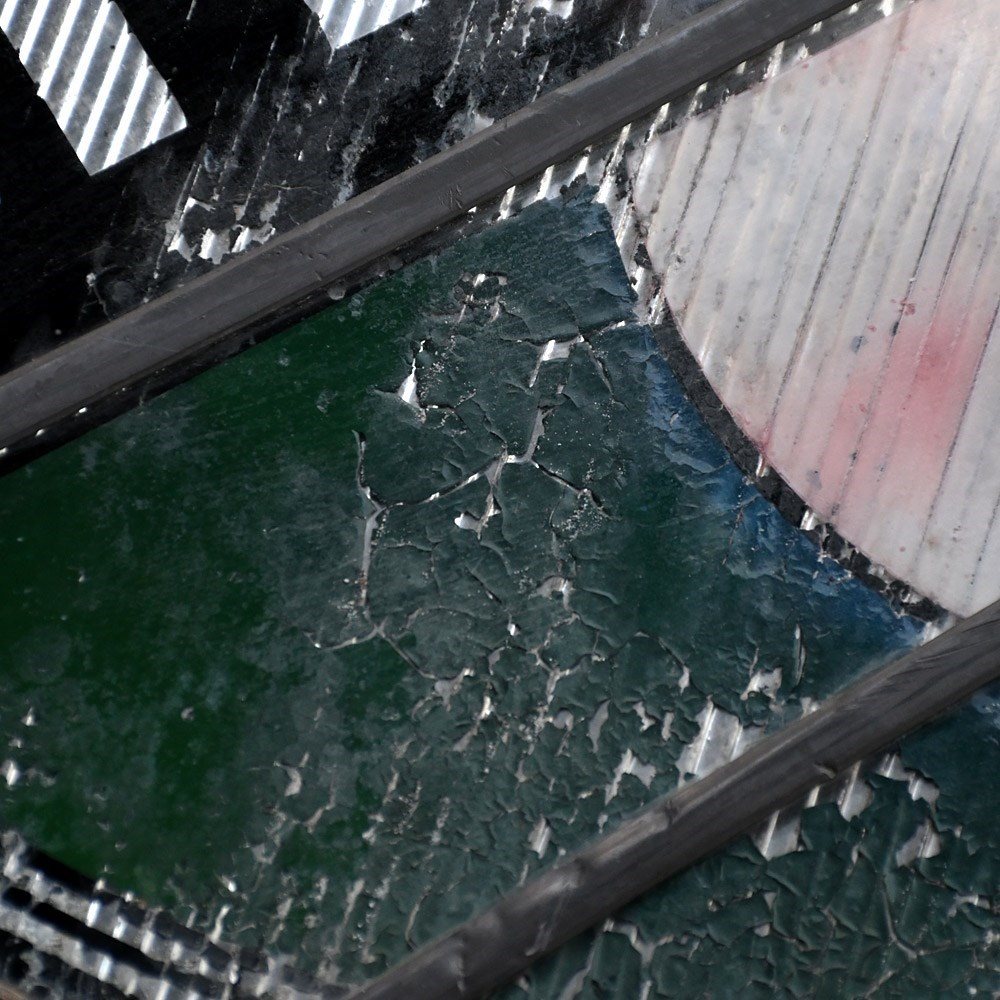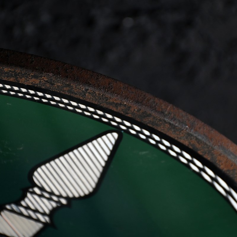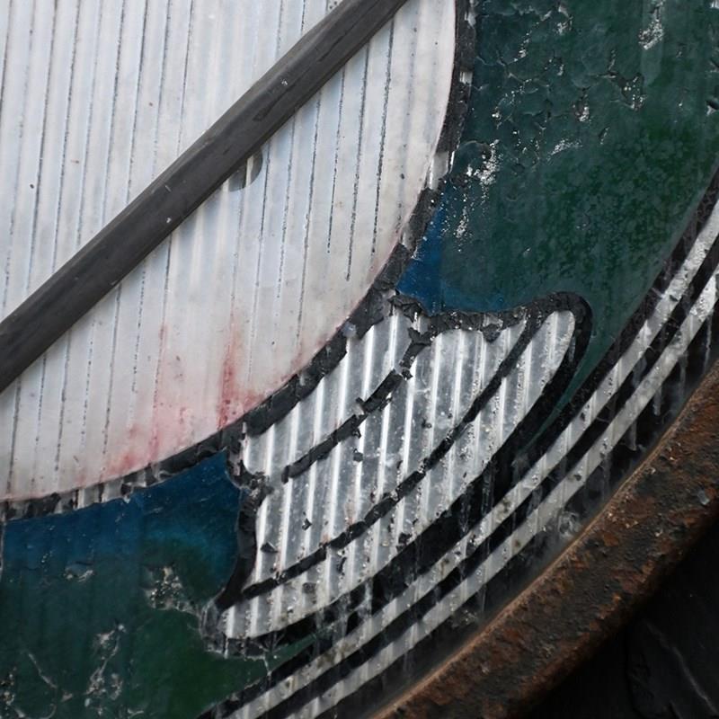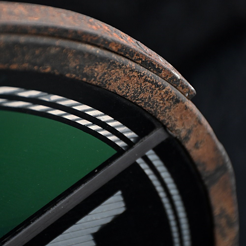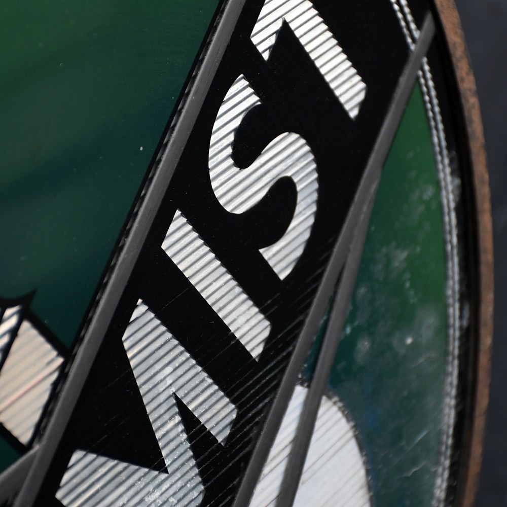 With natural wear and tear due being hung outside all its life this item has wear in the form of crackled paint on one side more than the other as shown. The metal areas show rust, with 2 lead repair strips across the glass graphic which is solid in form. The hanging chains are not part of the sale.