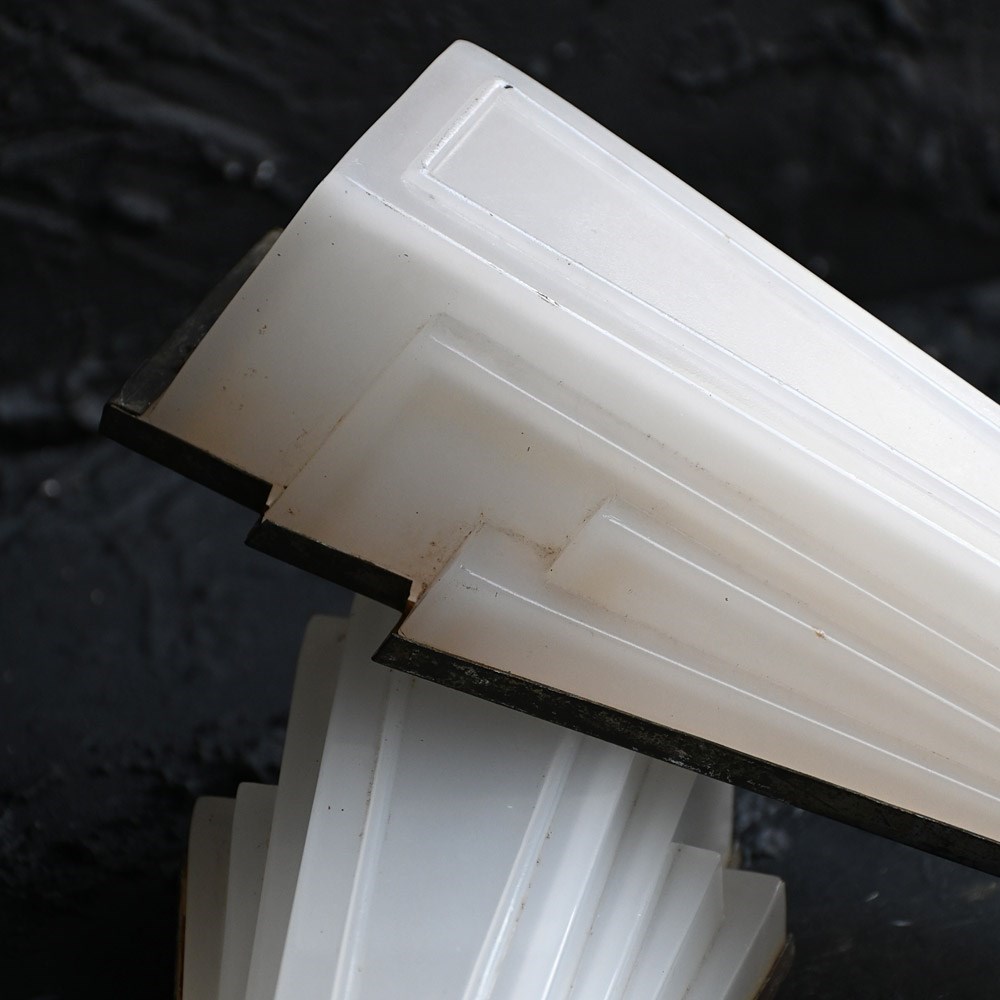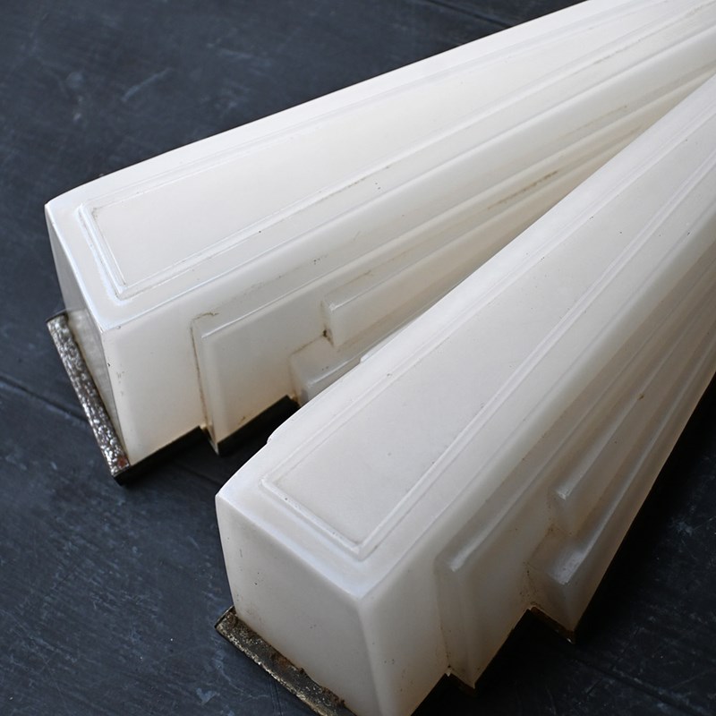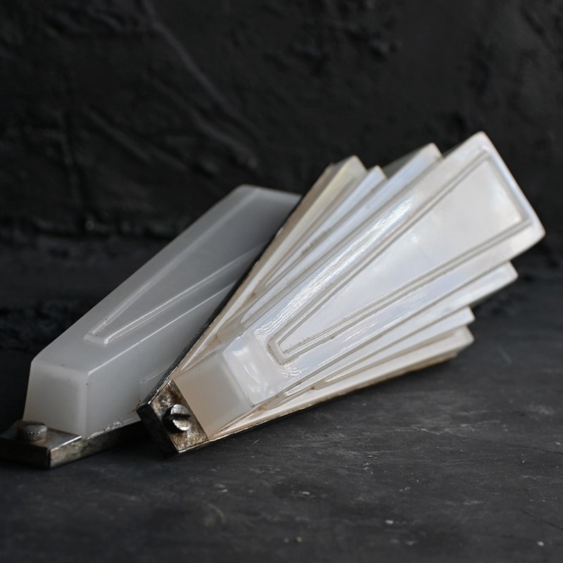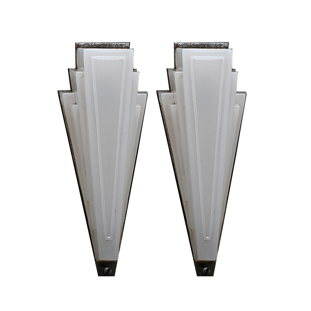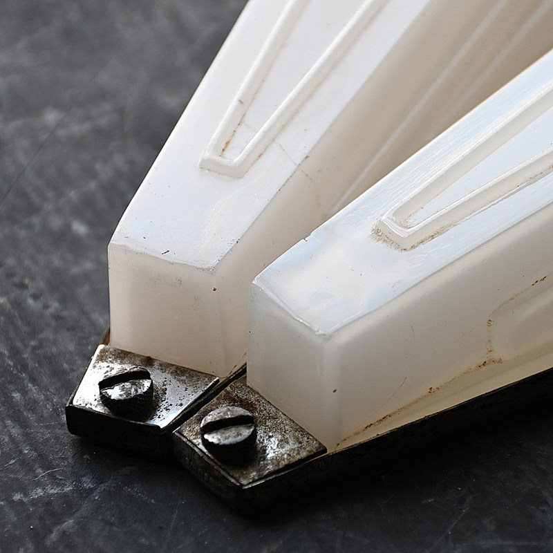 An amazing untouched, matched pair of art deco glass opaline English cinema wall lights. With original nickel plated back sections for mounting. These lights are unwired but can easily be adapted to suit your needs by a professional electrician once in situ.