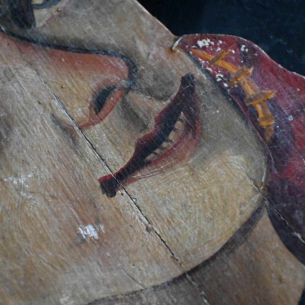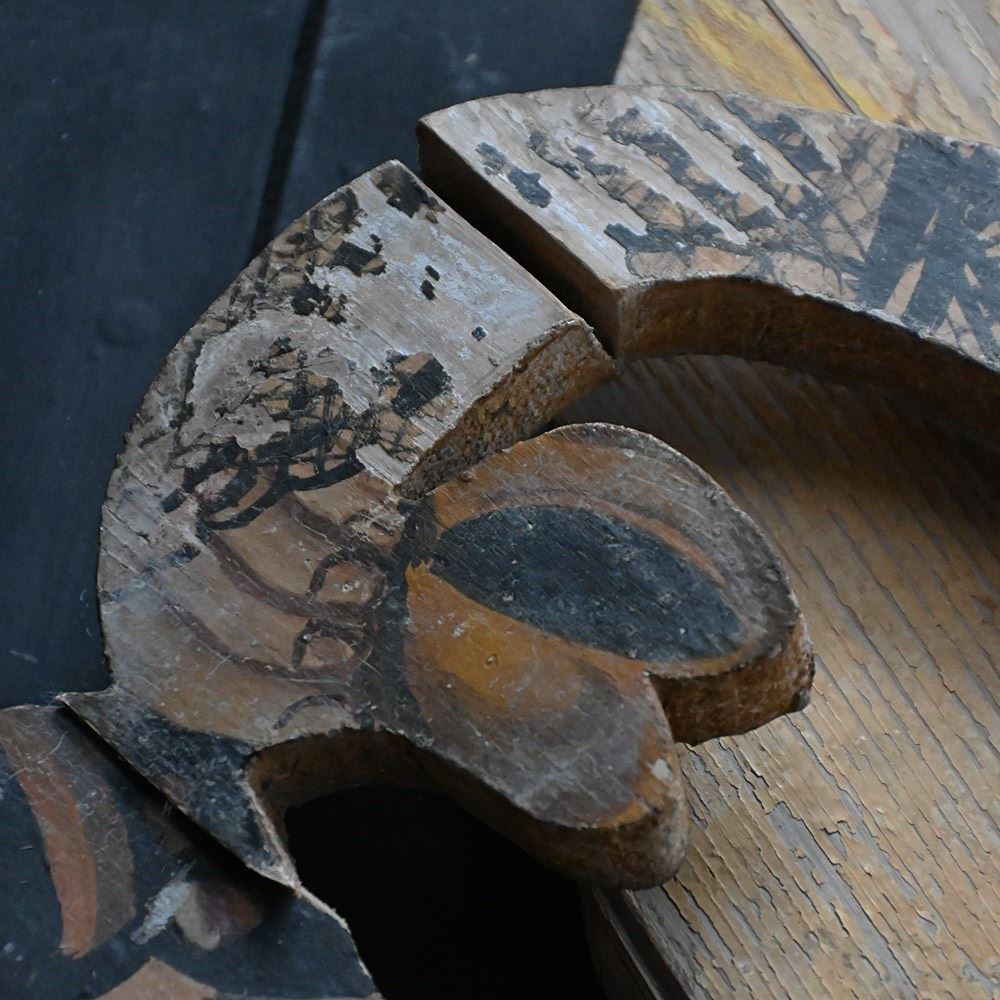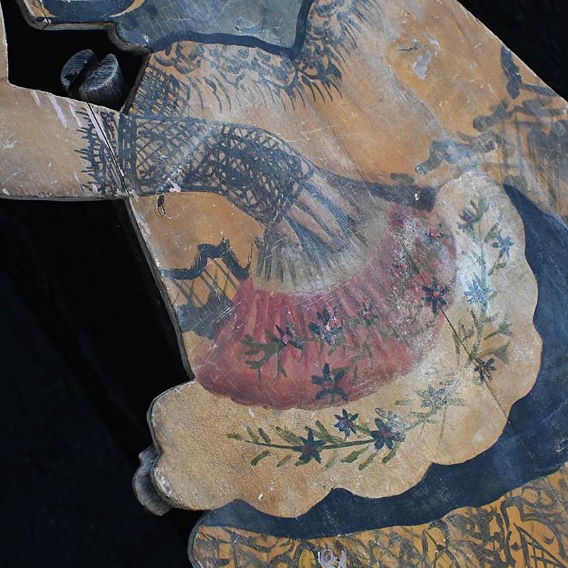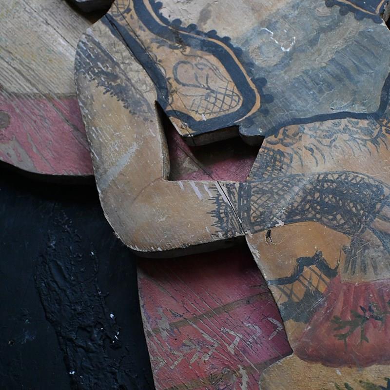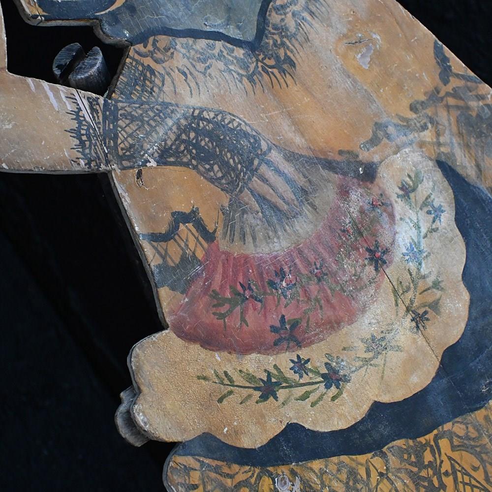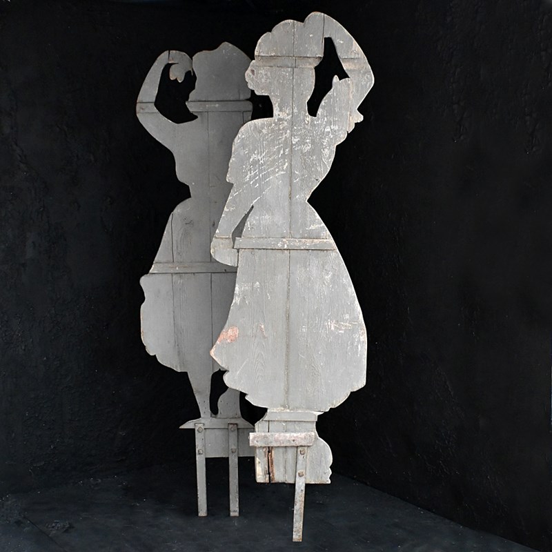 An unusual hand-crafted pair of pine fairground display figures. Hand painted detail with cast metal support base brackets still in place. We assume these figures would have been attached to a moving amusement of sorts.